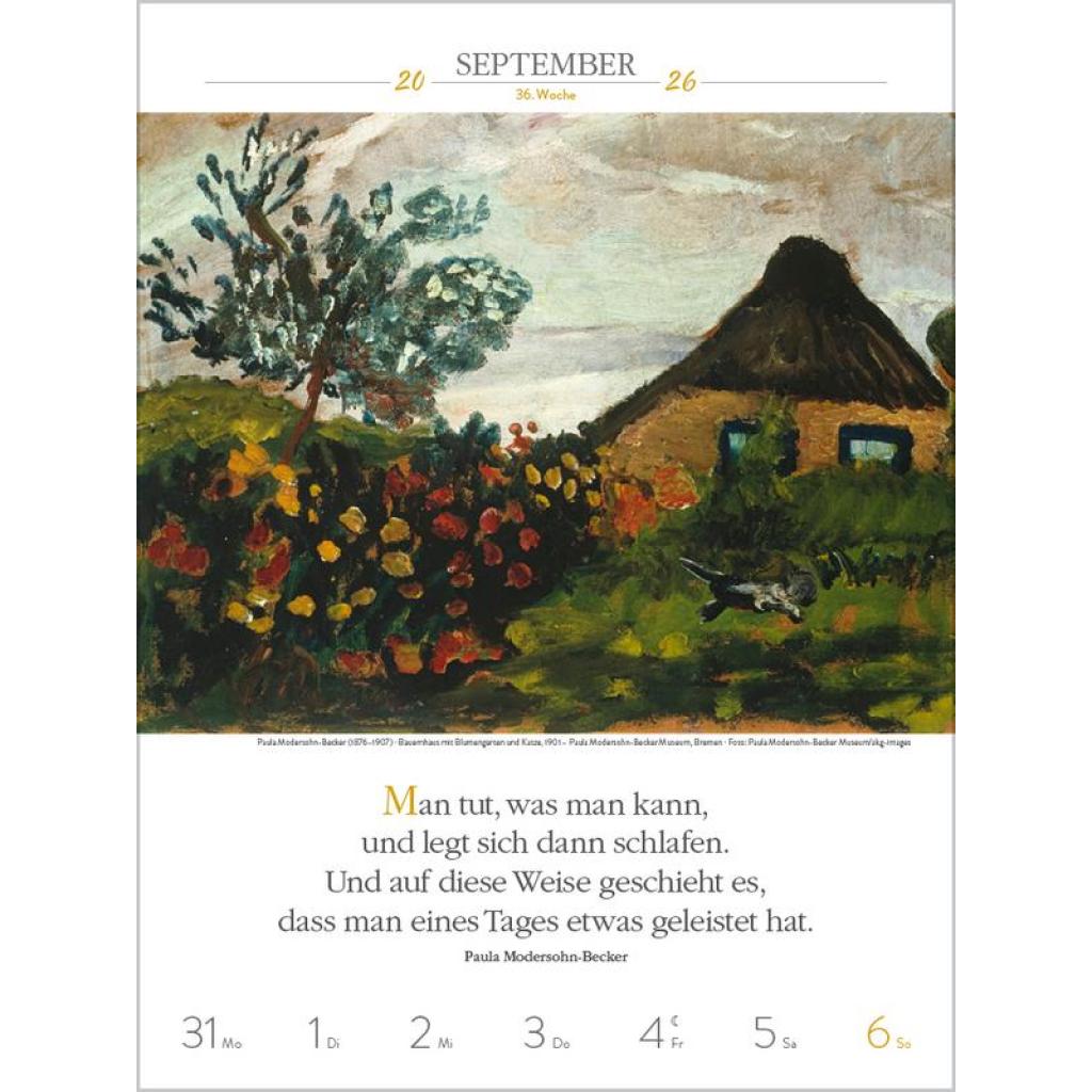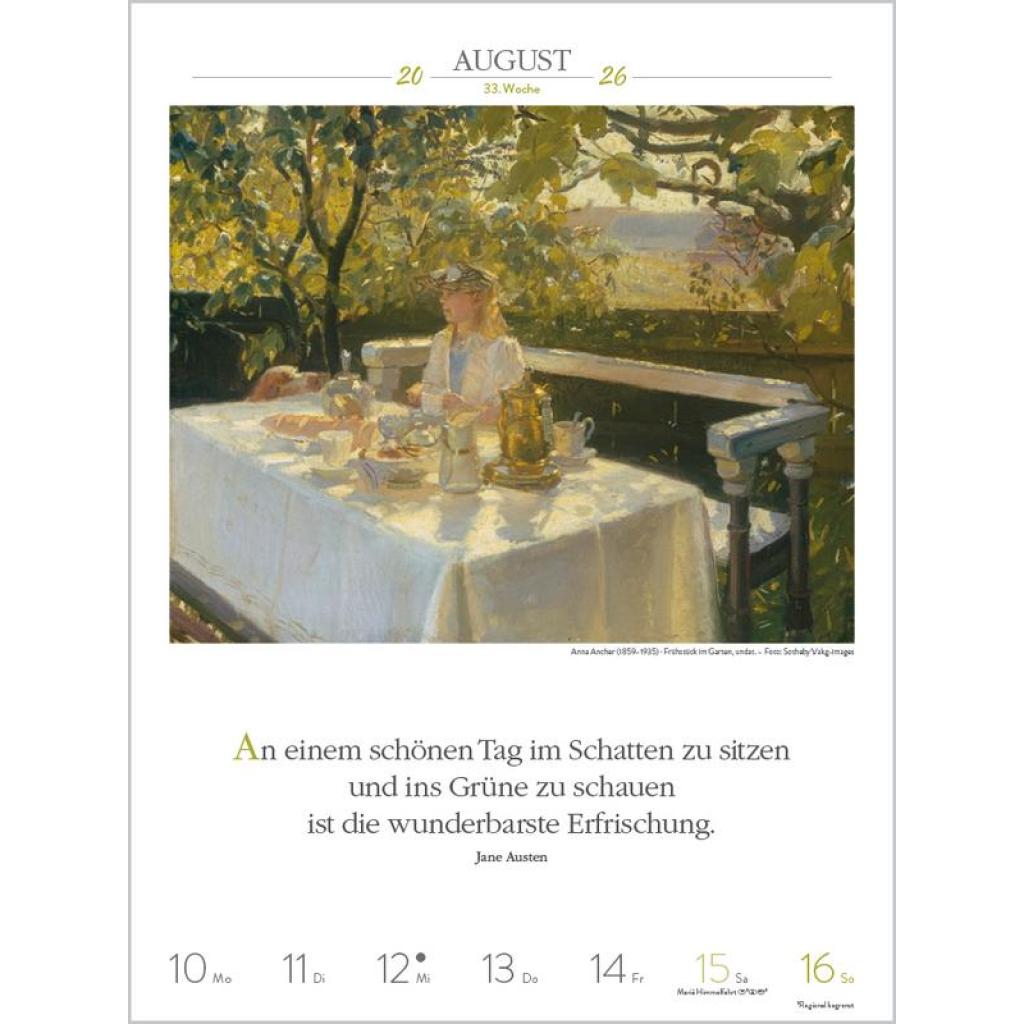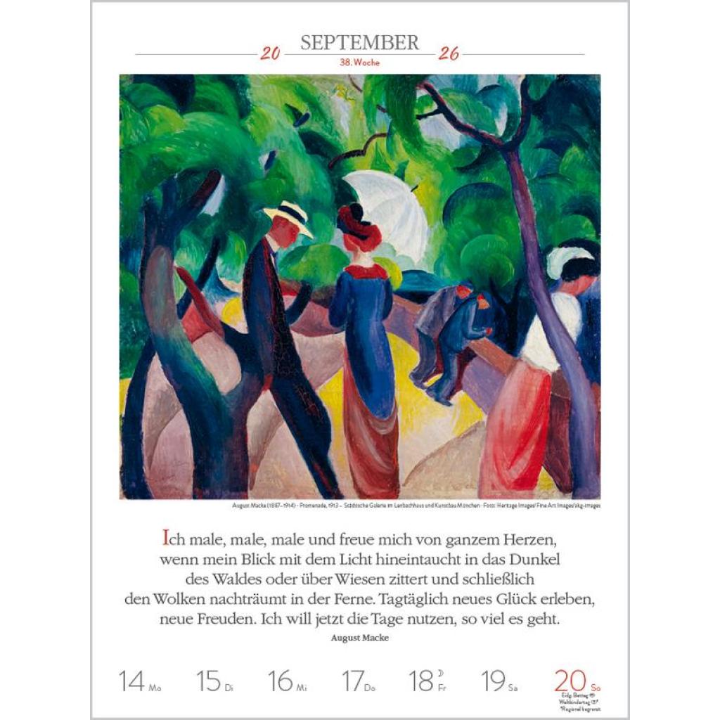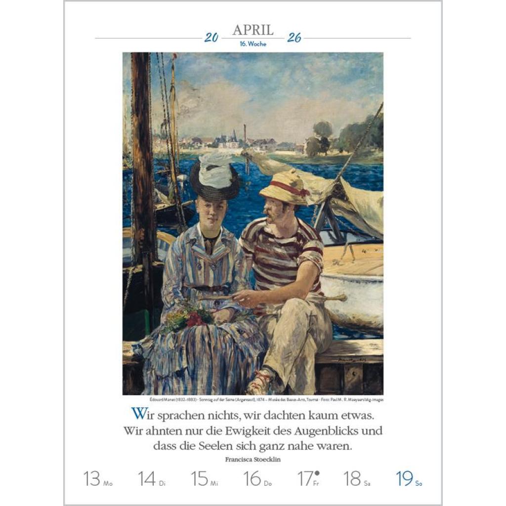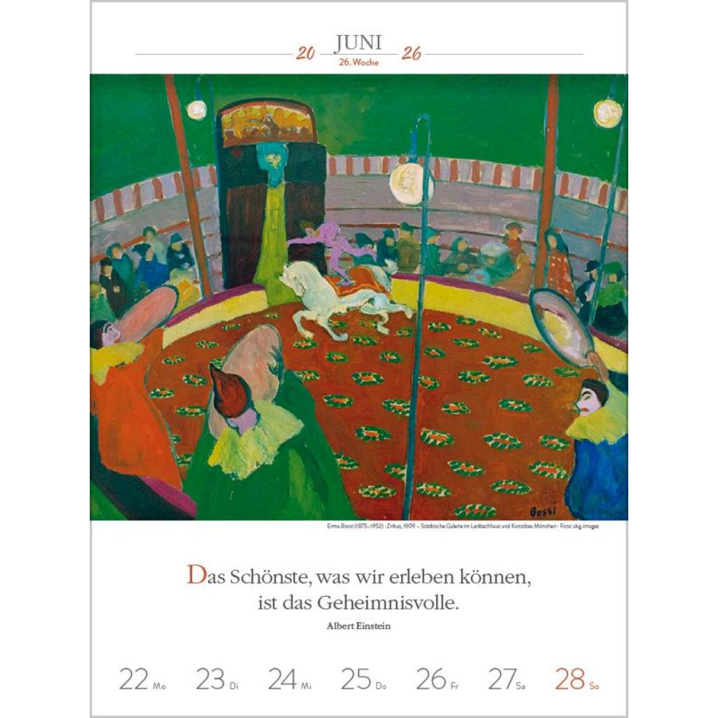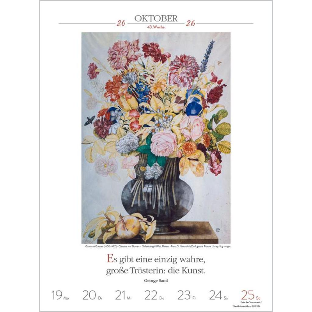 Produktmerkmale ¿ Format: 24 x 32 cm; Literatur-Wochenkalender mit 53 einzigartigen Bildern und Zitaten ¿ Kalendarium auf Deutsch mit hervorgehobenen Sonn- und Feiertagen für D, A und CH ¿ Gedruckt auf umweltfreundlichem FSC Papier 53 Meisterwerke und inspirierende literarische Zitate präsentieren den faszinierenden Kosmos der Kunst von seiner schönsten Seite. Klimaneutral hergestellt auf nachhaltig produziertem Papier.