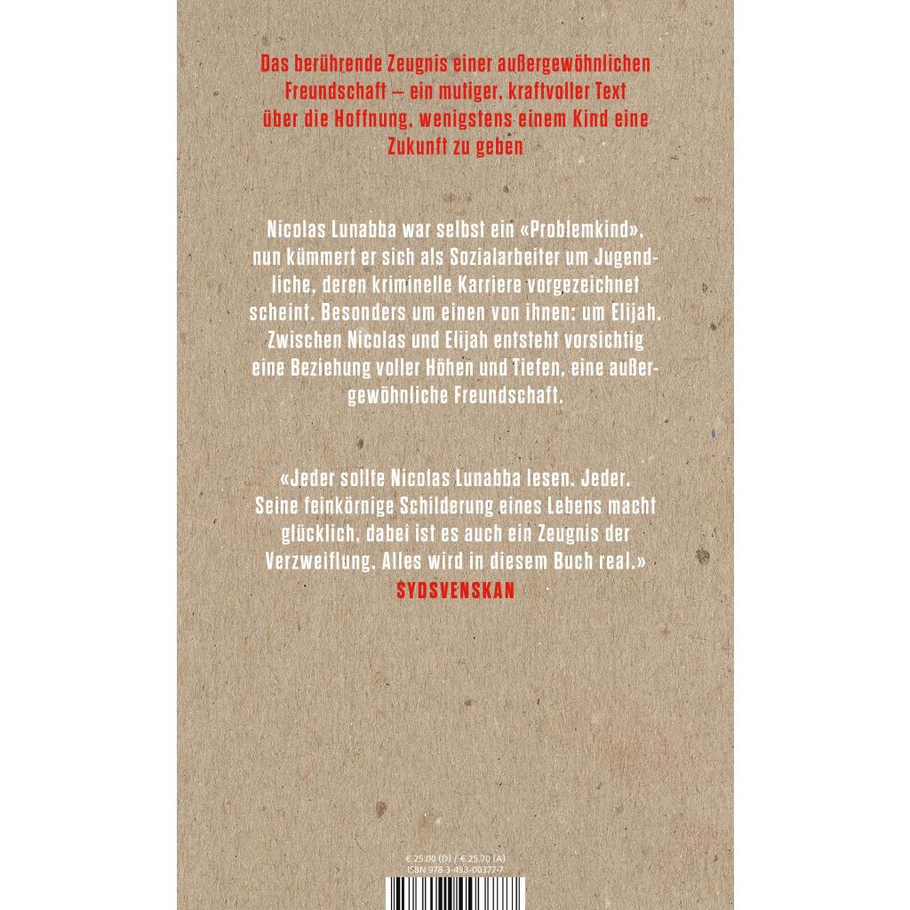 Das berührende Zeugnis einer außergewöhnlichen Freundschaft - ein mutiger, kraftvoller Text über die Hoffnung, wenigstens einem Kind eine Zukunft zu geben Nicolas Lunabba war selbst ein «Problemkind», nun kümmert er sich als Sozialarbeiter um Jugendliche, deren kriminelle Karriere vorgezeichnet scheint. Nur zu gut kennt er die Gewalt, die Wut. Seine Erfahrungen lassen ihn Zugang finden zu ihnen, besonders zu einem Jungen: Elijah. Aber Nicolas wird nicht alle retten können, vielleicht sogar keinen. Er muss sich abgrenzen, um nicht zu zerbrechen. Doch er wagt es, Elijah bei sich aufzunehmen, an Elijah zu glauben. Einfühlsam und ehrlich beschreibt Nicolas Lunabba, wie sich zwischen den beiden vorsichtig eine Beziehung voller Höhen und Tiefen entwickelt, wie Elijah Vertrauen zu Nicolas fasst und umgekehrt. Nicolas Lunabbas literarisches Memoir ist ein wichtiger, hoch emotionaler Text über eine auseinanderdriftende Gesellschaft, über die Verletzlichkeit von Jungen und Männern, über strukturellen Rassismus und Klassismus.