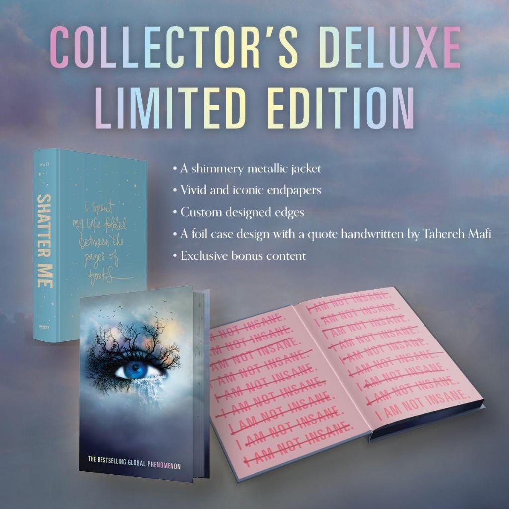 The gripping first installment in #1 New York Times bestselling author Tahereh Mafi’s epic, romantic Shatter Me series is now available in this stunning COLLECTOR'S DELUXE LIMITED EDITION while supplies last . Featuring a gorgeous hardcover package with: The first three chapters of Watch Me , the exhilarating first book in a new series in the Shatter Me universe, exclusive to this deluxe edition A shimmery metallic jacket Vivid and iconic endpapers Custom designed edges Foil case design with a handwritten quote from the author This is a true collector’s edition available only on a limited first print run—so be sure to order your copy now! No one knows why Juliette’s touch is fatal, but The Reestablishment has plans for her. Plans to use her as a weapon. But Juliette has plans of her own. After a lifetime without freedom, she’s finally discovering a strength to fight back for the very first time—and to find a future with the one boy she thought she’d lost forever. In the electrifying first book in the Shatter Me series, #1 bestselling author Tahereh Mafi has crafted an international phenomenon that has enchanted millions of readers around the globe. Lose yourself in a riveting dystopian landscape, a thrilling superhero story, and the journey of an unforgettable heroine who reminds us to hold on to our humanity even in a broken world.