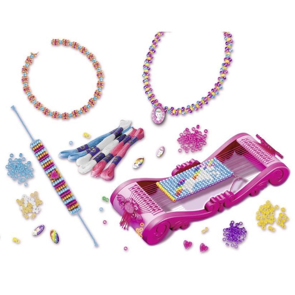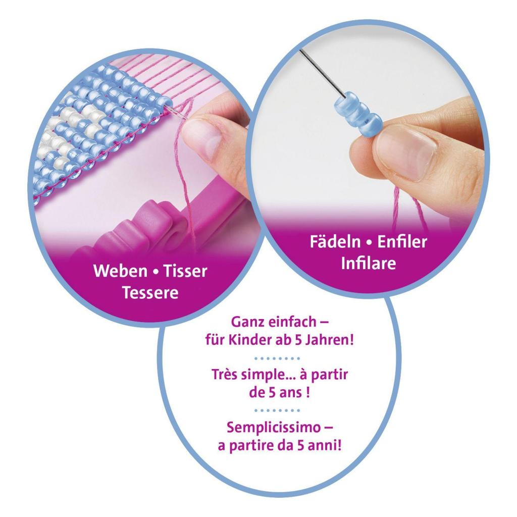 "Magischer Perlenzauber" von Ravensburger überzeugt mit einem umfangreichen Paket, um Schmuckstücke in Handarbeit herzustellen. Die 1.250 Perlen in unterschiedlichen Farben, eine stumpfe Nadel und 48 m Stickgarn in den Farben Rosa, Türkis und Weiß sorgen dafür, dass am mitgelieferten Webrahmen eine Vielzahl von Schmuckstücken entsteht. Dank der einfachen und ausführlichen Anleitung gelingt es schon Mädchen ab 5 Jahren, sich so als Schmuck-Designerin zu versuchen und für Freundinnen oder die Mama kleine Geschenke herzustellen. Das einfache Webprinzip eignet sich besonders für Kinder, die sich mit Handarbeit vertraut machen möchten. Beim Einfädeln auf dem Webrahmen trainiert das Kind spielerisch seine Feinmotorik, Konzentration und Geschicklichkeit. So lernen Kinder schon in jungen Jahren, selbst hergestellte Dinge zu schätzen und sich eigenständig mit etwas zu beschäftigen.