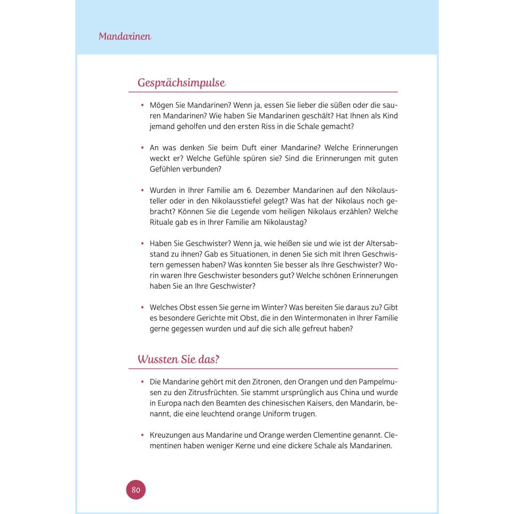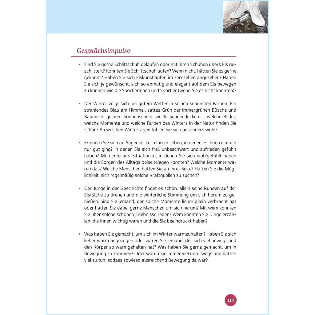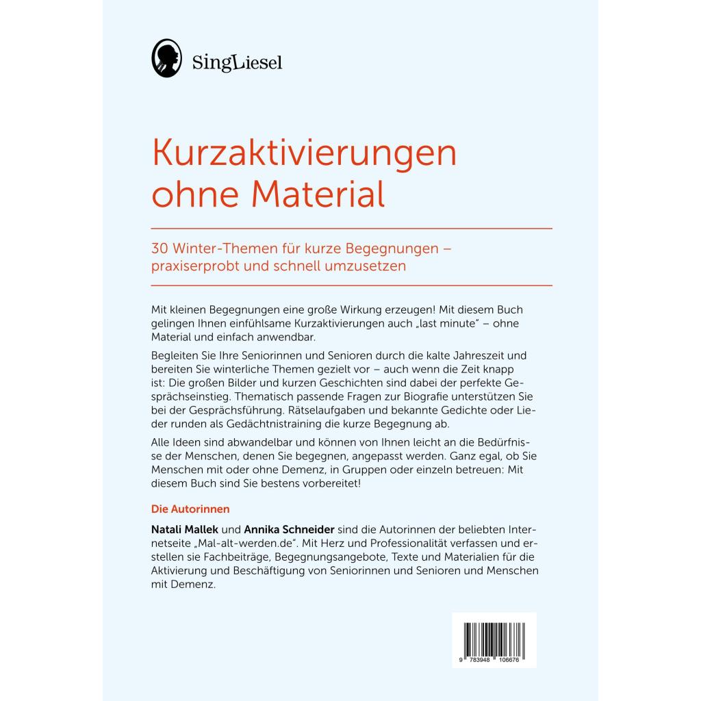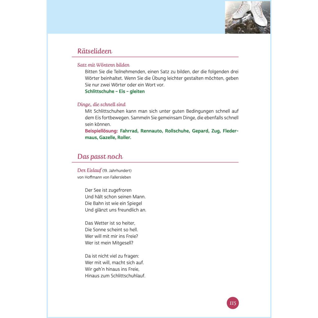 Kurzaktivierungen ohne Material - Last-Minute-Ideen für den Winter 30 Winter-Themen für kurze Begegnungen - praxiserprobt und schnell umzusetzen Mit kleinen Begegnungen eine große Wirkung erzeugen! Mit diesem Buch gelingen Ihnen einfühlsame Kurzaktivierungen auch "last minute" - wenn die Zeit knapp ist, ohne Material und einfach anwendbar. Begleiten Sie Ihre Seniorinnen und Senioren durch die kalte Jahreszeit und bereiten Sie winterliche Themen gezielt vor - auch wenn die Zeit knapp ist: Die großen Bilder und kurzen Geschichten sind dabei der perfekte Gesprächseinstieg. Thematisch passende Fragen zur Biografie unterstützen Sie bei der Gesprächsführung. Rätselaufgaben und bekannte Gedichte oder Lieder runden als Gedächtnistraining die kurze Begegnung ab. Alle Ideen sind abwandelbar und können von Ihnen leicht an die Bedürfnisse der Menschen, denen Sie begegnen, angepasst werden. Ganz egal, ob Sie Menschen mit oder ohne Demenz, in Gruppen oder einzeln betreuen: Mit diesem Buch sind Sie bestens vorbereitet!