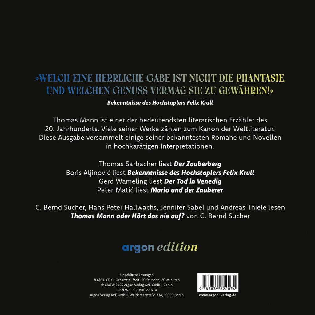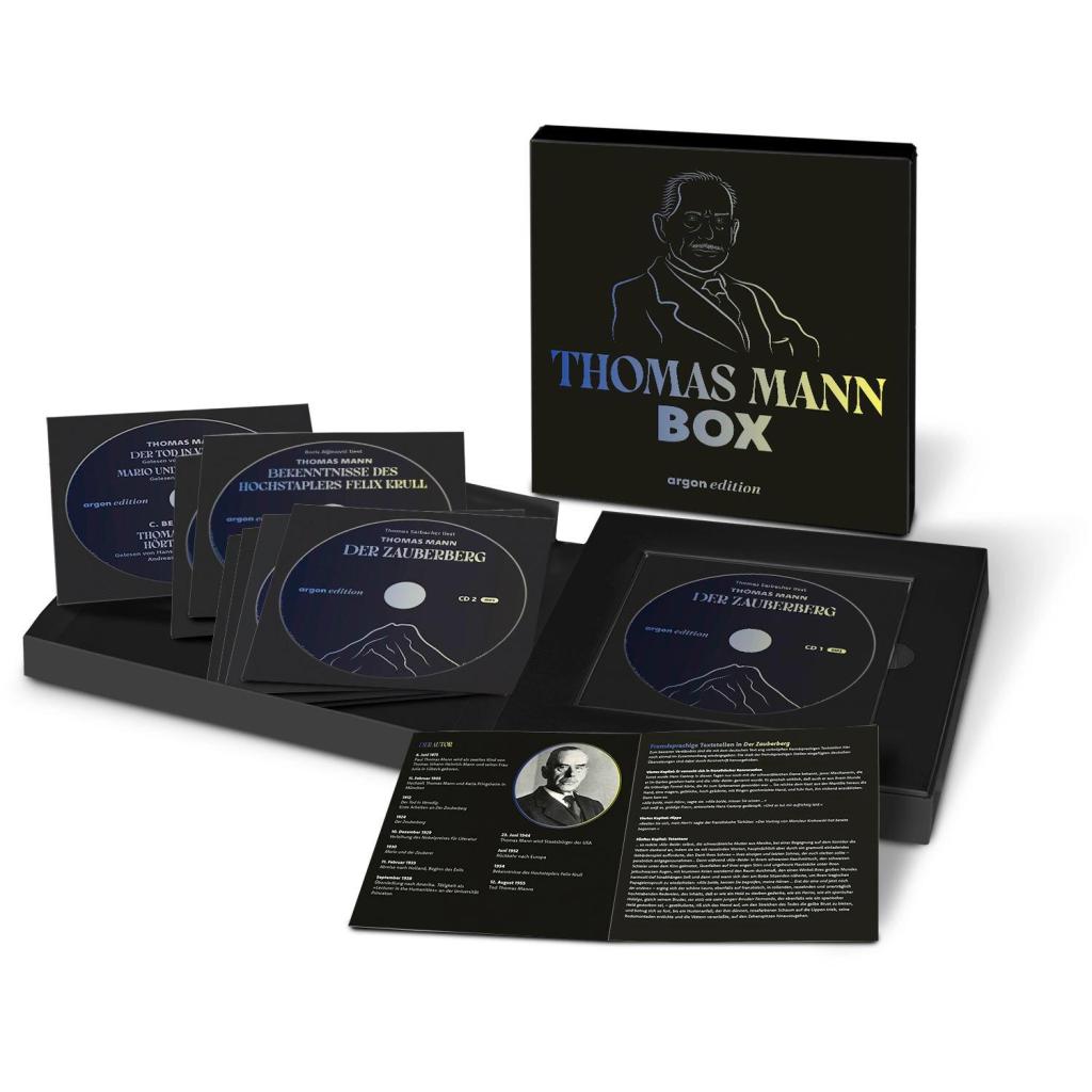 Die Thomas-Mann-Box vereint einige der bedeutendsten Werke des großen Literaten in hochkarätigen Interpretationen. Einmalig wird die Box dadurch, dass Der Zauberberg erstmals in einer ungekürzten Hörbuchfassung zu hören ist. Thomas Sarbacher liest Der Zauberberg Gerd Wameling liest Der Tod in Venedig Boris Aljinovi¿ liest Bekenntnisse des Hochstaplers Felix Krull Peter Mati¿ liest Mario und der Zauberer Mit Thomas Mann oder Hört das nie auf? von C. Bernd Sucher enthält die Box auch eine Einführung in Leben und Werk von Thomas Mann, gelesen von Hans Peter Hallwachs, dem Autor und weiteren Interpreten. Die Box steht auf der Bestenliste der Deutschen Schallplattenkritik 4/2025 .