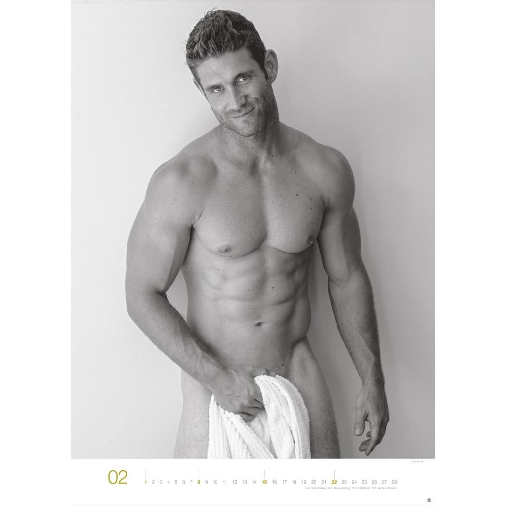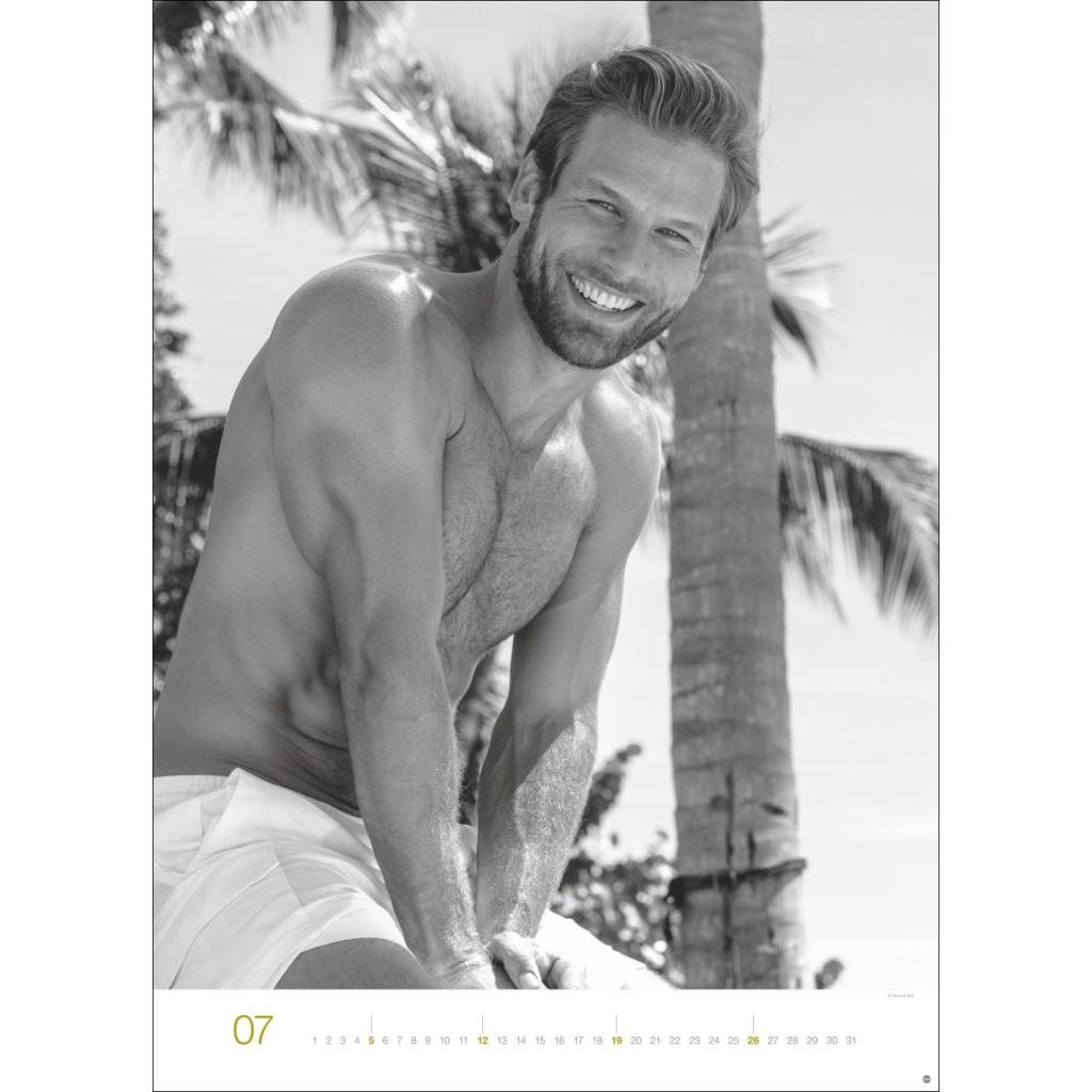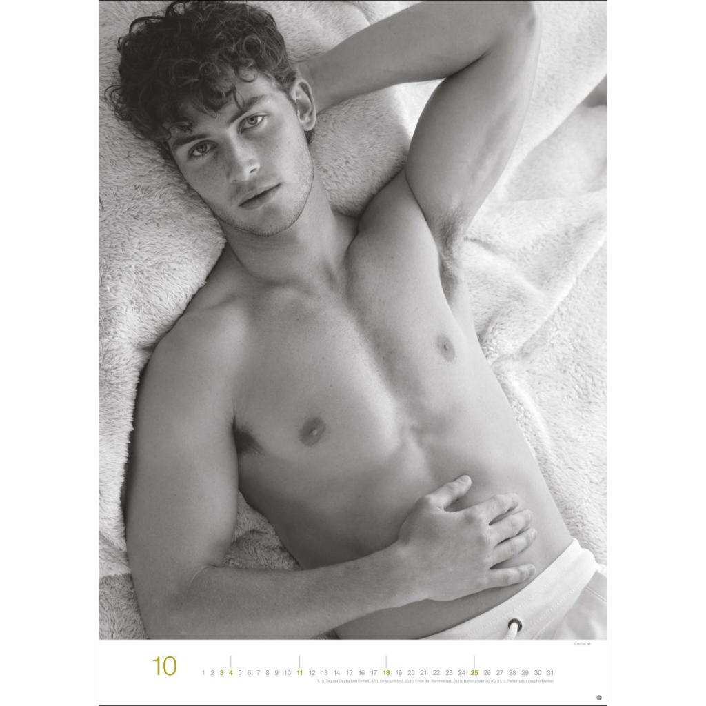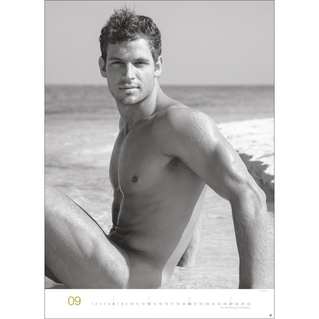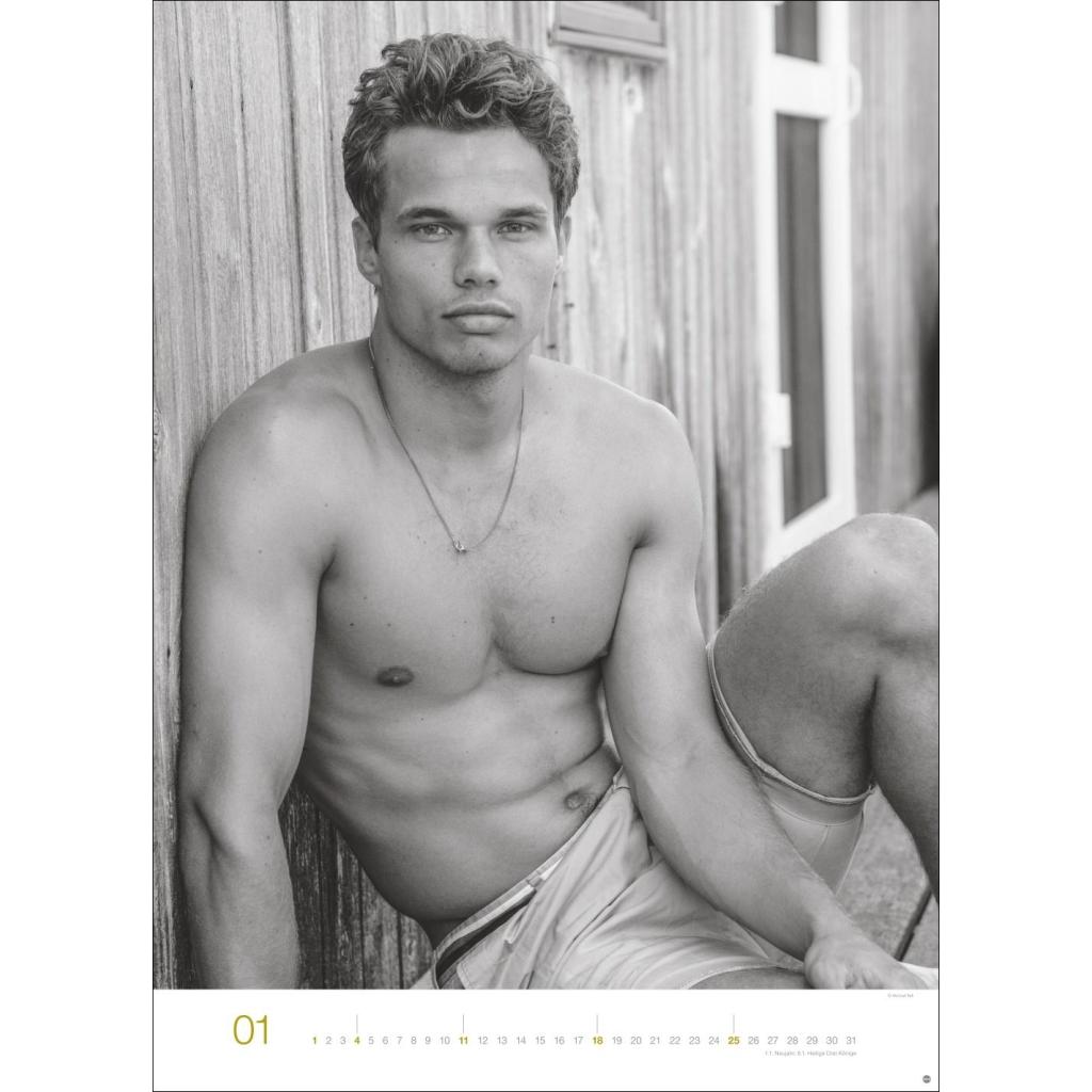 Jeden Monat ein sinnliches Schwarz-Weiß-Foto in einem Kalender im Großformat. Schöne Männer im Wandkalender XXL 2026. Hochformat 49 x 68 cm.