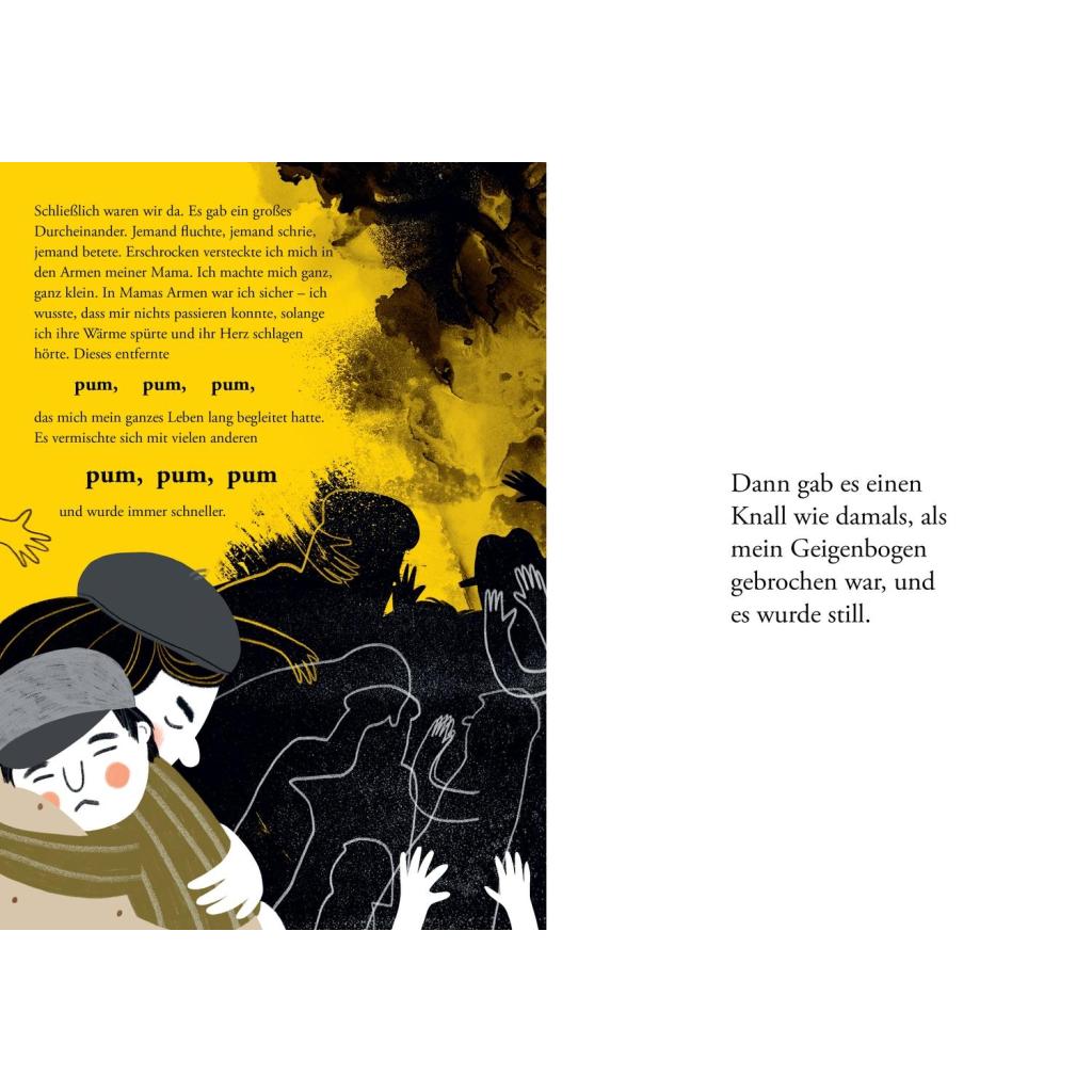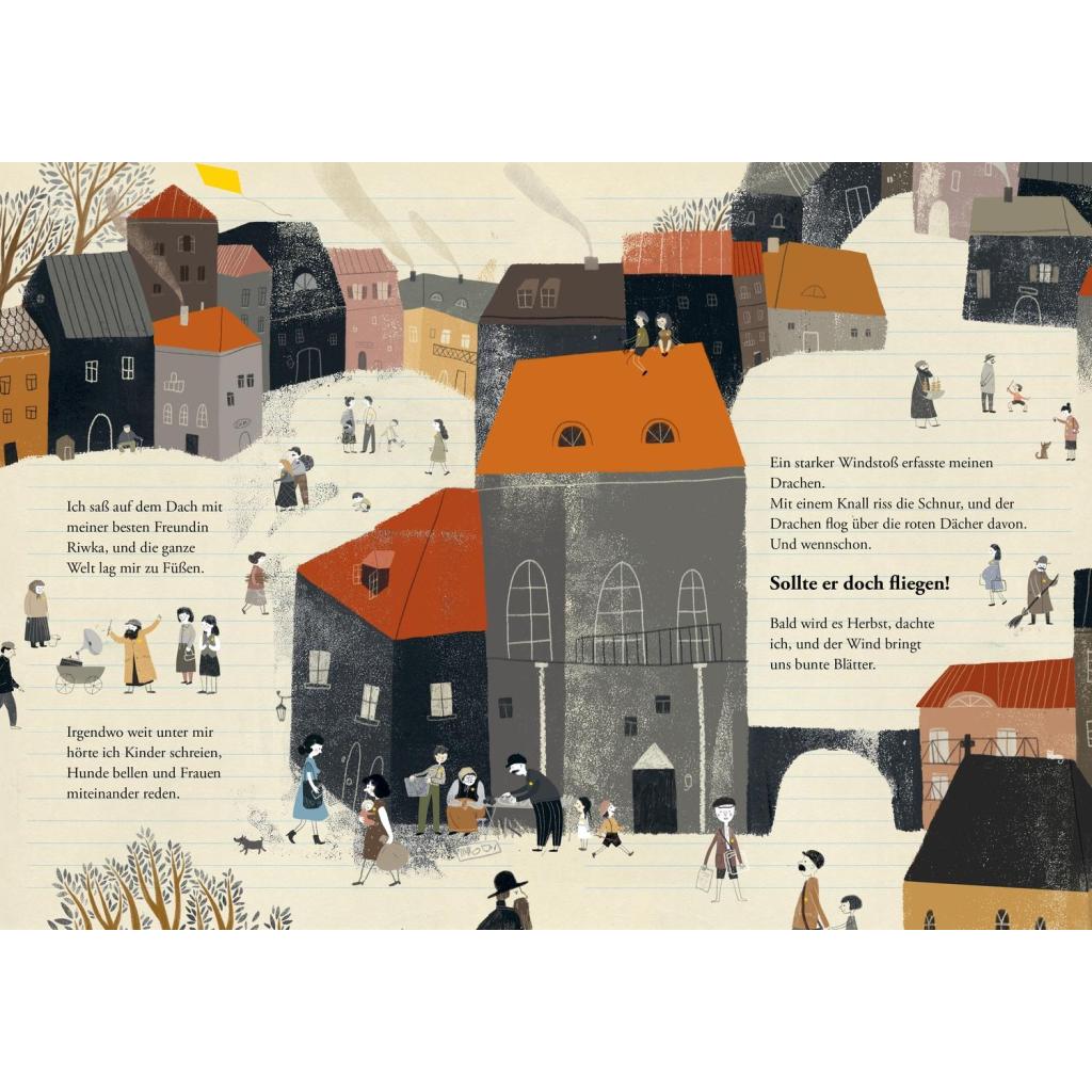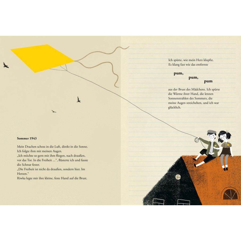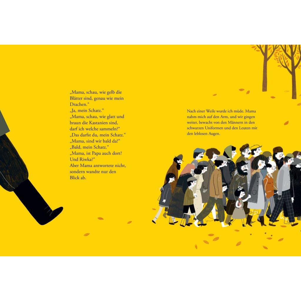 Eine feinfühlige Geschichte über Hoffnung und Freundschaft in Zeiten des Nationalsozialismus. Alon isst gern Bagels, die es aber leider viel zu selten gibt. Er spielt Geige und sitzt mit seiner Freundin Riwka auf dem Dach ihres Hauses, lässt seinen Drachen steigen und schaut über die Stadt. Aber das Leben ist schwierig, denn es ist das Jahr 1943, und Alon und Riwka wohnen im Getto und tragen einen gelben Stern. Niemand darf das Getto verlassen. Und wer doch durch das Tor hinausgeht, kehrt nicht zurück. Zart und ergreifend erzählt Marius Marcinkeviçius von zwei Kindern, die die Schrecken des Holocausts erleben. Sie werden getrennt, aber finden sich Jahrzehnte später wieder, dank eines Kieselsteins, der zum Symbol für ihre Stärke und das Überleben wird. Als die gelben Blätter fielen - ein besonderes Bilderbuch gegen das Vergessen. Eindringlich und voller Zartheit: "Als die gelben Blätter fielen" ist eine Geschichte über den Holocaust, über das Erinnern, über Freundschaft, über Hoffnung und über das Überleben. Das Buch handelt vom Leben in einem litauischen Getto zu Zeiten des 2. Weltkriegs. Autor Marius Marcinkeviçius schafft es trotz der Schwere, von diesem wichtigen Teil der Geschichte einfühlsam und liebevoll zu erzählen. Die berührenden und ausdrucksstarken Illustrationen von Inga Dagile machen "Als die gelben Blätter fielen" zu einem besonderen Bilderbuch für Kinder ab 8 Jahren. Die bewegende Geschichte von Alon und Riwka ist ein guter Einstieg für (Grundschul-)Kinder, um einen Zugang zu den Themen Nationalsozialismus und Holocaust zu bekommen. Das Nachwort hilft bei der historischen Einordnung. "Als die gelben Blätter fielen" ist in Litauen bereits mehrfach ausgezeichnet und für den Deutschen Jugendliteraturpreis 2025 nominiert. Kein Wunder: Autor Marius Marcinkeviçius und Illustratorin Inga Dagile schaffen es, auf einfühlsame Weise eine tief bewegende Geschichte über Hoffnung und Freundschaft zu Zeiten des Holocausts zu erzählen. Das besondere Bilderbuch ist für Kinder ein guter Einstieg zu dem Thema Nationalsozialismus. Es richtet sich an junge Leser*innen zwischen 8 und 11 Jahren, ist aber eine wichtige Lektüre für alle Menschen - unabhängig vom Alter.