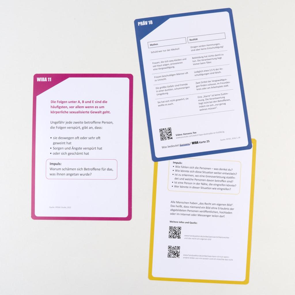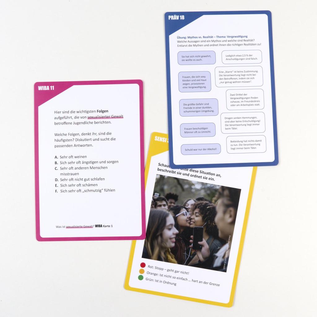 Andere Jugendliche sind das Hauptrisiko für sexualisierte Gewalt im Jugendalter, wie unter anderem die SPEAK! Studien zeigen. Diese sexualisierte Peergewalt findet zum Beispiel in der Schule, auf Partys, im Verein und digital statt - oft mit gravierenden Folgen für die Betroffenen. Statt angemessen zu reagieren, wird sexualisierte Gewalt häufig von Jugendlichen und Erwachsenen bagatellisiert, zum Beispiel als 'unbeholfene Flirtversuche'. Damit wird einer Normalisierung sexualisierter Peergewalt Vorschub geleistet. Hier setzen die Karten an, die mit und von Jugendlichen ab Klasse 8 bearbeitet werden. Drei Module strukturieren das Set: ¿ WIBA legt eine Wissensbasis, zum Beispiel in Quizform ¿ SENSI sensibilisiert für das Thema, etwa durch Visualisierungen von Situationen ¿ PRÄV konzentriert sich auf präventive Übungen, um konstruktive Verhaltensweisen zu fördern