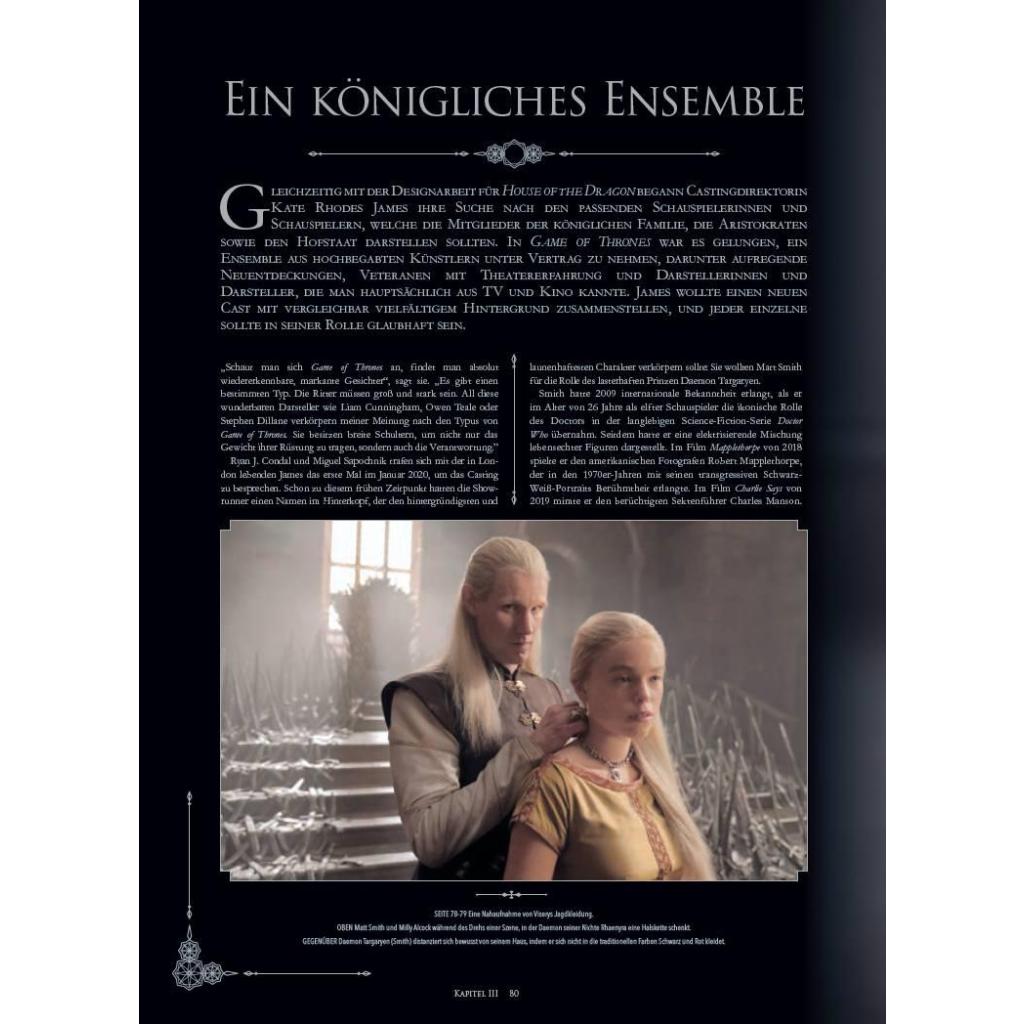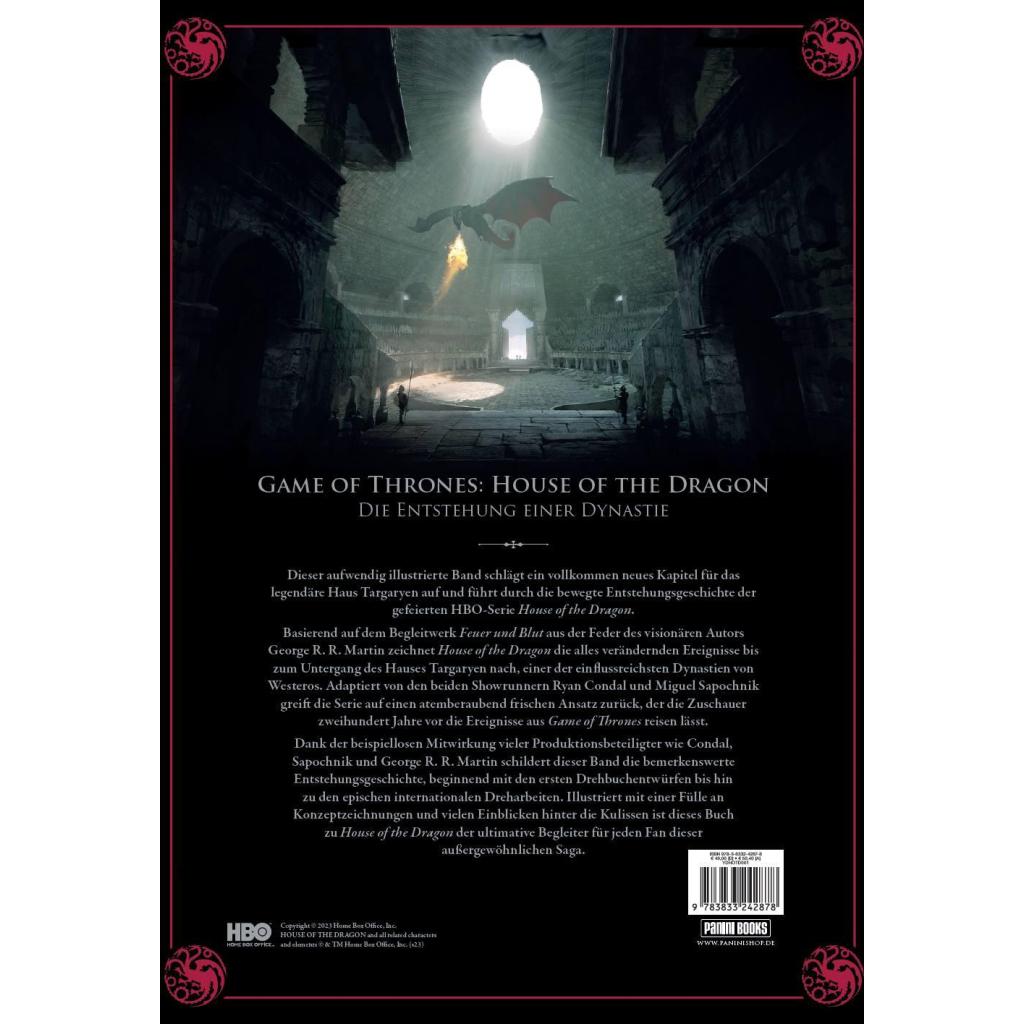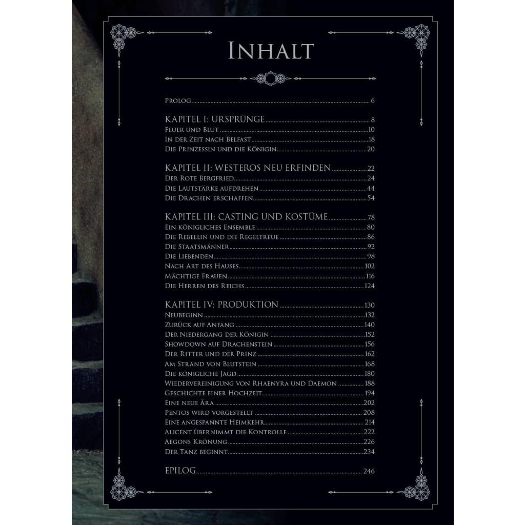 GAME OF THRONES: HOUSE OF THE DRAGON - DIE ENTSTEHUNG EINER DYNASTIE Dieser aufwendig illustrierte Band schlägt ein vollkommen neues Kapitel für das legendäre Haus Targaryen auf und führt durch die bewegte Entstehungsgeschichte der gefeierten HBO-Serie House of the Dragon. Basierend auf dem Begleitwerk Feuer und Blut aus der Feder des visionären Autors George R. R. Martin zeichnet House of the Dragon die alles verändernden Ereignisse bis zum Untergang des Hauses Targaryen nach, einer der einflussreichsten Dynastien von Westeros. Adaptiert von den beiden Showrunnern Ryan Condal und Miguel Sapochnik greift die Serie auf einen atemberaubend frischen Ansatz zurück, der die Zuschauer zweihundert Jahre vor die Ereignisse aus Game of Thrones reisen lässt. Dank der beispiellosen Mitwirkung vieler Produktionsbeteiligter wie Condal, Sapochnik und George R. R. Martin schildert dieser Band die bemerkenswerte Entstehungsgeschichte, beginnend mit den ersten Drehbuchentwürfen bis hin zu den epischen internationalen Dreharbeiten. Illustriert mit einer Fülle an Konzeptzeichnungen und vielen Einblicken hinter die Kulissen ist dieses Buch zu House of the Dragon der ultimative Begleiter für jeden Fan dieser außergewöhnlichen Saga.