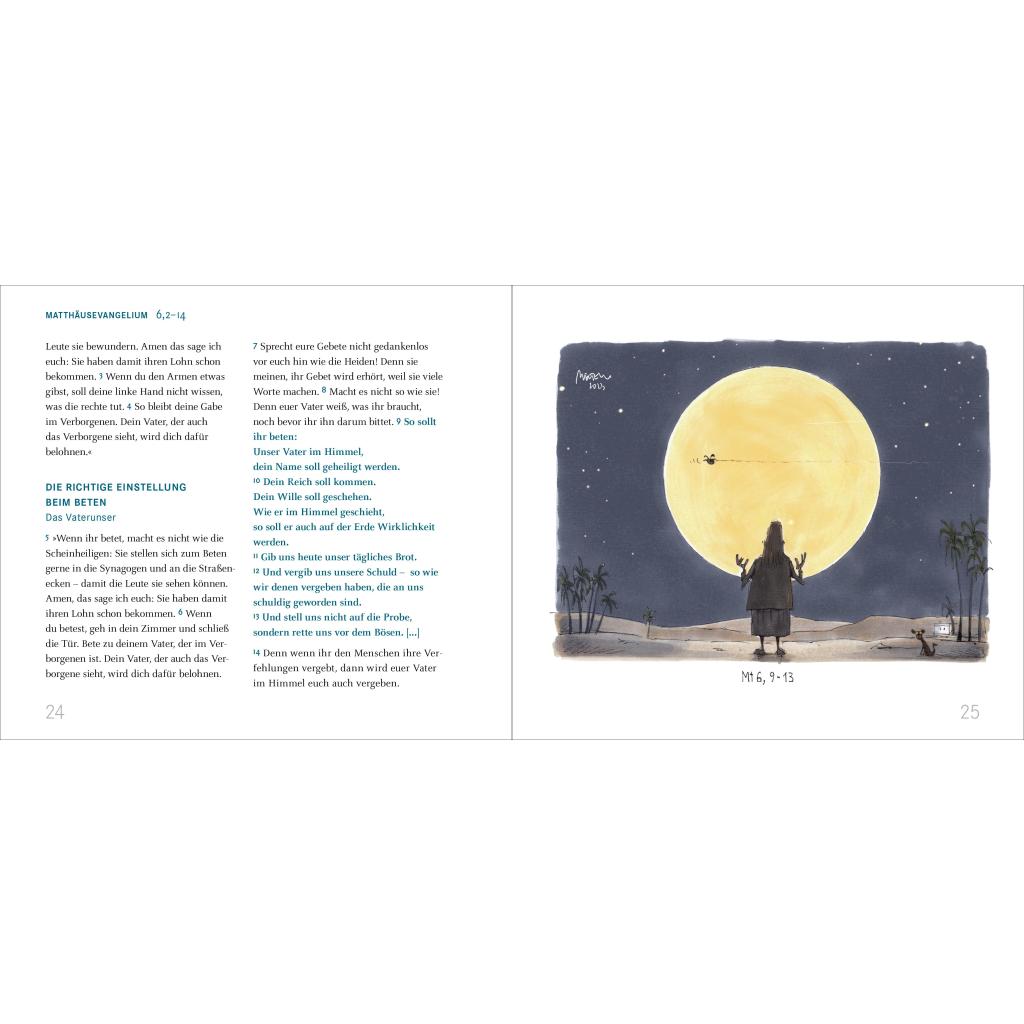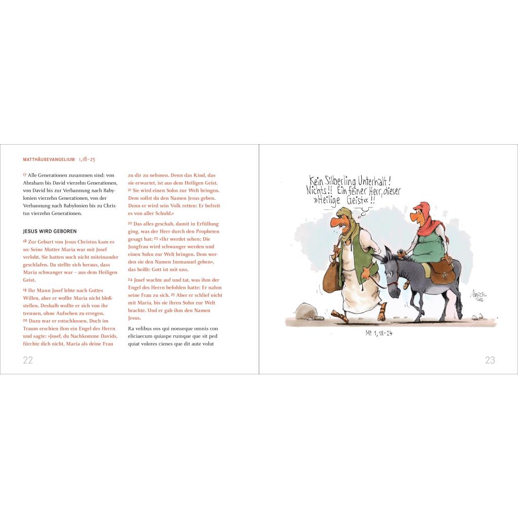 Zentrale Bibelgeschichten in scharfsinnigen Karikaturen Josef, der sich über die Zahlungsmoral des Heiligen Geistes beschwert, Maria, die sich von den drei Weisen lieber frische Windeln gewünscht hätte oder Petrus als Pionier des Schwimmens. Gerhard Mester interpretiert mit Humor und Scharfsinn den Text des Matthäusevangeliums in über 120 Karikaturen - nicht ohne ihn kritisch zu hinterfragen. - Gerhard Mesters treffsichere Bibel- und Jesus-Cartoons - Christliche Karikaturen für alle, die die Heilige Schrift auch einmal mit Humor nehmen möchten - Auszüge aus bekannten Bibelgeschichten, zeichnerisch neu interpretiert - Karikaturen von Gerhard Mesters, bekannt durch seine Arbeit für zahlreiche Tageszeitungen - Zum Abschied, Geburtstag oder Konfirmation: eine christliche Geschenk-Idee für viele Anlässe Heiter und herausfordernd: ein neuer Blick auf das Matthäus-Evangelium Grafikdesigner Gerhard Mester ist bekannt für seine pointierten Karikaturen in regionalen und überregionalen deutschen Zeitungen. In diesem humorvollen Buch nimmt er sich mit spitzer Feder altbekannte biblische Texte aus dem Neuen Testament vor. Den entsprechenden Bibelstellen sind teils witzige, teils nachdenklich stimmende Karikaturen gegenübergestellt, so dass Text und Bild zu einem außergewöhnlichen Leseerlebnis verschmelzen: christliche Cartoons in Höchstform, die bei den Leser:innen garantiert einen bleibenden Eindruck hinterlassen!