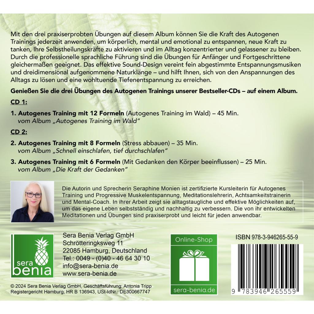 Stress abbauen, Konzentration steigern, besser einschlafen Mit den drei praxiserprobten Übungen auf diesem Album können Sie Autogenes Training lernen und die Kraft des Autogenen Trainings jederzeit anwenden, um körperlich, mental und emotional zu entspannen, neue Kraft zu tanken, Ihre Selbstheilungskräfte zu aktivieren und im Alltag konzentrierter und gelassener zu bleiben. Durch die professionelle sprachliche Führung sind die Entspannungstechniken für Anfänger und Fortgeschrittene gleichermaßen geeignet. Das effektive Sounddesign vereint fein abgestimmte Entspannungsmusik und dreidimensional aufgenommene Naturklänge - und hilft Ihnen, sich von den Anspannungen des Alltags zu lösen, Stress abzubauen und eine wohltuende Tiefenentspannung zu erreichen. Genießen Sie die drei Übungen des Autogenen Trainings unserer Bestseller-CDs gesammelt auf einem Album: 1. Autogenes Training mit 12 Formeln (Autogenes Training im Wald) - 45 Min.¿ vom Album "Autogenes Training im Wald" Diese ausführliche Variante des Autogenen Trainings ist in eine Fantasiereise eingebettet. Zusätzlich zu den gesundheitsfördernden Effekten des Autogenen Trainings hilft Ihnen diese Übung, positive innere Bilder aufzubauen und die regenerative Kraft Ihres Trainings zu verstärken. 2. Autogenes Training mit 8 Formeln (Stress abbauen - Autogenes Training für die innere Ruhe) - 35 Min.¿ vom Album "Schnell einschlafen, tief durchschlafen" Diese Übung stammt von dem Album "Schnell einschlafen, tief durchschlafen". Sie wurde als Ergänzung für die Einschlafmeditation entwickelt und ist optimal geeignet, um tagsüber Stress abzubauen, eine konditionierte Entspannung aufzubauen und dadurch Ihre Einschlaffähigkeit nachhaltig zu verbessern. 3. Autogenes Training mit 6 Formeln (Mit Gedanken den Körper beeinflussen) - 25 Min. vom Album "Die Kraft der Gedanken" Diese Variante des Autogenen Trainings wurde für das Album "Die Kraft der Gedanken" entwickelt. Mit dieser Übung steigern Sie gezielt Ihre Konzentrationsfähigkeit und lernen, wie Sie mental jederzeit positiven Einfluss auf Ihren Körper nehmen können. Die Übungen auf diesem Album haben verschiedene Längen, damit Sie Ihr Autogenes Training jederzeit in Ihren Alltag einbauen und ganz nach Ihren Wünschen variieren und gestalten können. Nutzen Sie zum Beispiel eine kürzere Version für Ihren Start in den Tag oder eine längere Übung zum Feierabend. Sie können ebenfalls Ihr Autogenes Training zum Einschlafen verwenden, um leichter in einen erholsamen Schlaf zu finden. In diesem Fall lassen Sie die Rücknahme einfach weg und erlauben sich, von der Tiefenentspannung in den erholsamen Tiefschlaf zu gleiten. Die Autorin und Sprecherin Seraphine Monien ist zertifizierte Kursleiterin für Autogenes Training und Progressive Muskelentspannung, Meditationslehrerin, Achtsamkeitstrainerin und Mental-Coach. In ihrer Arbeit zeigt sie alltagstaugliche und effektive Möglichkeiten auf, um das eigene Leben selbstständig und nachhaltig zu verbessern. Die von ihr entwickelten Meditationen und Entspannungsübungen sind praxiserprobt und leicht für jeden anwendbar. {Spielzeit: 105 Min. / Hörproben und weitere Informationen zu diesem Produkt finden Sie auf der Homepage des Sera Benia Verlags} Was unsere Meditationen so effektiv macht. Zusätzlich zu den wertvollen sprachlich geführten Inhalten in unseren Übungen profitieren Sie auf allen Sera Benia CDs und MP3s von einem herausragenden und hochwirksamen Sound-Design, das speziell für Sie entwickelt wurde. Durch die fein abgestimmte Kombination aus echten Naturklängen und heilsamen sphärischen Melodien erreichen Sie eine Veränderung der wissenschaftlich belegten Schwingungen in Ihrem Gehirn - von Beta-Wellen (38-15 Hz) zu Alpha-Wellen (14-8 Hz) hin zu Theta-Wellen (7-4 Hz). Übersetzt bedeutet das: Sie gleiten von Ihrem üblichen Alltagsdenken in eine stressabbauende Entspannung und hinein in einen Zustand der inneren Ruhe und tiefen Meditation. Am Ende jeder Übung (ausgenommen der Meditationen zum Einschlafen) werden Sie sanft zurück in Ihren normalen wachbewussten Zustand geleitet. Für einen optimalen Effekt empfehlen wir das Hören über Kopfhörer.