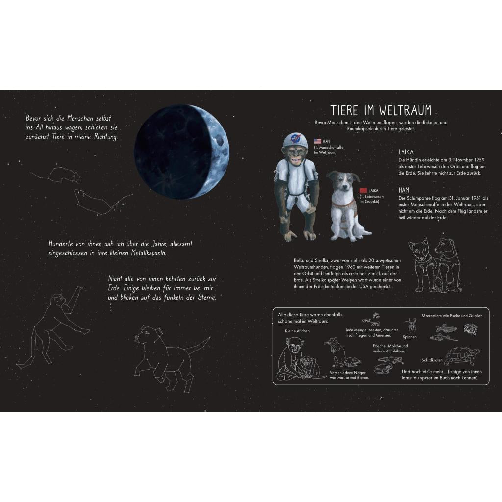 Lass den Mond seine Geschichte erzählen und erfahre hautnah, wie die Menschen die Erde hinter sich gelassen und den Weltraum erobert haben. Wusstest du, dass die Zeitrechnung einiger Länder auf dem Rhythmus vom Mond basiert? Oder, dass nicht nur Russland und die USA in den Weltraum fliegen, sondern auch viele andere Länder wie China, Japan oder europäische Nationen? Oder hast du dich auch schon gefragt, wie die Astronautinnen und Astronauten im All eigentlich ihre Zeit verbringen? Und wie viele Monde es gibt? Die Antworten auf diese und viele andere Fragen werden dir in diesem Buch vom Mond erzählt. Er ist von den Anfängen der Weltraumfahrt bis heute mit dabei gewesen und hat ihre Entwicklung mitverfolgt. Neben spannenden Details zur Raumfahrt und zum Weltall stellt er dir auch die Menschen und Tiere vor, die einen Beitrag zur Weltraumforschung geleistet haben, und erzählt dir, wie Menschen aus unterschiedlichen Ländern in der Erforschung der Himmelskörper zusammengearbeitet haben. Mit ihm erforschst du unser Sonnensystem und lässt dir von ihm die Highlights der Raumfahrt erklären. Und vielleicht wagst du sogar einen Blick in die Zukunft und siehst, welche Pläne es für den Mond und den Mars in den nächsten zehn Jahren gibt.
