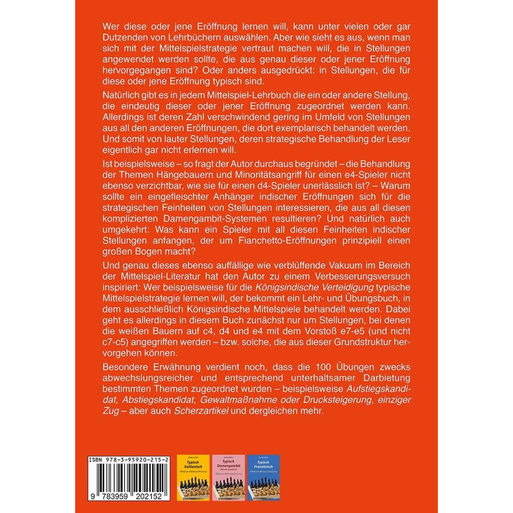 Wer diese oder jene Eröffnung lernen will, kann unter vielen oder gar Dutzenden von Lehrbüchern auswählen. Aber wie sieht es aus, wenn man sich mit der Mittelspielstrategie vertraut machen will, die in Stellungen angewendet werden sollte, die aus genau dieser oder jener Eröffnung hervorgegangen sind? Oder anders ausgedrückt: in Stellungen, die für diese oder jene Eröffnung typisch sind. Natürlich gibt es in jedem Mittelspiel-Lehrbuch die ein oder andere Stellung, die eindeutig dieser oder jener Eröffnung zugeordnet werden kann. Allerdings ist deren Zahl verschwindend gering im Umfeld von Stellungen aus all den anderen Eröffnungen, die dort exemplarisch behandelt werden. Und somit von lauter Stellungen, deren strategische Behandlung der Leser eigentlich gar nicht erlernen will. Ist beispielsweise - so fragt der Autor durchaus begründet - die Behandlung der Themen Hängebauern und Minoritätsangriff für einen e4-Spieler nicht ebenso verzichtbar, wie sie für einen d4-Spieler unerlässlich ist? - Warum sollte ein eingefleischter Anhänger indischer Eröffnungen sich für die strategischen Feinheiten von Stellungen interessieren, die aus all diesen komplizierten Damengambit-Systemen resultieren? Und natürlich auch umgekehrt: Was kann ein Spieler mit all diesen Feinheiten indischer Stellungen anfangen, der um Fianchetto-Eröffnungen prinzipiell einen großen Bogen macht? Und genau dieses ebenso auffällige wie verblüffende Vakuum im Bereich der Mittelspiel-Literatur hat den Autor zu einem Verbesserungsversuch inspiriert: Wer beispielsweise für die Königsindische Verteidigung typische Mittelspielstrategie lernen will, der bekommt ein Lehr- und Übungsbuch, in dem ausschließlich Königsindische Mittelspiele behandelt werden. Dabei geht es allerdings in diesem Buch zunächst nur um Stellungen, bei denen die weißen Bauern auf c4, d4 und e4 mit dem Vorstoß e7-e5 (und nicht c7-c5) angegriffen werden - bzw. solche, die aus dieser Grundstruktur her- vorgehen können. Besondere Erwähnung verdient noch, dass die 100 Übungen zwecks abwechslungsreicher und entsprechend unterhaltsamer Darbietung bestimmten Themen zugeordnet wurden - beispielsweise Aufstiegskandidat, Abstiegskandidat, Gewaltmaßnahme oder Drucksteigerung, einziger Zug - aber auch Scherzartikel und dergleichen mehr.
