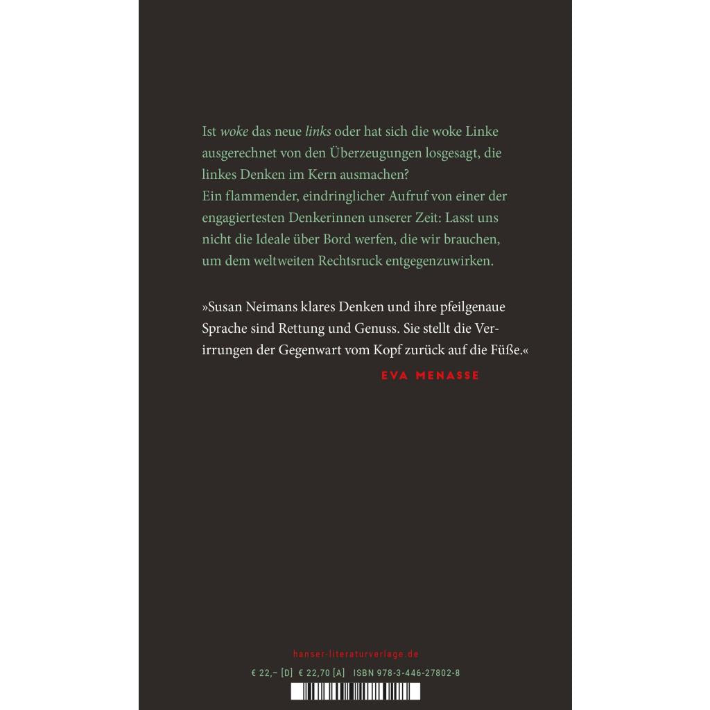 Die streitlustige Kritik einer überzeugten Linken an Identitätspolitik. "Susan Neimans klares Denken und ihre pfeilgenaue Sprache sind Rettung und Genuss." (Eva Menasse) Seit sie denken kann, ist Susan Neiman erklärte Linke. Doch seit wann ist die Linke woke? In ihrer von Leidenschaft und Witz befeuerten Streitschrift untersucht sie, wie zeitgenössische Stimmen, die sich als links bezeichnen, ausgerechnet die Überzeugungen aufgegeben haben, die für den linken Standpunkt entscheidend sind: ein Bekenntnis zum Universalismus, der Glaube an die Möglichkeit des Fortschritts und die klare Unterscheidung zwischen Macht und Gerechtigkeit. Als Philosophin überprüft sie dabei die identitätspolitische Kritik an der Aufklärung als rassistisch, kolonialistisch, eurozentristisch und stellt fest: Die heutige Linke beraubt sich selbst der Konzepte, die für den Widerstand gegen den weltweiten Rechtsruck dringend gebraucht werden.