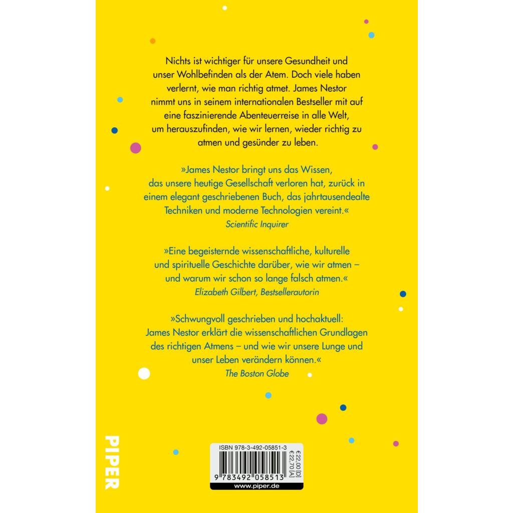 | Keyword: | Achtsamkeit; Apnoe-Tauchen; Apnoe-Taucher; Asthma; Atem-Übung; Atemtechnik; Atemwegserkrankung; Atmen; Atmung; Breath The New Science of a Lost Art; Buch; Corona; Corona-Therapie; Covid; Covid-19; Covid-19-Therapie; Deep Sea; Einatmen; Gesundheit; Körper; Körper und Geist; Laufen; Lungenentzündung; Läufer; Ratgeber; Sauerstoff; Sport; Yoga; kurzatmig; künstliche Beatmung |