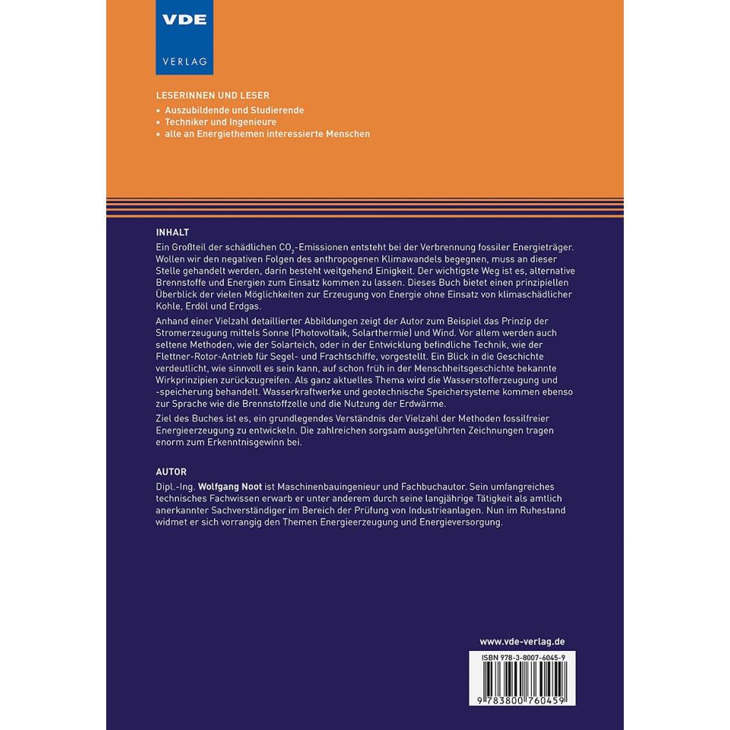 Ein Großteil der schädlichen CO2-Emissionen entsteht bei der Verbrennung fossiler Energieträger. Wollen wir den negativen Folgen des anthropogenen Klimawandels begegnen, muss an dieser Stelle gehandelt werden, darin besteht weitgehend Einigkeit. Der wichtigste Weg ist es, alternative Brennstoffe und Energien zum Einsatz kommen zu lassen. Dieses Buch bietet einen prinzipiellen Überblick der vielen Möglichkeiten zur Erzeugung von Energie ohne Einsatz von klimaschädlicher Kohle, Erdöl und Erdgas. Anhand einer Vielzahl detaillierter Abbildungen zeigt der Autor zum Beispiel das Prinzip der Stromerzeugung mittels Sonne (Photovoltaik, Solarthermie) und Wind. Vor allem werden auch seltene Methoden, wie der Solarteich, oder in der Entwicklung befindliche Technik, wie der Flettner-Rotor-Antrieb für Segel- und Frachtschiffe, vorgestellt. Ein Blick in die Geschichte verdeutlicht, wie sinnvoll es sein kann, auf schon früh in der Menschheitsgeschichte bekannte Wirkprinzipien zurückzugreifen. Als ganz aktuelles Thema wird die Wasserstofferzeugung und -speicherung behandelt. Wasserkraftwerke und geotechnische Speichersysteme kommen ebenso zur Sprache wie die Brennstoffzelle und die Nutzung der Erdwärme. Ziel des Buches ist es, ein grundlegendes Verständnis der Vielzahl der Methoden fossilfreier Energieerzeugung zu entwickeln. Die zahlreichen sorgsam ausgeführten Zeichnungen tragen enorm zum Erkenntnisgewinn bei.