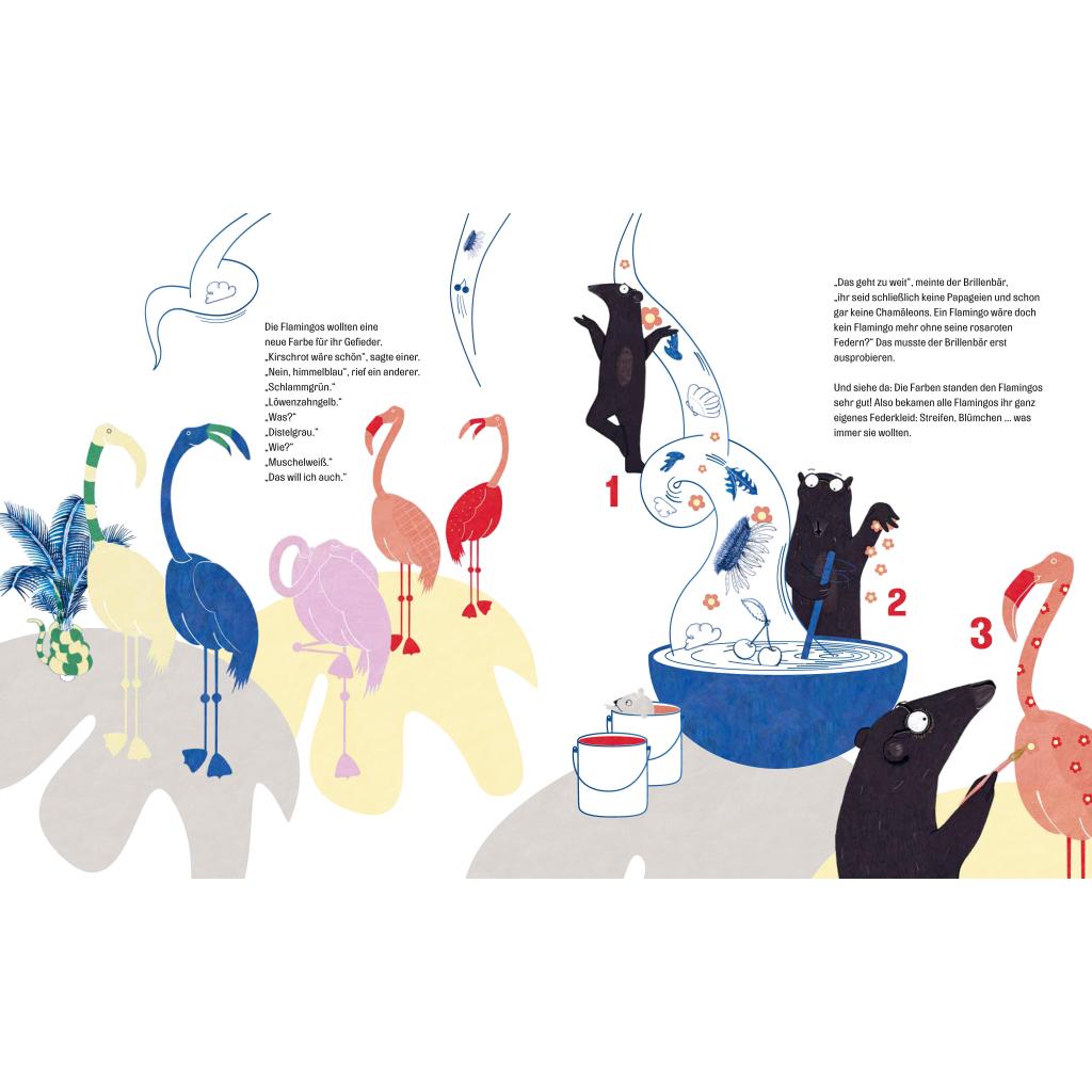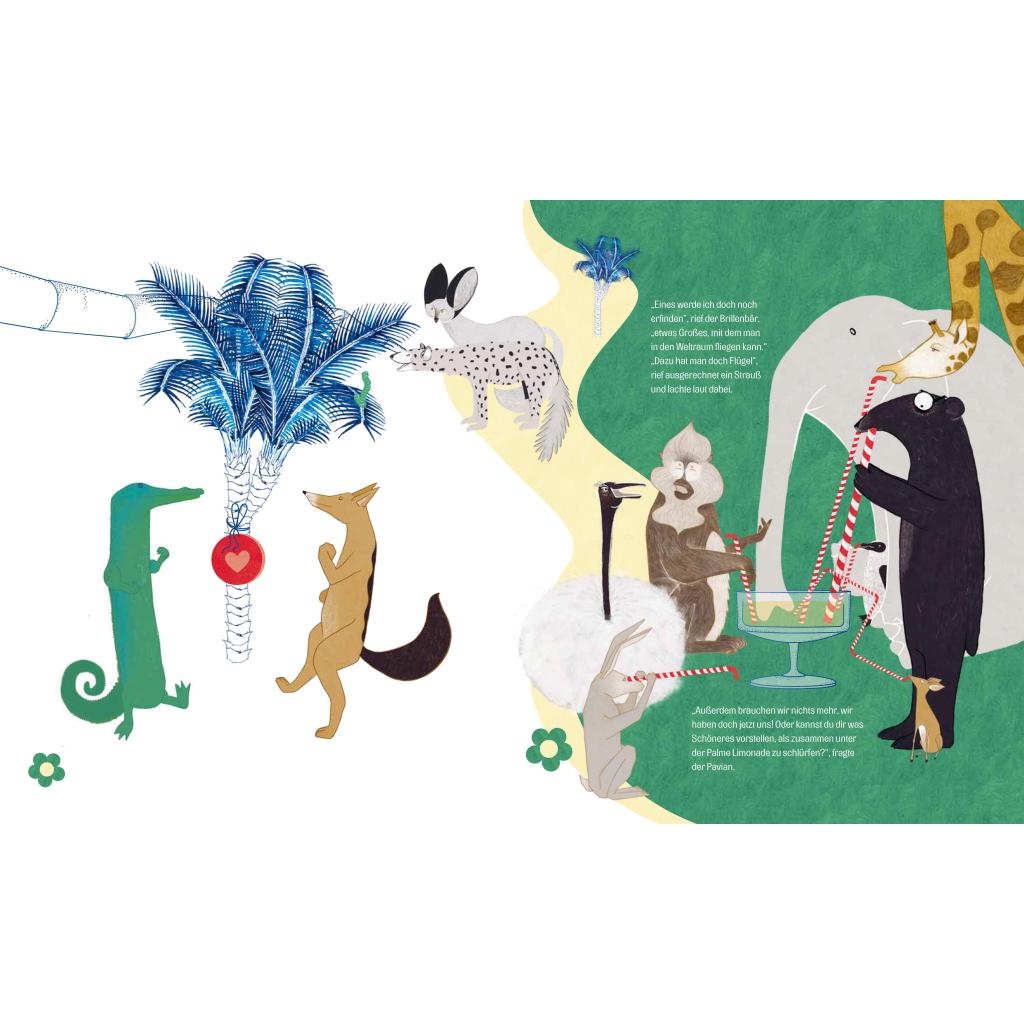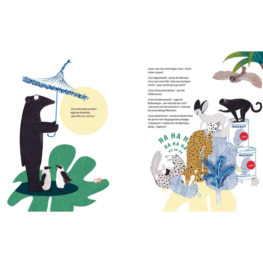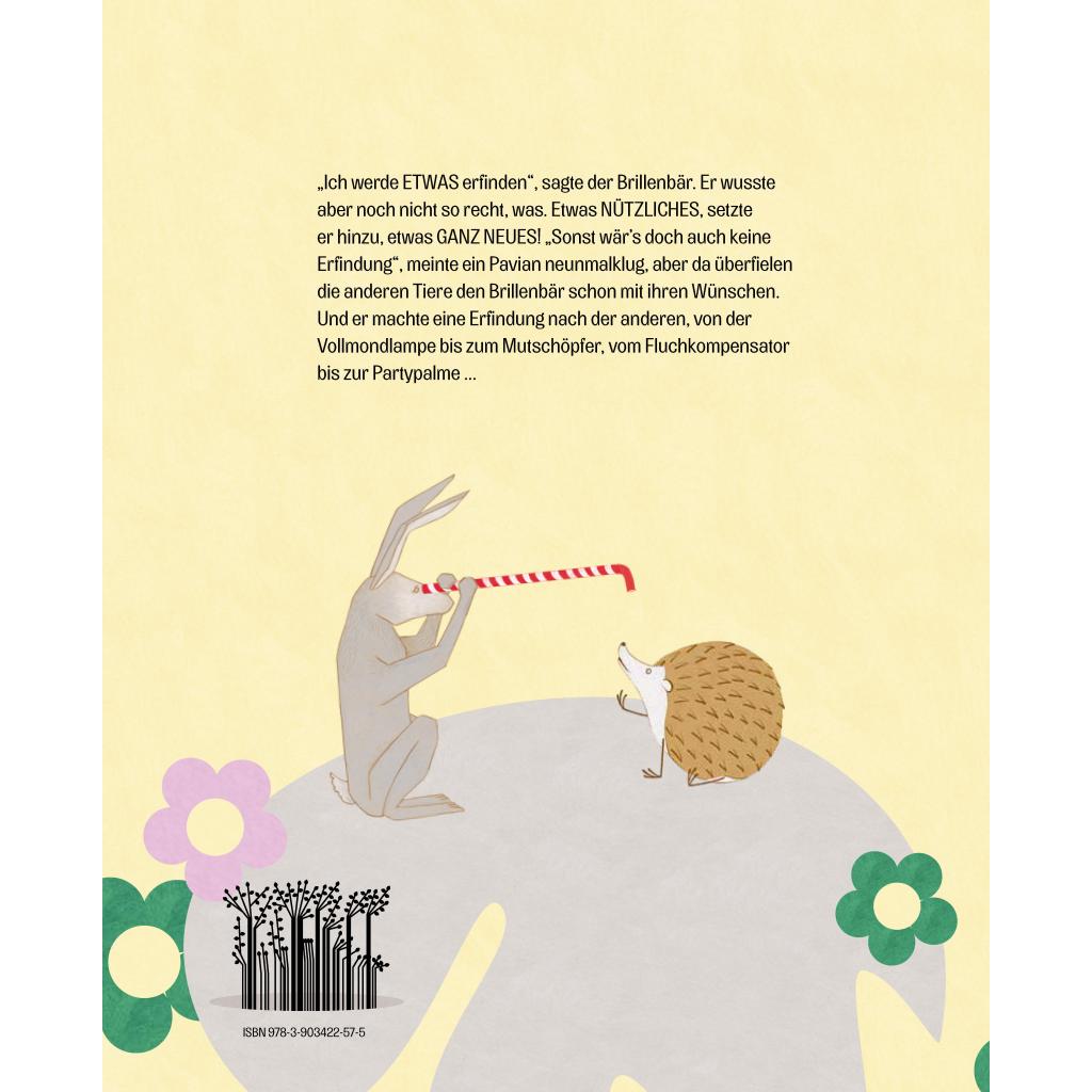 "Ich werde ETWAS erfinden", sagte der Brillenbär. Er wusste zwar noch nicht, was das sein sollte, aber das würde sich schon ergeben. Etwas NÜTZLICHES, setzte er wenig später nach, etwas GANZ NEUES! "Sonst wär's doch auch keine Erfindung", meinte ein Pavian neunmalklug, aber da überfielen die anderen Tiere den Brillenbär schon mit ihren Wünschen. Und er machte eine Erfindung nach der anderen, von der Vollmondlampe bis zum Mutschöpfer, vom Fluchkompensator bis zur Partnerpalme ... Mit liebevollem Witz und humorvollen Dialogen führen uns Nina und Nikolaus Ober durch einen abstrahierten, phantasievollen Dschungel, in dem es neben Brillenbärs Erfindungen vor überraschenden Details (für Groß und Klein) nur so wimmelt. 'Warum musst du denn unbedingt etwas erfinden", sagte das Faultier. "Es gibt doch schon alles. Du kannst dich einfach in die Hängematte legen und in den Himmel schauen.'
