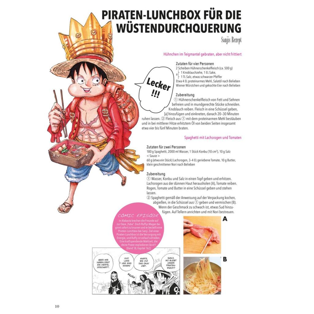 Welcher One-Piece-Fan hat noch nie davon geträumt, die leckersten Gerichte der Meere von Sanji, dem legendären Schiffskoch der Strohhutbande, zu genießen? Der Meisterkoch der Meere verrät in diesem Buch mehr als 40 seiner leckersten Geheimrezepte! Hier lernt man Schritt für Schritt die Zubereitung feinster kulinarischer Hochgenüsse wie Water-Seven-Wasserfleisch-Barbecue, Absaloms Kroketten oder Mocktown-Kirschkuchen. Eine Offenbarung!