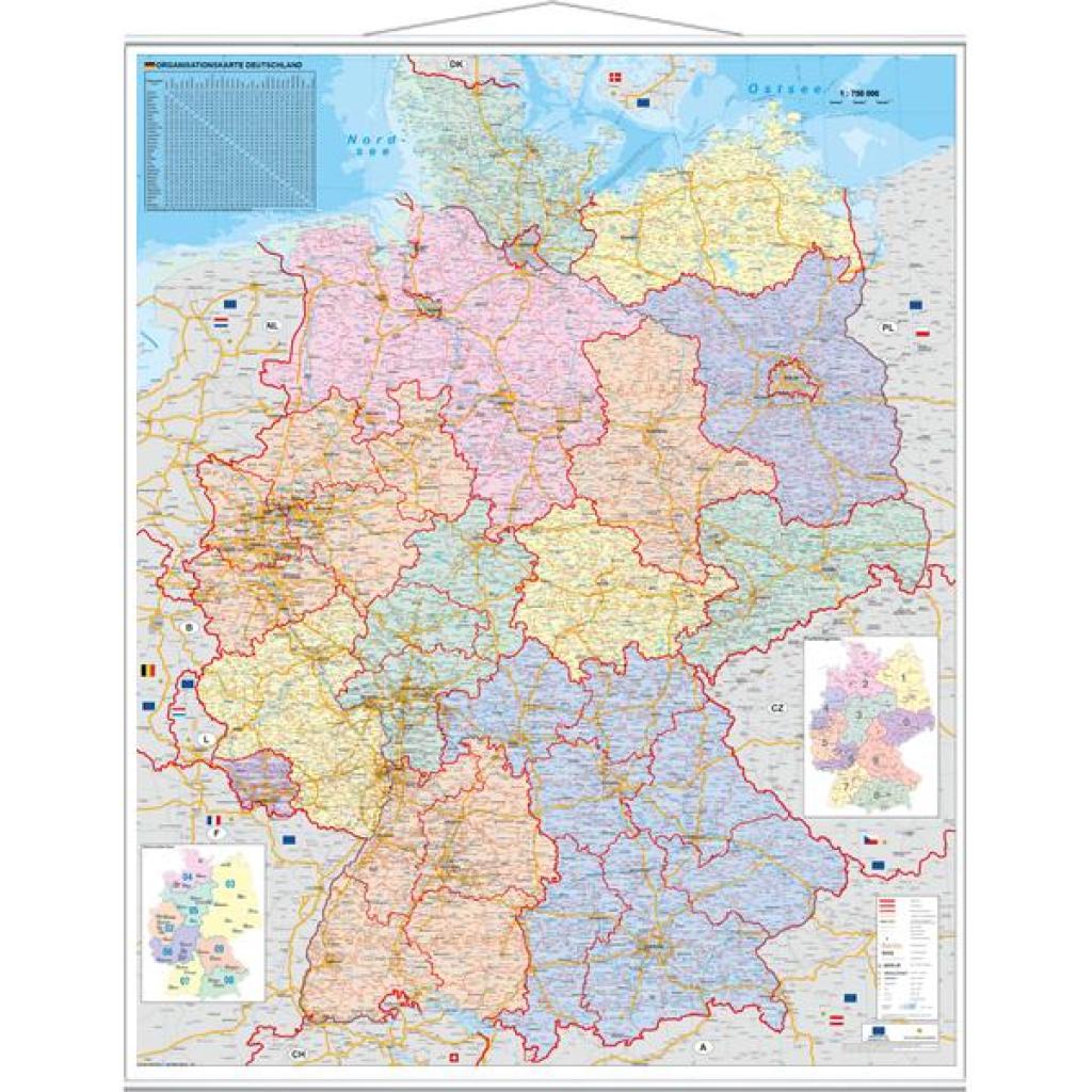 Wandkarte mit Metallbeleistung - beschreib- und abwischbar - extrem reißfest - ca. 9.000 Städte und Gemeinden - Ortsangaben ab 3.000 Einwohner - Hauptverkehrsverbindungen - Bundesland-, Regierungsbezirks- und Landkreisgrenzen - Entfernungstabelle in km (Autobahnnetz) - Kennzeichnung der Nachbarländer mit EU- und Euro-Mitgliedschaft sowie der jeweiligen Staatsflagge - mit Übersichtskarten: Postleitbereiche sowie Telefonvorwahlen - hervorragend geeignet zum Einzeichnen von individuellen Informationen, z.B. Kunden-, Verkaufs- oder Einzugsgebiete