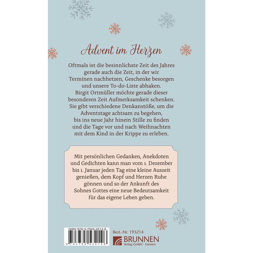 Oftmals ist die besinnlichste Zeit des Jahres gerade auch die stressigste Zeit, in der wir Terminen nachhetzen, Geschenke besorgen und unsere To-do-Liste abhaken. Birgit Ortmüller möchte gerade dieser besonderen Zeit Aufmerksamkeit schenken und gibt verschiedene Denkanstöße, um die Adventstage achtsam zu begehen, bis ins neue Jahr hinein Stille zu finden und die Tage vor und nach Weihnachten mit dem Kind in der Krippe zu erleben. Mit persönlichen Gedanken, Anekdoten und Gedichten kann man vom 1. Dezember bis 1. Januar jeden Tag eine kleine Auszeit genießen, dem Kopf und Herzen Ruhe gönnen und so der Ankunft des Sohnes Gottes eine neue Bedeutsamkeit für das eigene Leben geben. Das neue Buch von Birgit Ortmüller mit 32 Andachten und Impulsen im Advent ist ein achtsamer Begleiter durch die Weihnachtszeit und bis ins neue Jahr für mehr Ruhe, Besinnlichkeit und Entspannung in der schönsten Zeit des Jahres.