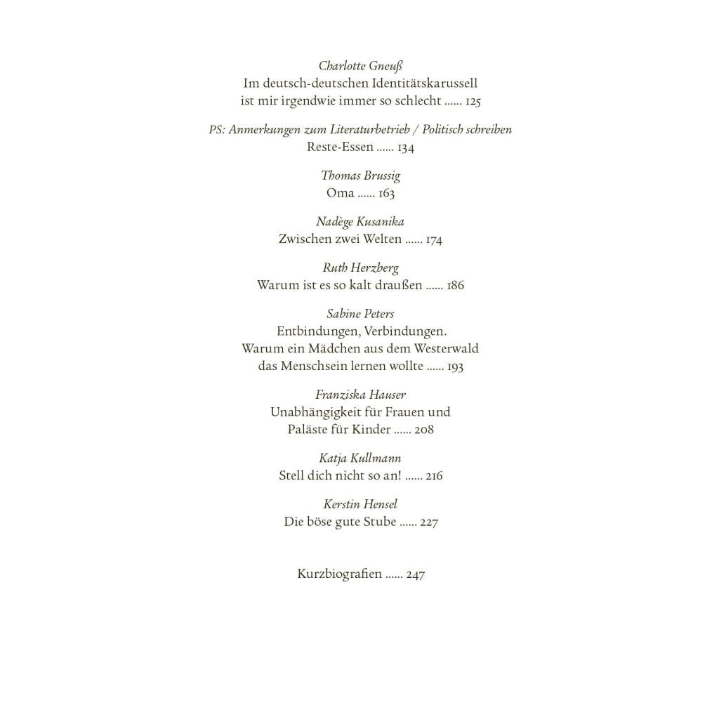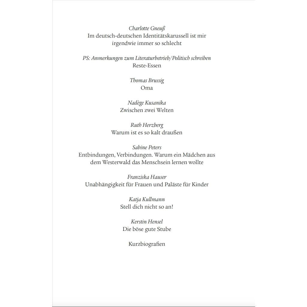 | Keyword: | Aufbruch; Aufwachsen; BRD; Begegnung; Berlin; Biografie; Charlotte Gneuß; DDR; Differenzen; Drei ostdeutsche Frauen betrinken sich und gründen den idealen Staat; Emanzipation; Erinnerung; Essay; Familie; Feminismus; Feministin; Frauenkongress; Frauenrolle; Frausein; Generationen; Generationenübergfreifend; Geschichte; Gesellschaft; Identität; Intimität; Kenah Cusanit; Kindheit; Liebe; Literatur; Mauer; Mauerfall; Mutterschaft; Ost; Ostdeutschland; Osten; Ostfrau; Prägungen; Sexualität; Sozialisation; Sozialismus; Thomas Brussig; Vielfalt; Wende; West; Westdeutschland; Westen; Westfrau; Zonenkinder; geteiltes Deutschland |