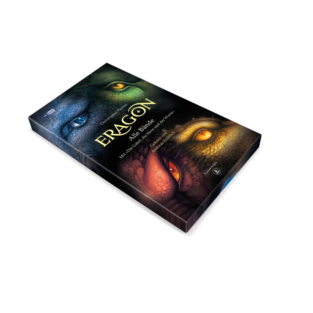 Aufwendig gestaltete Geschenk- und Fan-Box mit exklusiven Sammelartikeln und den Hörbüchern zur ERAGON-Welt! Diese Box enthält: Erstmals alle 4 ERAGON-Bände sowie die Geschichtensammlung "Die Gabel, die Hexe und der Wurm" als Download-Code zum Herunterladen, ein Poster der Landkarte von Alagaësia, vier exklusive Character-Cards der Drachen sowie vier außergewöhnliche LED-Untersetzer der Drachenköpfe, die jedes Getränk in mystischen Farben zum Leuchten bringen. Mit seiner Drachenreitersaga "Eragon" begeistert Christopher Paolini ein Millionenpublikum. Als Erbe der legendären Drachenreiter stellt sich Eragon gemeinsam mit seinem blauen Drachen Saphira dem Kampf gegen den grausamen Herrscher Alagaësias. Das Schicksal aller liegt in seiner Hand ... Alles beginnt, als Eragon bei der Jagd einen blauen Stein findet. Dieser Fund wird sein Leben für immer verändern. Denn dem vermeintlichen Stein entschlüpft ein Drachenjunges - und beschert Eragon ein Vermächtnis, das älter ist als die Welt. Diese CD-lose Download-Box enthält die Bände: Eragon. Das Vermächtnis der Drachenreiter (Band 1) Eragon. Der Auftrag des Ältesten (Band 2) Eragon. Die Weisheit des Feuers (Band 3) Eragon. Das Erbe der Macht (Band 4) Die Gabel, die Hexe und der Wurm. Geschichten aus Alagaësia (Zusatzband)