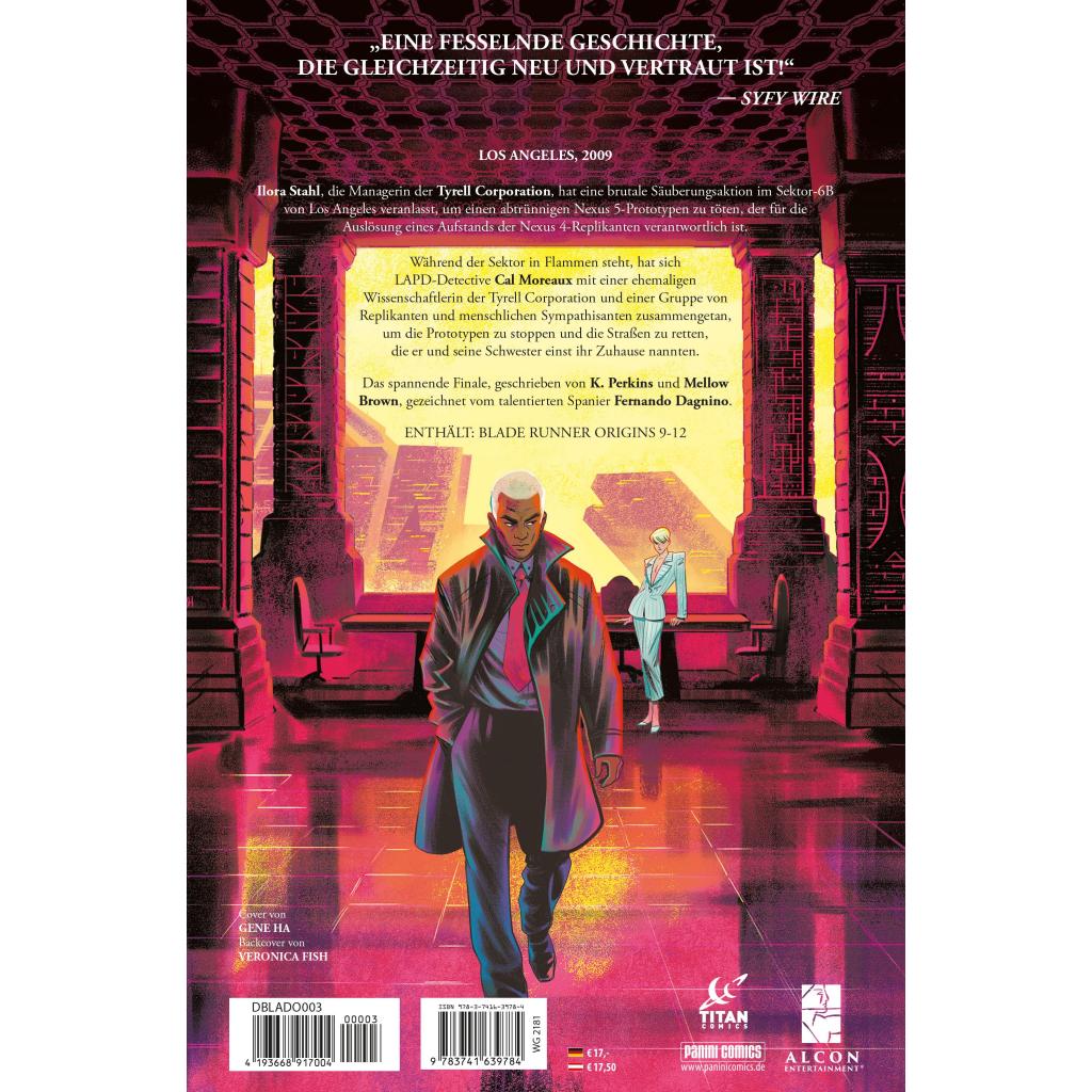 LOS ANGELES, 2009 Ilora Stahl, die Managerin der Tyrell Corporation, hat eine brutale Säuberungsaktion im Sektor-6B von Los Angeles veranlasst, um einen abtrünnigen Nexus 5-Prototypen zu töten, der für die Auslösung eines Aufstands der Nexus 4-Replikanten verantwortlich ist. Während der Sektor in Flammen steht, hat sich LAPD-Detective Cal Moreaux mit einer ehemaligen Wissenschaftlerin der Tyrell Corporation und einer Gruppe von Replikanten und menschlichen Sympathisanten zusammengetan, um die Prototypen zu stoppen und die Straßen zu retten, die er und seine Schwester eins ihr Zuhause nannten. Das spannende Finale, geschrieben von K. Perkins und Mellow Brown, gezeichnet vom talentierten Spanier Fernando Dagnino. ENTHÄLT: BLADE RUNNER ORIGINS 9-12