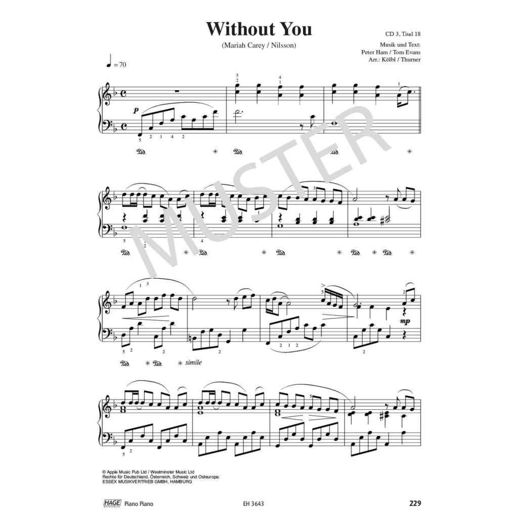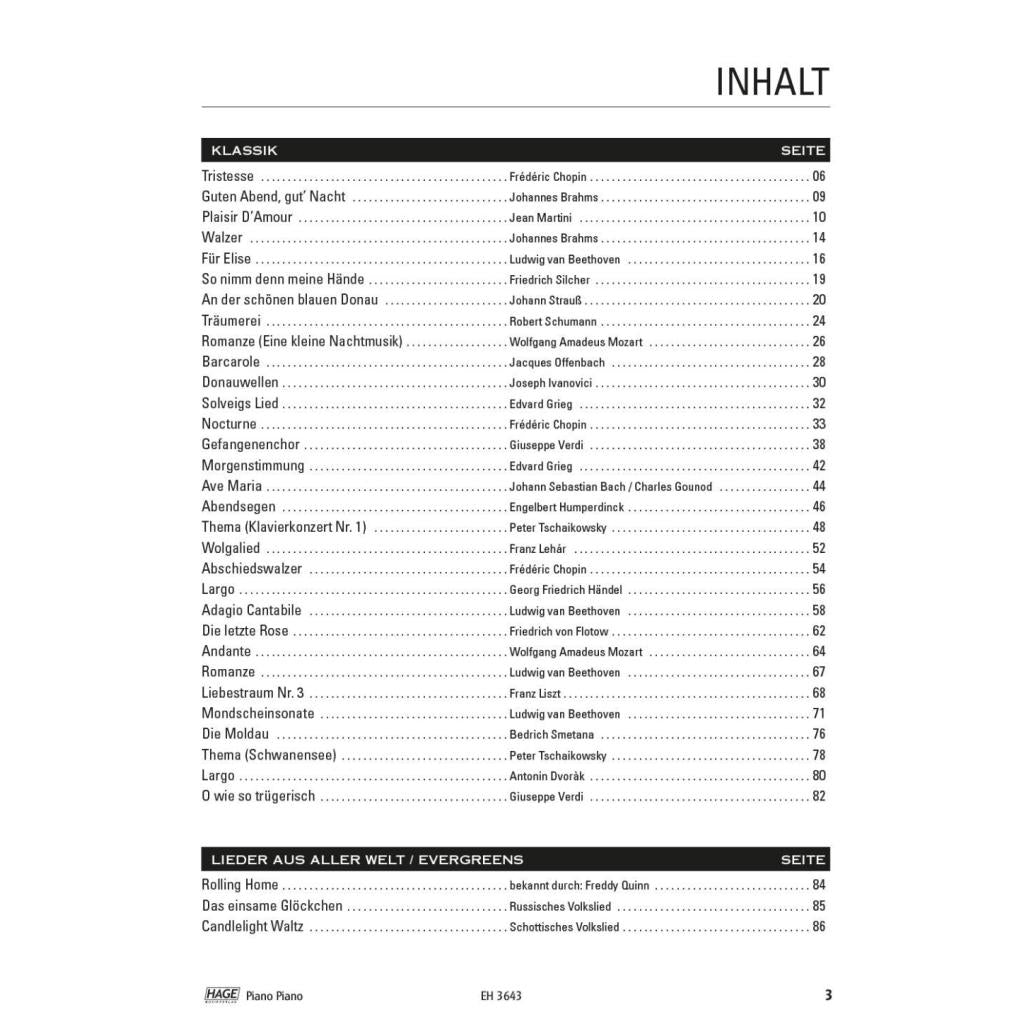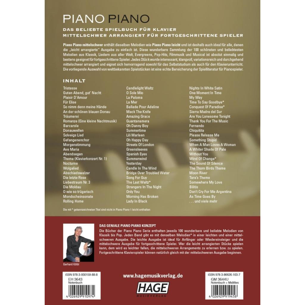 Piano Piano mittelschwer enthält dieselben Melodien wie Piano Piano leicht und ist deshalb auch ideal für alle, denen die "leicht arrangierte" Ausgabe zu einfach ist. Diese wunderbare Sammlung der 100 schönsten und beliebtesten Melodien aus den Bereichen Klassik, Lieder aus aller Welt, Evergreens, Pop-Hits, Filmmusik und Musical ist absolut einmalig und bestens geeignet für fortgeschrittene Spieler. Jedes Stück wurde interessant, klangvoll, variationsreich und durchgehend mittelschwer arrangiert und eignet sich hervorragend sowohl für das Selbststudium als auch für den Klavierunterricht. Die vorliegende Auswahl von weltbekannten Spielstücken ist eine echte Bereicherung der Spielliteratur für Pianospieler. Alle Melodien wurden originalgetreu nach den Noten von Gerhard Kölbl am Piano live eingespielt. Die 3 CDs empfehlen sich als Lernhilfe zum Üben. Damit das Buch offen liegen bleibt und sehr leicht umgeblättert werden kann, wurde es mit einer hochwertigen PUR-Klebebindung gebunden. Der Buchrücken kann nach hinten umgeknickt werden.