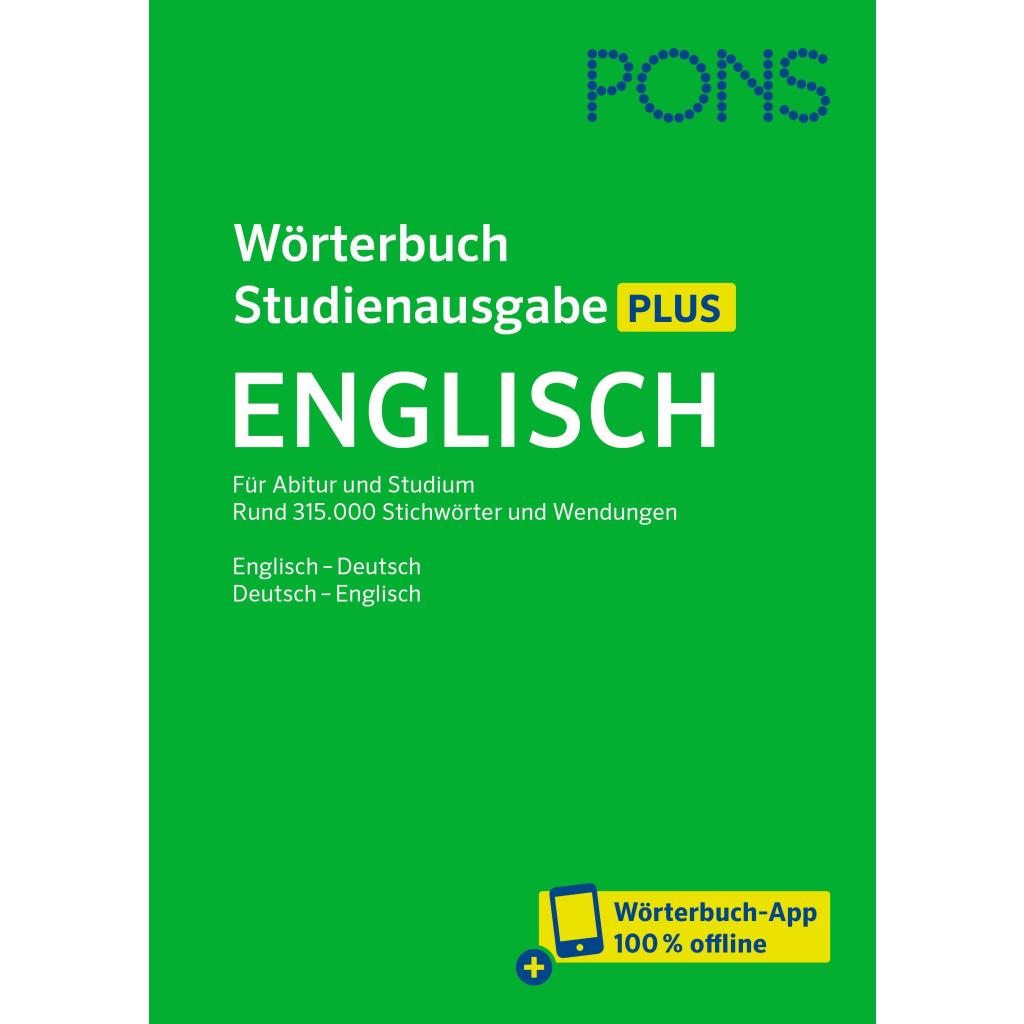 Wörterbuch Studienausgabe PLUS Englisch - für Abitur und fürs Studium Aktueller und umfassender Wortschatz mit vielen Beispielsätzen Mit Infofenstern zu Sprache und Kultur Viele Extras , wie z.B. Kurzgrammatik, Verbtabellen, Musterbriefe, englische Silbentrennung und Zeichensetzung International, mit länderspezifischem Wortschatz aus den USA und Großbritannien sowie aus Österreich und der Schweiz Inklusive Wörterbuch-App für 2 Jahre! : Die perfekte Ergänzung zum Buch für das Nachschlagen auf Smartphone und Tablet. Die App ist zu 100 % offline nutzbar und eignet sich für Android und iOS. Mit Code im Buch erhalten Sie für 24 Monate Zugang zur PONS Schule-App ab dem Zeitpunkt der Aktivierung. Die Aktivierung ist mindestens für den Zeitraum von 36 Monaten nach Erscheinen der aktuellen Auflage möglich.