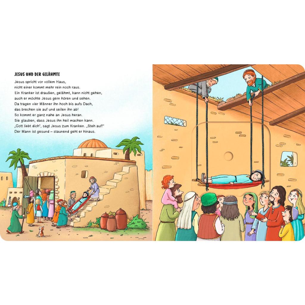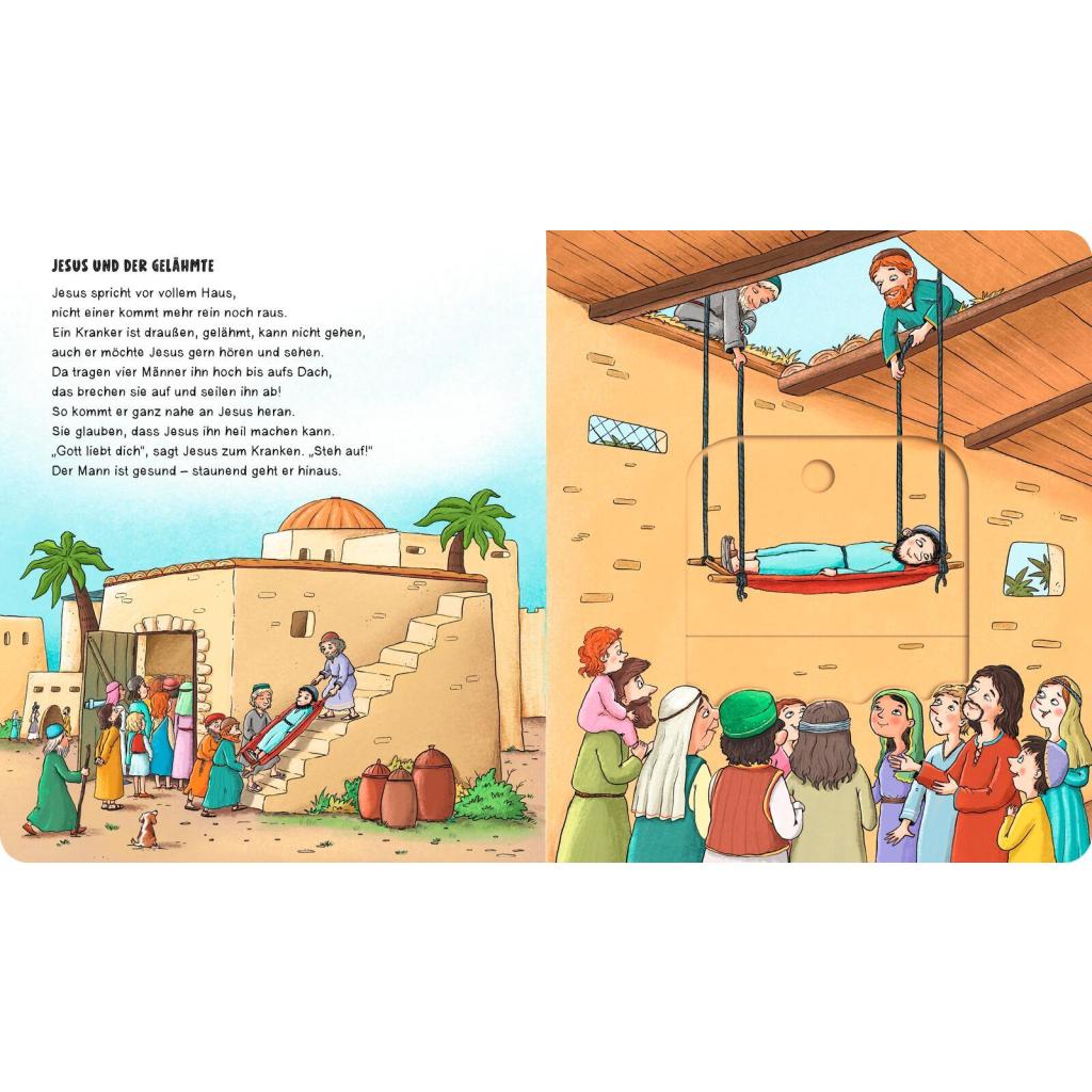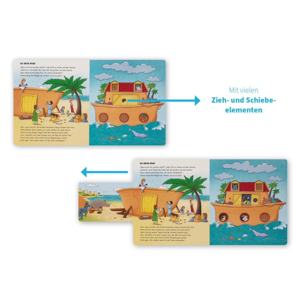 . Erste Kinderbibel zum Mitmachen mit 6 Spieleffekten . Spielspaß mit vielen Zieh- und Schiebeelementen . Gereimter Text In diesem interaktiven Pappbilderbuch entdecken Kinder ab 18 Monaten die Bibel-Geschichten ganz spielerisch: Einmal ziehen und schon geht der Regenbogen über der Arche Noah auf. Bei der Schöpfung kommen die Tiere auf die Erde. Die Kleinkinder werfen einen Blick in den Bauch des Wals, seilen den Kranken vom Dach ab, finden mit dem Hirten das verlorene Schäfchen. Und zuletzt können sie die Kinder zu Jesus kommen lassen. Bekannte Geschichten, interaktive Spiel-Elemente, mit denen Kinder ihre Wahrnehmung und Motorik trainieren, kindgerechte Reime und ansprechenden Bilder machen das Buch zu einem hervorragenden Geschenk, nicht nur zur Taufe. Von der Autorin von "Meine kleine Arche Noah".