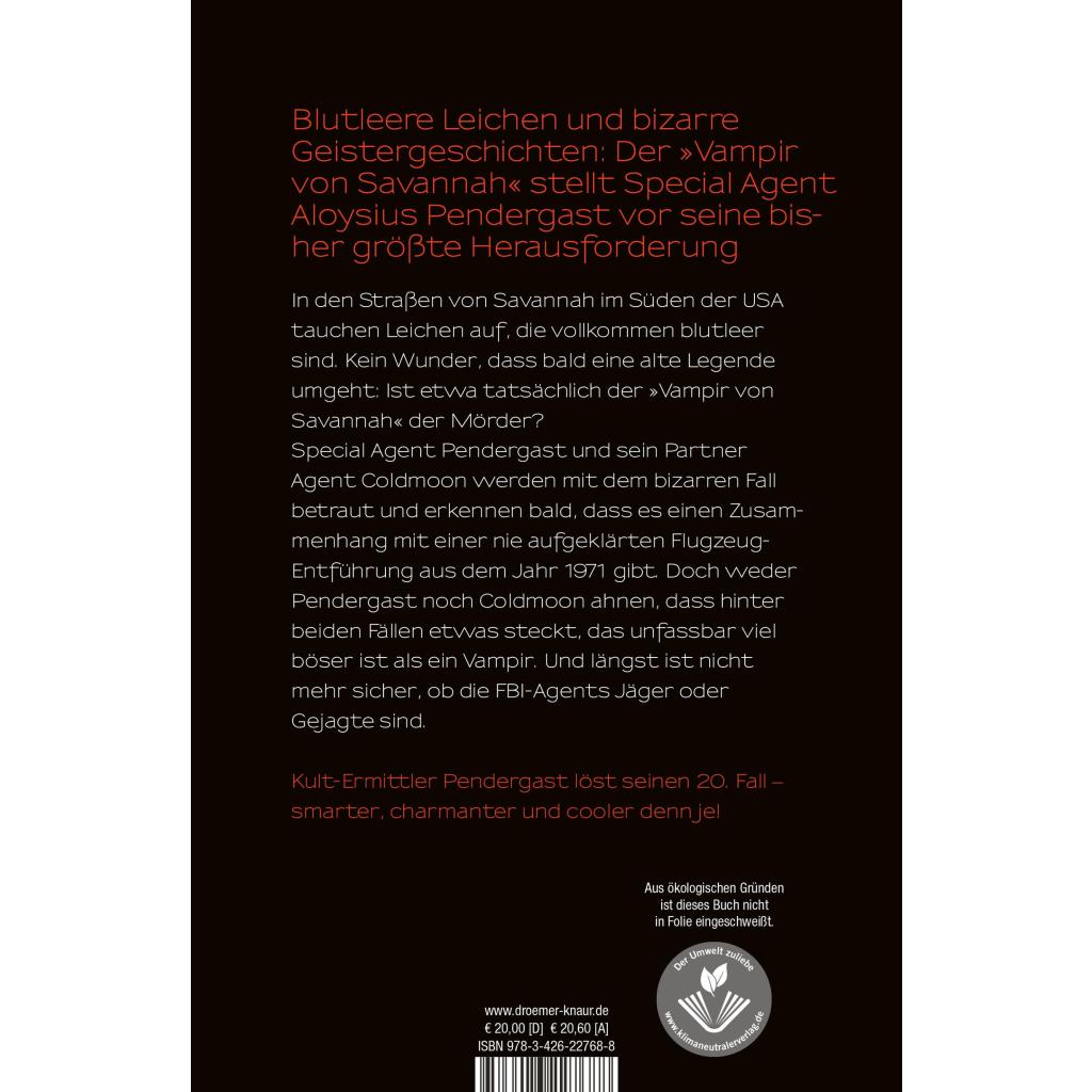 Was ist noch blutgieriger als ein Vampir? Brandheiße Action trifft eiskalte Spannung im 20. Abenteuer-Thriller mit Kult-Ermittler Aloisius Pendergast, dem berühmtesten Special Agent des FBI. In den Straßen von Savannah im Süden der USA tauchen Leichen auf, die vollkommen blutleer sind. Kein Wunder, dass eine alte Legende der Stadt plötzlich nicht nur wohligen Grusel verursacht: Geht etwa tatsächlich der 'Vampir von Savannah' um? Special Agent Pendergast und sein Partner Agent Coldmoon werden mit dem bizarren Fall betraut und erkennen bald, dass es einen Zusammenhang mit einer nie aufgeklärten Flugzeug-Entführung aus dem Jahr 1971 gibt. Doch weder Pendergast noch Coldmoon ahnen, dass hinter beiden Fällen etwas steckt, das unfassbar viel böser ist als ein Vampir. Und längst ist nicht mehr sicher, ob die FBI-Agents Jäger oder Gejagte sind. 'Pendergast [ist] eine Mischung aus Holmes und Bond [...].' Frankfurter Neue Presse über den Pendergast-Thriller 'Labyrinth - Elixier des Todes' Die Abenteuer-Thriller mit Special Agent Aloisius Pendergast sind in folgender Reihenfolge erschienen: 1. Relic - Museum der Angst 2. Attic - Gefahr aus der Tiefe 3. Formula - Tunnel des Grauens 4. Ritual - Höhle des Schreckens 5. Burn Case - Geruch des Teufels 6. Darc Secret - Mörderische Jagd 7. Maniac - Fluch der Vergangenheit 8. Darkness - Wettlauf mit der Zeit 9. Cult - Spiel der Toten 10. Fever - Schatten der Vergangenheit 11. Revenge - Eiskalte Täuschung 12. Fear - Grab des Schreckens 13. Attac - Unsichtbarer Feind 14. Labyrinth - Elixier des Todes 15. Demon - Sumpf der Toten 16. Obsidian - Kammer des Bösen 17. Headhunt - Feldzug der Rache 18. Grave - Verse der Toten 19. Ocean - Insel des Grauens 20. Bloodless - Grab des Verderbens