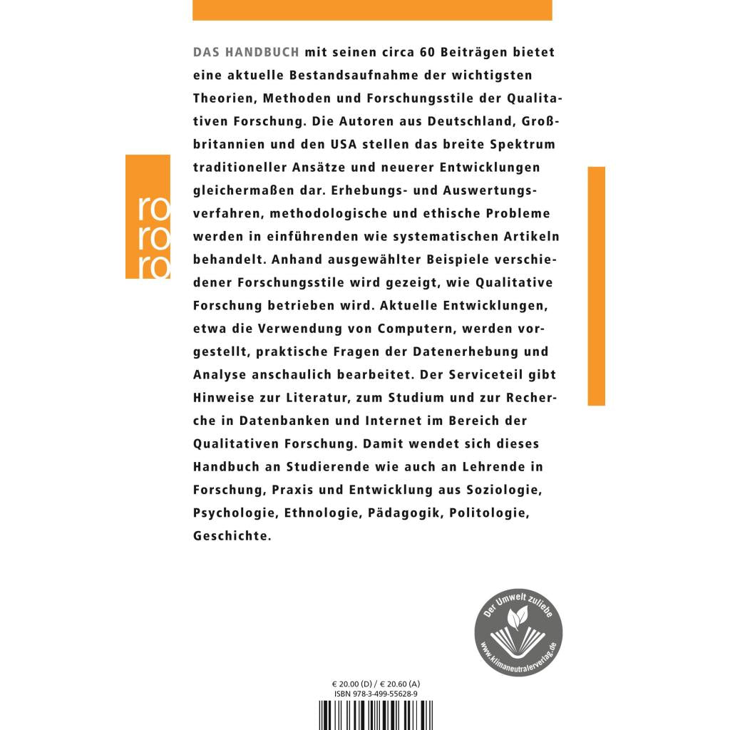 Das Handbuch mit seinen circa 60 Beiträgen bietet eine aktuelle Bestandsaufnahme der wichtigsten Theorien, Methoden und Forschungsstile der Qualitativen Forschung. Die Autoren aus Deutschland, Großbritannien und den USA stellen das breite Spektrum traditioneller Ansätze und neuerer Entwicklungen gleichermaßen dar. Erhebungs- und Auswertungsverfahren, methodologische und ethische Probleme werden in einführenden wie systematischen Artikeln behandelt. Anhand ausgewählter Beispiele verschiedener Forschungsstile wird gezeigt, wie Qualitative Forschung betrieben wird. Aktuelle Entwicklungen, etwa die Verwendung von Computern, werden vorgestellt, praktische Fragen der Datenerhebung und Analyse anschaulich bearbeitet. Der Serviceteil gibt Hinweise zur Literatur, zum Studium und zur Recherche in Datenbanken und Internet im Bereich der Qualitativen Forschung. Damit wendet sich dieses Handbuch an Studierende wie auch an Lehrende in Forschung, Praxis und Entwicklung aus Soziologie, Psychologie, Ethnologie, Pädagogik, Politologie, Geschichte.