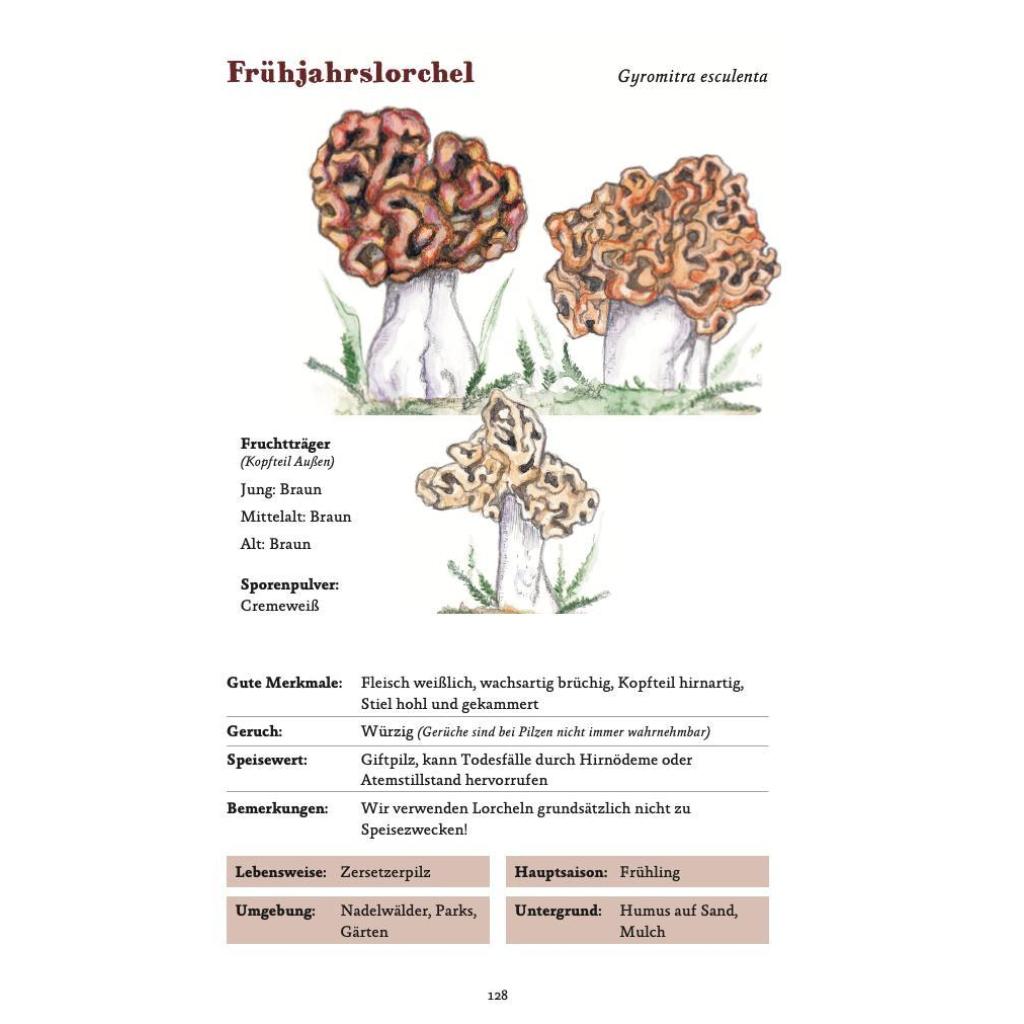 Pfifferling, Fliegenpilz, Krause Glucke Lassen Sie sich in die faszinierende Welt der Pilze entführen: In beeindruckenden, handgezeichneten Aquarellen von Hilke Käsebier und fachkundigen Erläuterungen des eifeler Pilzsachverständigen Thomas Regnery präsentiert dieses Buch auf eindrucksvolle Art und Weise die häufigsten Pilzarten der deutschen Mittelgebirge. Mit diesem Buch wird schon die Vorbereitung zum Pilze sammeln ein literarisches Vergnügen. Ohne 'Restfurcht' Pilze sammeln Ständig diese Sorge, sich beim Pilzesammeln vielleicht vertan zu haben! Wann kann ich mir sicher sein, einen Pilz wirklich erkannt zu haben, damit ich ihn ohne 'Restfurcht' in meine Pfanne schnippeln kann? Um die wichtigsten Speise- und Giftpilze zu erkennen, bedarf es keiner streng wissenschaftlichen Vorgehensweise. Viele Pilze lassen sich anhand feiner, doch zuverlässiger Merkmale identifizieren. Diese sind oft so verblüffend klar, dass man sich anschließend fragt: Wieso hat mir das noch nie einer erklärt? In diesem Buch stellt der Eifeler Pilzsachverständige Thomas Regnery nicht nur die häufigsten Pilzarten seiner Heimat, der Eifel, vor - er erklärt zusätzlich anhand von Bestimmungstafeln, auf welche konkreten Merkmale Sie achten müssen. In einem separaten Textteil erzählt er 'aus dem Nähkästchen': Was das Besondere an Pilzen ist, wie man ihre speziellen Eigenschaften zum Auffinden nutzen kann, und woran es bisher gelegen haben kann, wenn eine Pilzwanderung nicht so erfolgreich verlief. Grundsätzlich bleibt natürlich große dennoch Vorsicht vor Verwechslung geboten - und dabei ist dieses Buch eine große Hilfe. Dennoch ein wichtiger Hinweis! Lassen Sie Ihre Pilzfunde unbedingt von einem zertifizierten Pilzsachverständigen bestimmen! Pilzsachverständige in Ihrer Nähe finden Sie beim Verein Deutsche Gesellschaft für Mykologie e.V. Die handgezeichneten Illustrationen von Hilke Käsebier zeigen Pilze und Ihre Merkmale aus einer einzigartigen und außergewöhnlich gut nachzuvollziehenden Perspektive, mit Blick auf deren Besonderheiten.