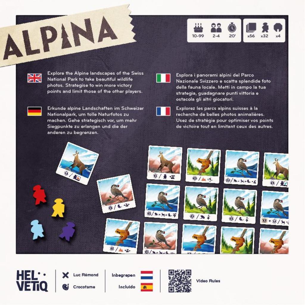 Erkundet den Schweizer Nationalpark mit der Kamera um den Hals, um Tiere in ihrem natürlichen Lebensraum zu fotografieren. Der gepunktete Nussknacker, das Wahrzeichen des Parks, Gämse und Grasfrösche warten auf euch und bieten euch eine einzigartige Gelegenheit, auf originelle Weise Punkte zu sammeln, die mit der Landschaft und der Interaktion mit euren Nachbarn zusammenhängen. Alpina ist ein Strategiespiel mit einfachen Regeln. Spielt ihr eine Karte, um mehr Punkte zu sammeln, oder nutzt ihr die Gelegenheit, um eure Gegner hinters Licht zu führen? Findet die Karte, die es euch ermöglicht, zwischen diesen beiden Zielsetzungen eine Balance zu finden, und der Sieg wird euch gehören!