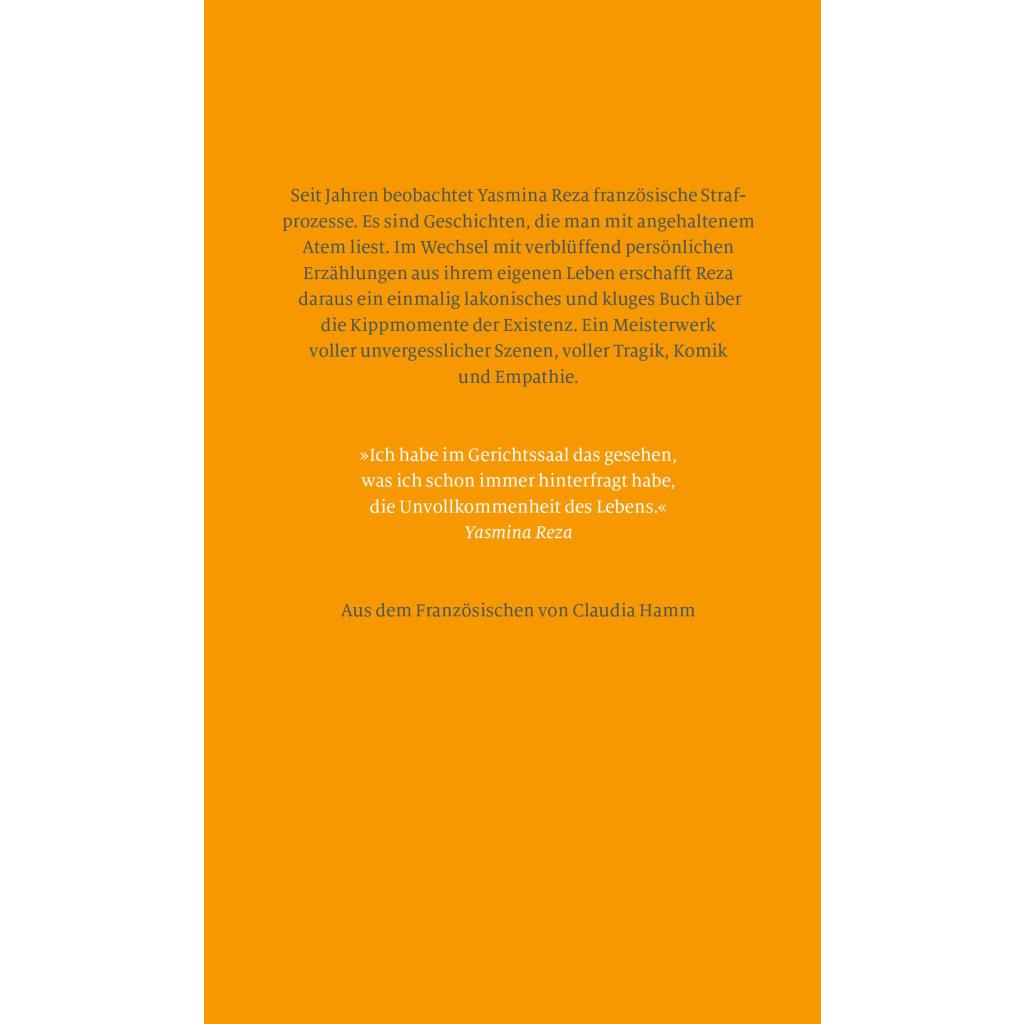 Nur Yasmina Reza schreibt so lakonisch und klug über die Kippmomente der Existenz Seit Jahren beobachtet Yasmina Reza Strafprozesse. Es sind Geschichten, die man mit angehaltenem Atem liest. Ein Mann ermordet die vierköpfige Familie seines Schwagers und legt die Leichenteile seiner Frau zu Füßen. Eine Frau klagt wegen Vergewaltigung und schreibt dem Täter danach glühende Liebesbriefe. Lakonisch und beinahe zärtlich porträtiert Reza die Menschen. Es geht nicht um Schuld oder Unschuld, sondern um den Moment, in dem ein Leben aus der Normalität kippt. Ebenso knapp und eindrucksvoll erzählt sie von persönlichen Begegnungen mit guten Freunden oder in der Familie. Reza zeigt "die Rückseite des Lebens, in seiner Unvollkommenheit, aber auch Heiterkeit". Ein Meisterwerk voller Tragik, Komik und Empathie.