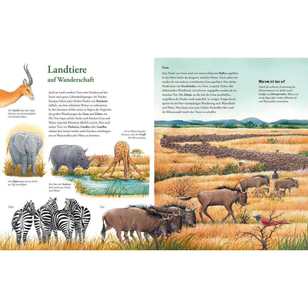 Ein kleiner Storch auf seiner ersten Reise ins Winterlager! Der kleine Storch beginnt zum ersten Mal die aufregende, große Reise über Berge und Meer Richtung Süden. Dabei trifft er auf Tiere, die ebenfalls auf langen Wegen um die Erde unterwegs sind: Vögel, Schmetterlinge, Meeresschildkröten, Gnus ... In großen Naturillustrationen und detailreichen Infoseiten nimmt Susanne Riha alle neugierigen Entdeckerinnen und Entdecker mit auf eine beeindruckende Tierwanderung ins Winterlager. Auf illustrierten Karten können die Reisen der verschiedenen Tiere nachvollzogen werden. Für alle Entdeckerinnen und Entdecker ab 5 Jahren: große Naturbilder und spannende Infos zu den beeindruckenden Reisen der Tiere!