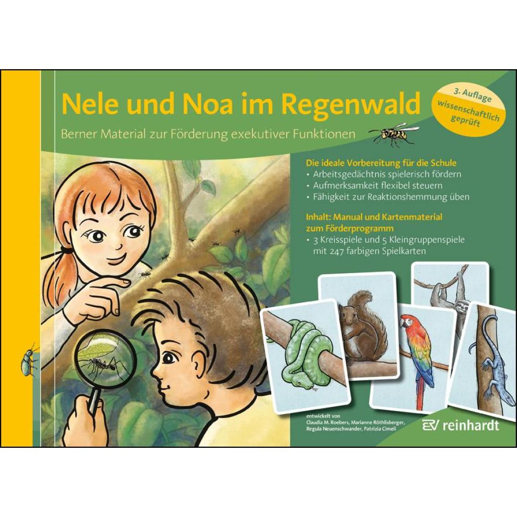 Exekutive Funktionen sind immer dann wichtig, wenn Aufgaben neu oder komplex sind oder wenn es z.B. darauf ankommt, Reihenfolgen einzuhalten. Für die kognitive und soziale Entwicklung, für die Schulfähigkeit und für schulische Leistungen eines Kindes spielen sie eine zentrale Rolle. Dazu gehören die Fähigkeit zur Reaktionshemmung, das Arbeitsgedächtnis und eine flexible Aufmerksamkeitssteuerung. Die Spielebox enthält das Kartenmaterial zum Förderprogramm "Nele und Noa im Regenwald". Die Materialien bestehen aus bunt illustrierten Spielkarten für Kinder zwischen vier und acht Jahren, die Spiele sind in eine Rahmengeschichte eingebettet. Es kann ein sechswöchiges Trainingsprogramm mit täglichen Einheiten durchgeführt werden, die Spiele können aber auch einzeln gespielt werden. Das Manual zur Spielebox bietet Hintergrundinformationen sowie verständliche, detaillierte Anleitungen und enthält weitere Spiele und Übungen. Auf der Website des Verlags stehen ergänzend dazu Dateien mit 55 Arbeitsblättern und 55 Lösungsblättern zur Individualförderung zur Verfügung.