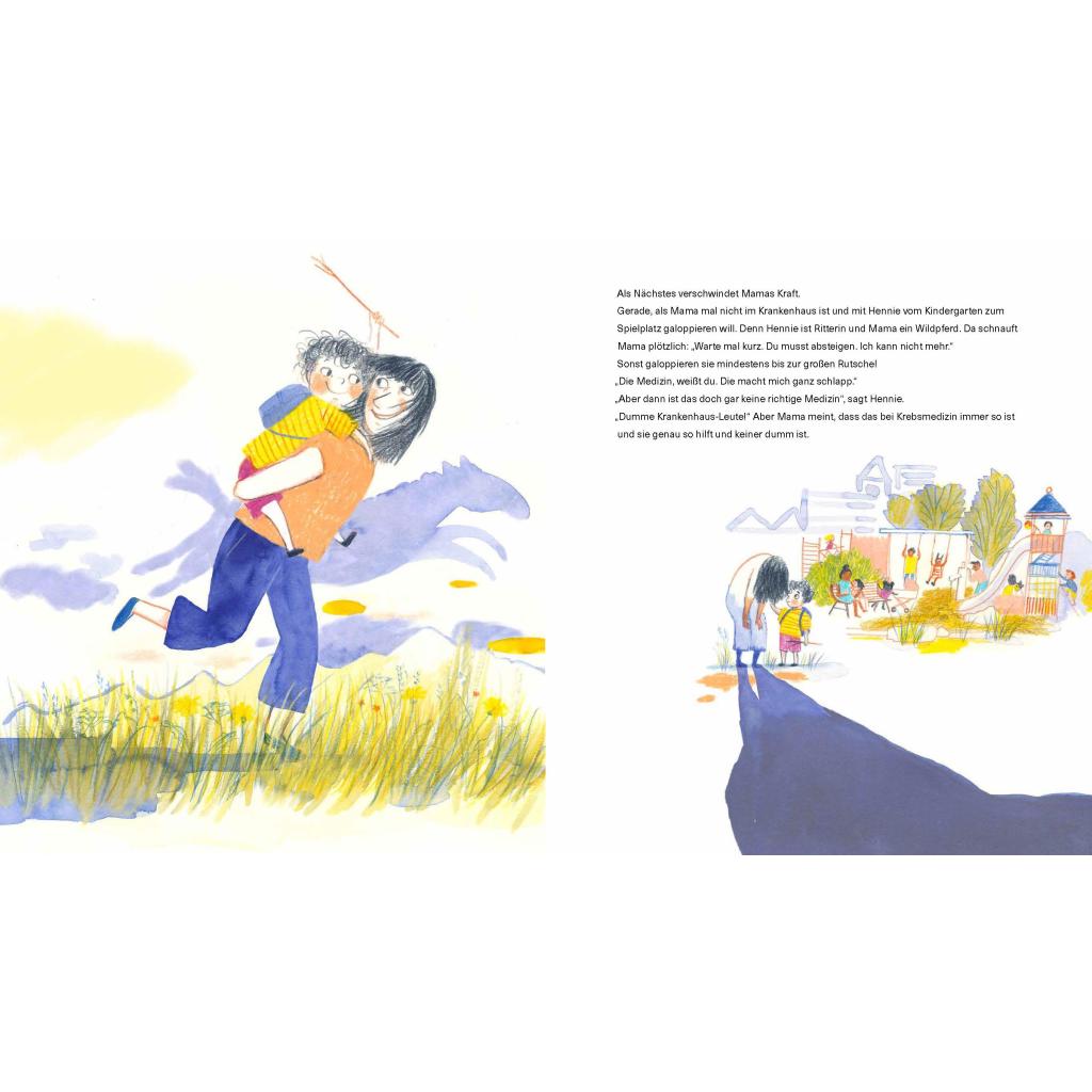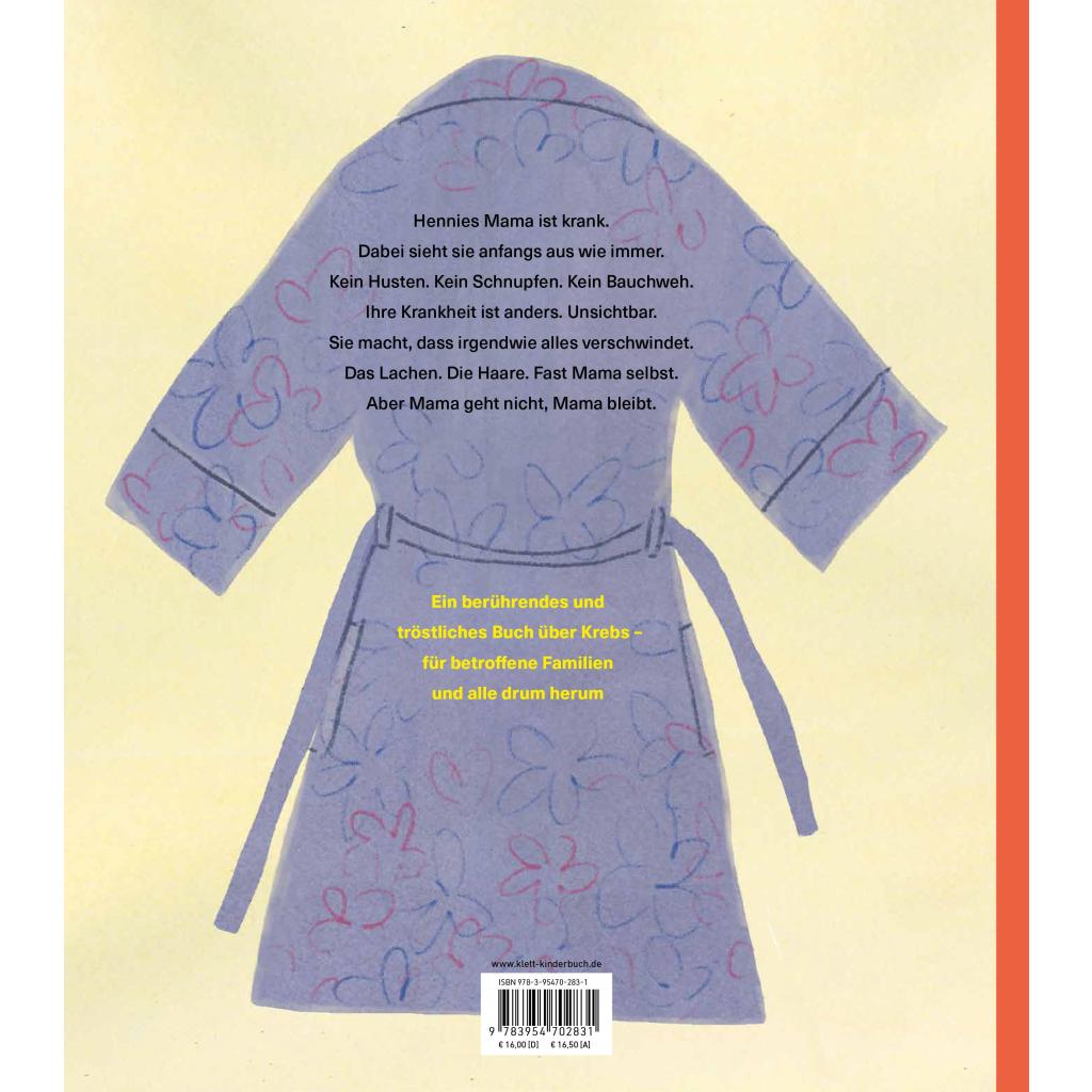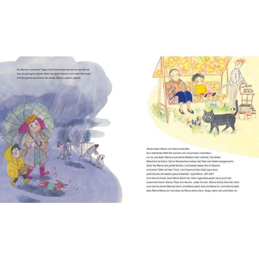 Hennies Mama ist krank. Dabei sieht sie anfangs aus wie immer. Kein Husten. Kein Schnupfen. Kein Bauchweh. Kein Auf-dem-Sofa-Liegen, Fernsehen und dann ist alles wieder gut. Mamas Kranksein ist anders. Unsichtbar. Der Krebs macht, dass irgendwie alles verschwindet. Erst die Wörter, dann das Lachen, Mamas Appetit und Mamas Haare. Bis sogar Mama selbst fast verschwindet. Aber Hennie und Mama finden einen geheimen Trick, um Mama sichtbar zu machen. Julia Rosenkranz ist ein starker, ehrlicher Text gelungen, über eine Familie in der Krise und ihren gemeinsamen Weg hindurch. Die Künstlerin Nele Palmtag begleitet die dichte, einfache Geschichte mit warmen, ausdrucksstarken Aquarell- und Buntstiftbildern. Ein berührend schönes und tröstliches Buch zum Thema Brustkrebs - für betroffene Familien und alle drum herum Preise und Auszeichnungen: Auf der Longlist für den HUCKEPACK-Bilderbuchpreis 2024
