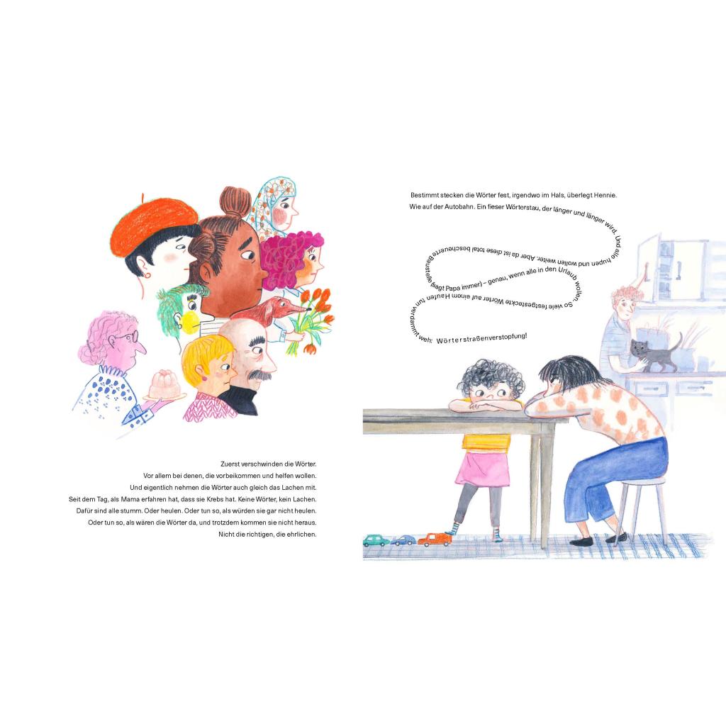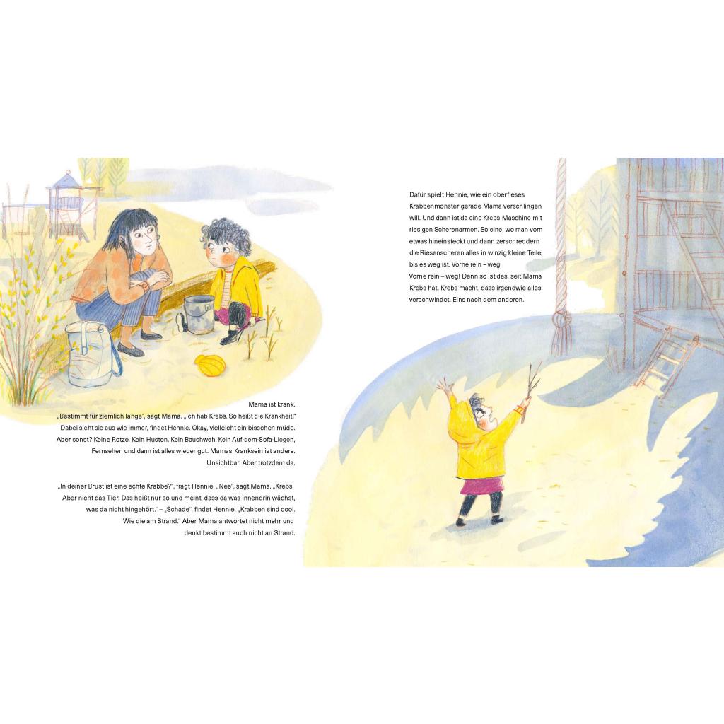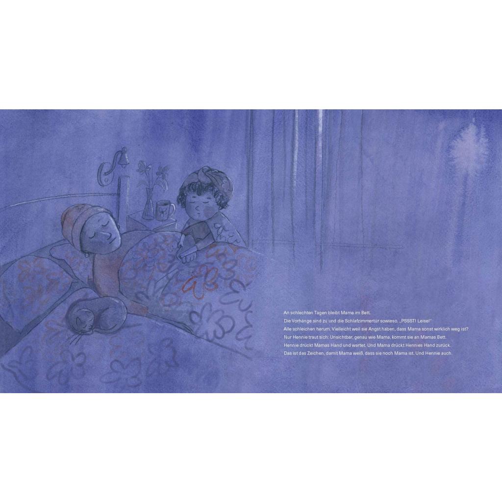 Hennies Mama ist krank. Dabei sieht sie anfangs aus wie immer. Kein Husten. Kein Schnupfen. Kein Bauchweh. Kein Auf-dem-Sofa-Liegen, Fernsehen und dann ist alles wieder gut. Mamas Kranksein ist anders. Unsichtbar. Der Krebs macht, dass irgendwie alles verschwindet. Erst die Wörter, dann das Lachen, Mamas Appetit und Mamas Haare. Bis sogar Mama selbst fast verschwindet. Aber Hennie und Mama finden einen geheimen Trick, um Mama sichtbar zu machen. Julia Rosenkranz ist ein starker, ehrlicher Text gelungen, über eine Familie in der Krise und ihren gemeinsamen Weg hindurch. Die Künstlerin Nele Palmtag begleitet die dichte, einfache Geschichte mit warmen, ausdrucksstarken Aquarell- und Buntstiftbildern. Ein berührend schönes und tröstliches Buch zum Thema Brustkrebs - für betroffene Familien und alle drum herum Preise und Auszeichnungen: Auf der Longlist für den HUCKEPACK-Bilderbuchpreis 2024