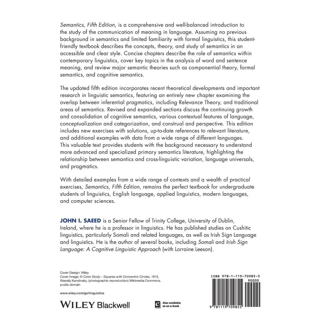The latest edition of the bestselling introduction to the field of linguistic semantics, updated throughout and featuring a wholly new chapter on inferential pragmatics Semantics, Fifth Edition, is a comprehensive and well-balanced introduction to the study of the communication of meaning in language. Assuming no previous background in semantics and limited familiarity with formal linguistics, this student-friendly textbook describes the concepts, theory, and study of semantics in an accessible and clear style. Concise chapters describe the role of semantics within contemporary linguistics, cover key topics in the analysis of word and sentence meaning, and review major semantic theories such as componential theory, formal semantics, and cognitive semantics. The updated fifth edition incorporates recent theoretical developments and important research in linguistic semantics, featuring an entirely new chapter examining the overlap between inferential pragmatics and Relevance Theory, truth-conditional meaning, and other traditional areas of semantics. Revised and expanded sections discuss the continuing growth and consolidation of cognitive semantics, various contextual features of language, conceptualization and categorization, and construal and perspective. This edition includes new exercises with solutions, up-to-date references to relevant literature, and additional examples with data from a wide range of different languages. * Covers basic concepts and methods as well as key theoretical models, current lines of research, and important writers * Explains general concepts in semantics before gradually moving to more advanced topics in semantic description and theoretical approaches * Highlights the relation between cross-linguistic variation and language universals * Provides students with the background necessary to understand more advanced and specialized primary semantics literature * Includes a glossary of technical terms and numerous exercises arranged by level of difficulty * Highlights the relationship between semantics and cross-linguistic variation, language universals, and pragmatics With detailed examples from a wide range of contexts and a wealth of practical exercises, Semantics, Fifth Edition, remains the perfect textbook for undergraduate students of linguistics, English language, applied linguistics, modern languages, and computer sciences.