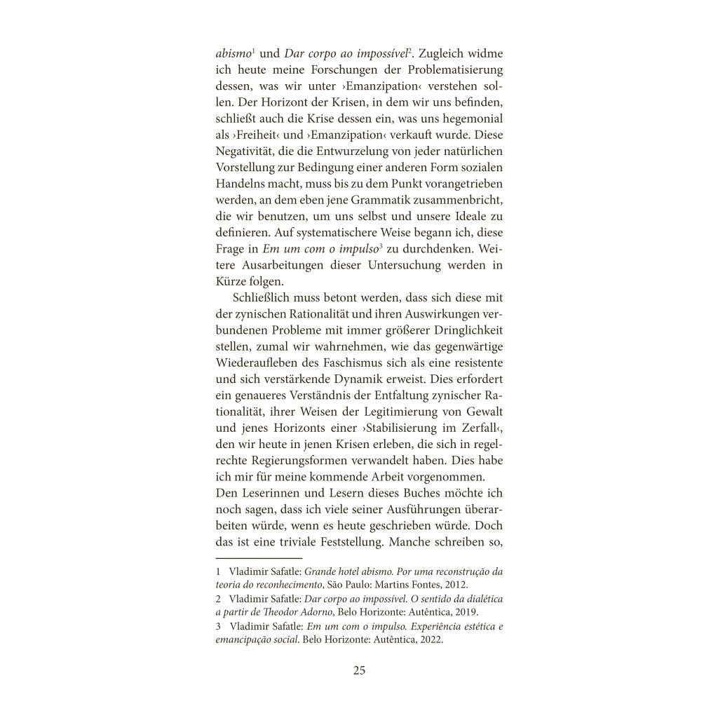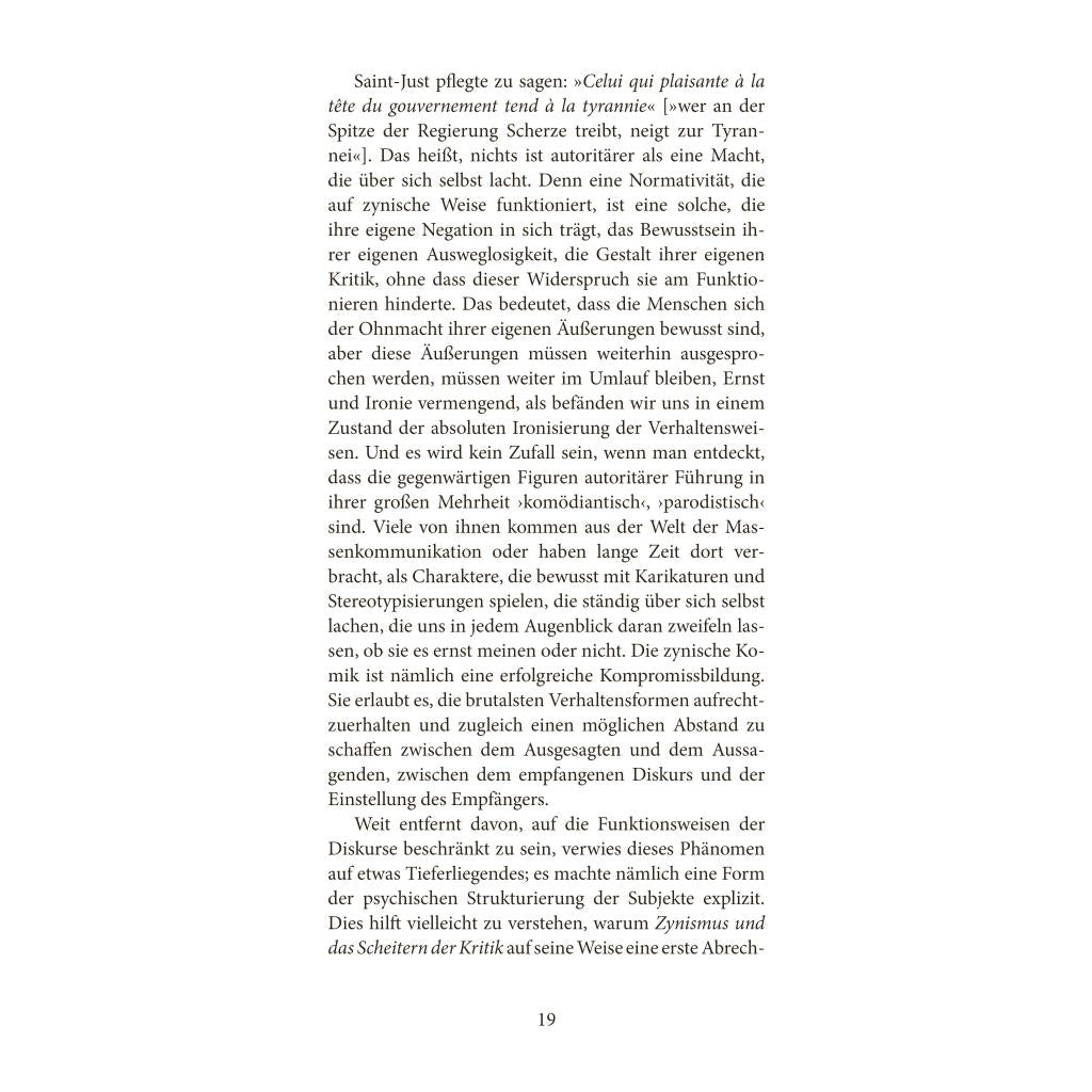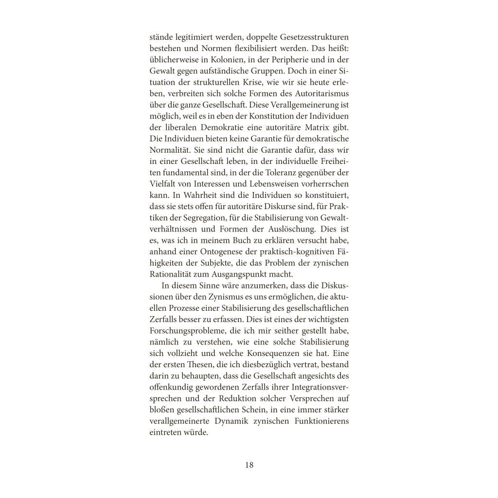 Warum gelingt es autoritären Bewegungen heute so leicht, liberale Demokratien zu unterwandern? Der Philosoph und Psychoanalytiker Vladimir Safatle, einer der bekanntesten Intellektuellen Brasiliens und Protagonist des Widerstands gegen die Regierung Bolsonaro, liefert eine bestechende Diagnose: Der ¿neue Faschismus¿ ist nicht einfach ein Rückfall in archaische Gesellschaftsmuster; seine Wirksamkeit beruht vielmehr auf der Verallgemeinerung einer neuen, zynischen Form der Rationalität, die sich in den liberalen Demokratien selbst herausgebildet hat. Zynismus ist damit nicht nur als rhetorische Figur zu verstehen oder als eine subjektive, moralisch verwerfliche Haltung; er bildet vielmehr die rationale Struktur einer Gesellschaft im Zerfall, die im uneigentlichen Sprechen, in der selbstironischen Verleugnung ihre Überlebensstrategie gefunden hat. Nach Safatle hat dies tiefgreifende Konsequenzen für den Status der Kritik: Gegenüber einer ¿zynischen Vernunft¿, die aus ihrer eigenen Kritik einen Witz macht, ist klassische Ideologiekritik machtlos geworden. Umso mehr kommt es darauf an, eine neue Art der Kritik zu entwickeln, eine Kritik, die, wie Safatle sagt, 'gegenwärtig in erster Linie eine Kritik der Ironie sein muss'. ZYNISMUS UND DAS SCHEITERN DER KRITIK ist ein philosophisches Schlüsselwerk zum Verständnis unserer politischen Gegenwart, das nun erstmals auf Deutsch zu entdecken ist.