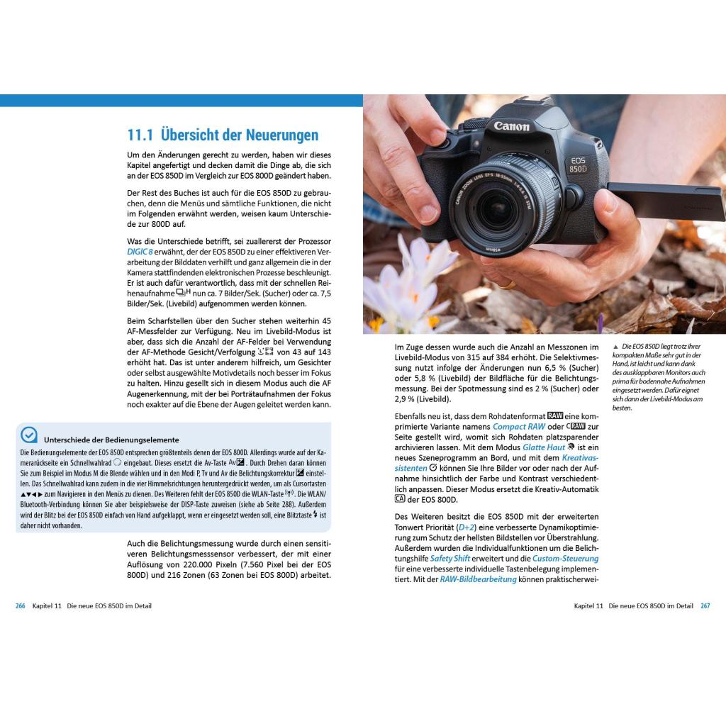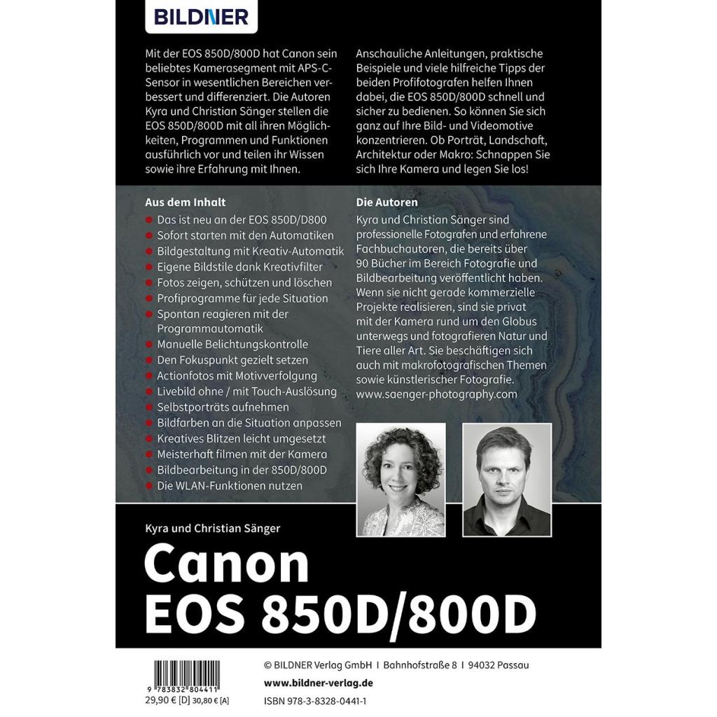 Mit der EOS 800D/850D hat Canon sein beliebtes Kamerasegment mit APS-C-Sensor in wesentlichen Bereichen verbessert und differenziert. Die Autoren Kyra und Christian Sänger stellen die EOS 800D/850D mit all ihren Möglichkeiten , Programmen und Funktionen ausführlich vor und teilen ihr Wissen sowie ihre Erfahrung mit Ihnen. Anschauliche Anleitungen, praktische Beispiele und viele hilfreiche Tipps der beiden Profifotografen helfen Ihnen dabei, die EOS 800D/850D schnell und sicher zu bedienen . So können Sie sich ganz auf Ihre Bild- und Videomotive konzentrieren. Ob Porträt, Landschaft, Architektur oder Makro: Schnappen Sie sich Ihre Kamera und legen Sie los! Autofokus, Belichtung und spezielle Funktionen im Detail Profitipps zu Programmen, Einstellungen, Effekten u.v.m. Aus dem Inhalt: Das ist neu an der EOS 800D/850D Sofort starten mit den Automatiken Bildgestaltung mit Kreativ-Automatik Eigene Bildstile dank Kreativfilter Fotos zeigen, schützen und löschen Profiprogramme für jede Situation Spontan reagieren mit der Programmautomatik Manuelle Belichtungskontrolle Den Fokuspunkt gezielt setzen Actionfotos mit Motivverfolgung Livebild ohne / mit Touch-Auslösung Selbstporträts aufnehmen Bildfarben an die Situation anpassen Kreatives Blitzen leicht umgesetzt Meisterhaft filmen mit der Kamera Bildbearbeitung in der 800D/850D Die WLAN-Funktionen nutzen