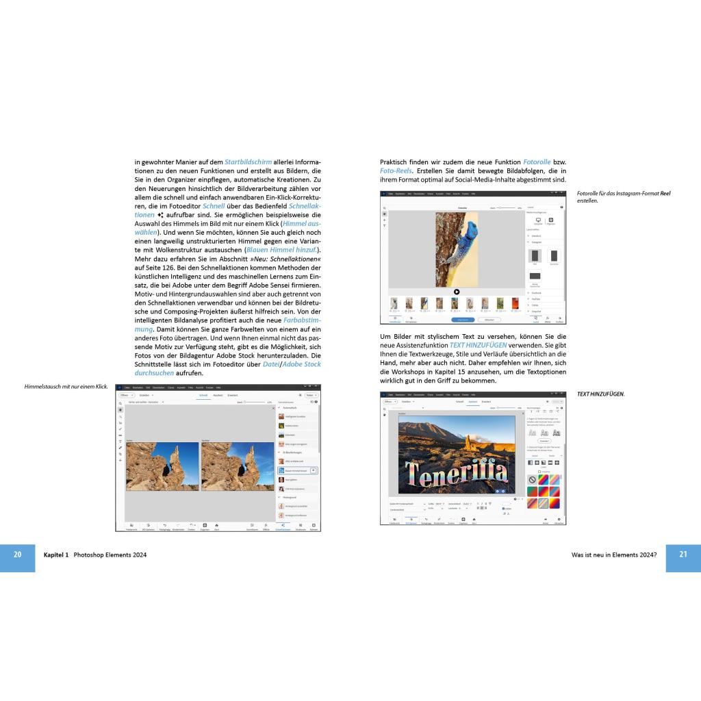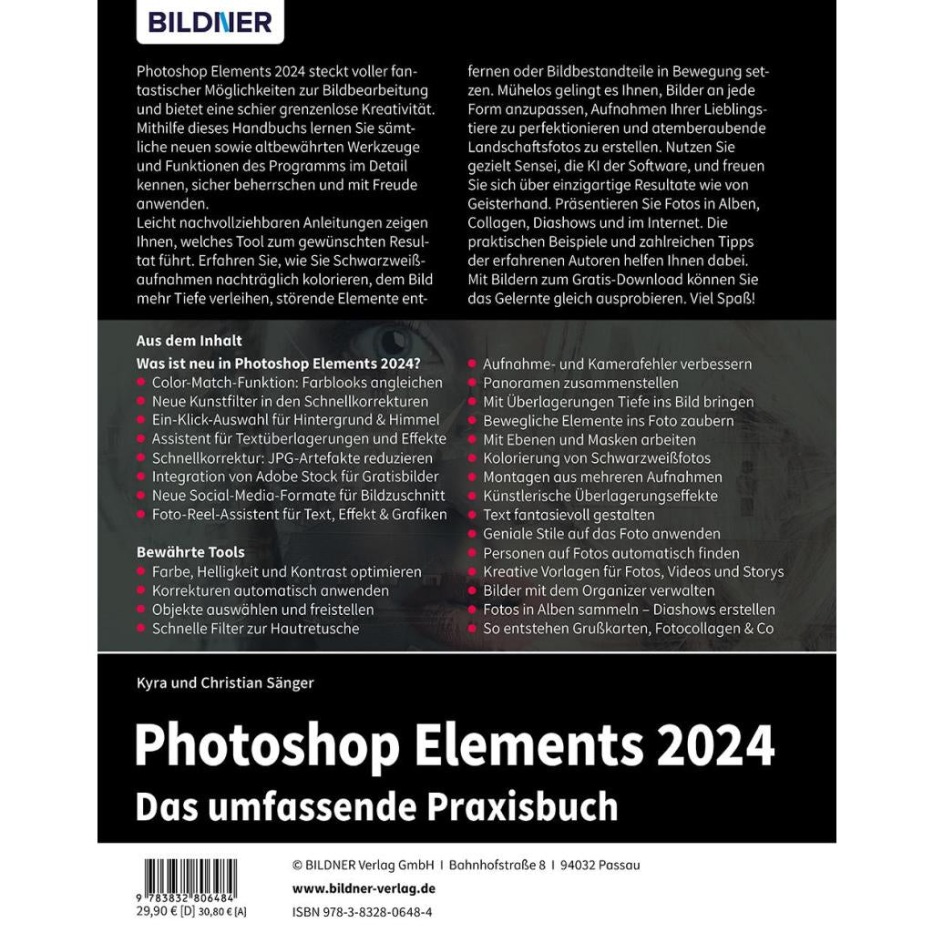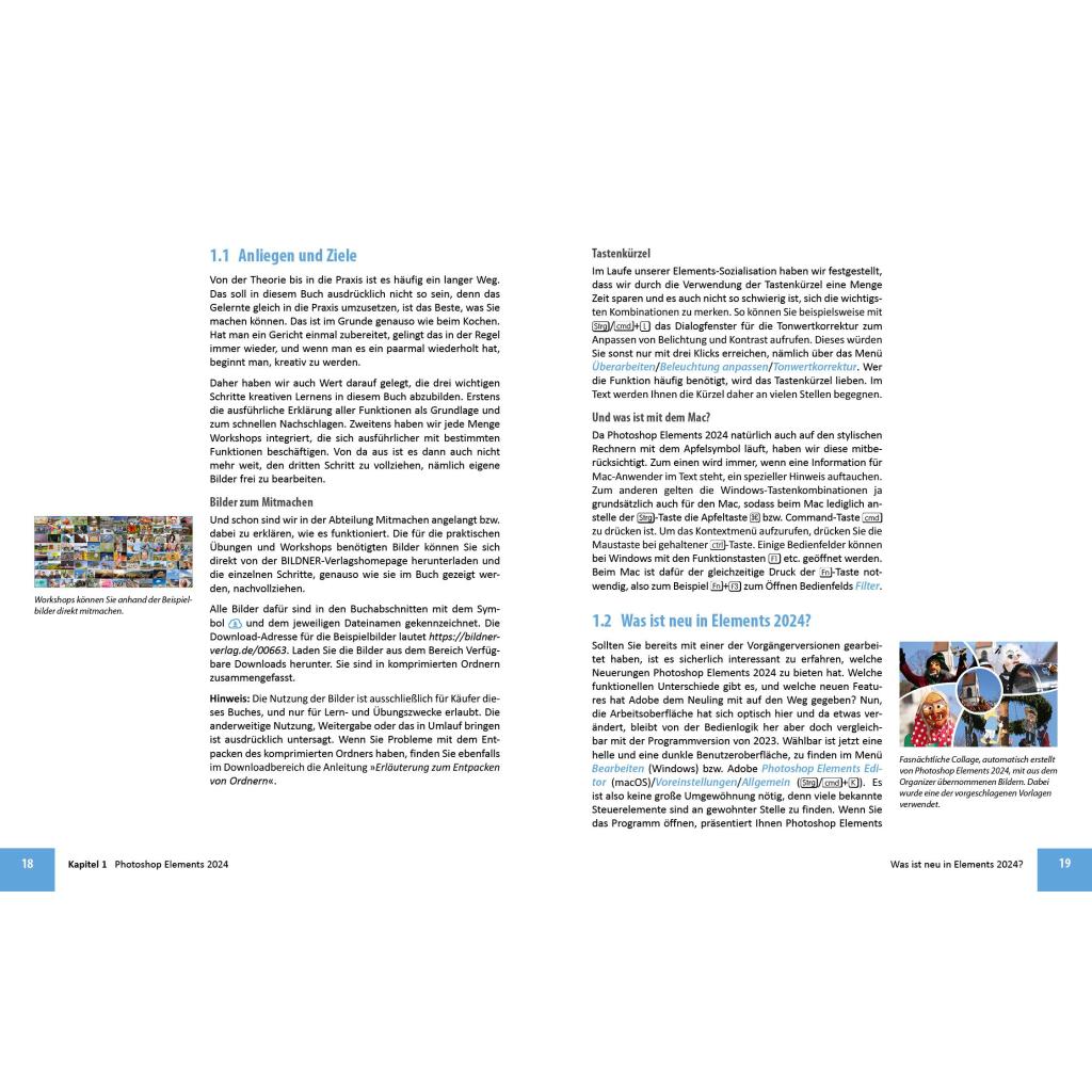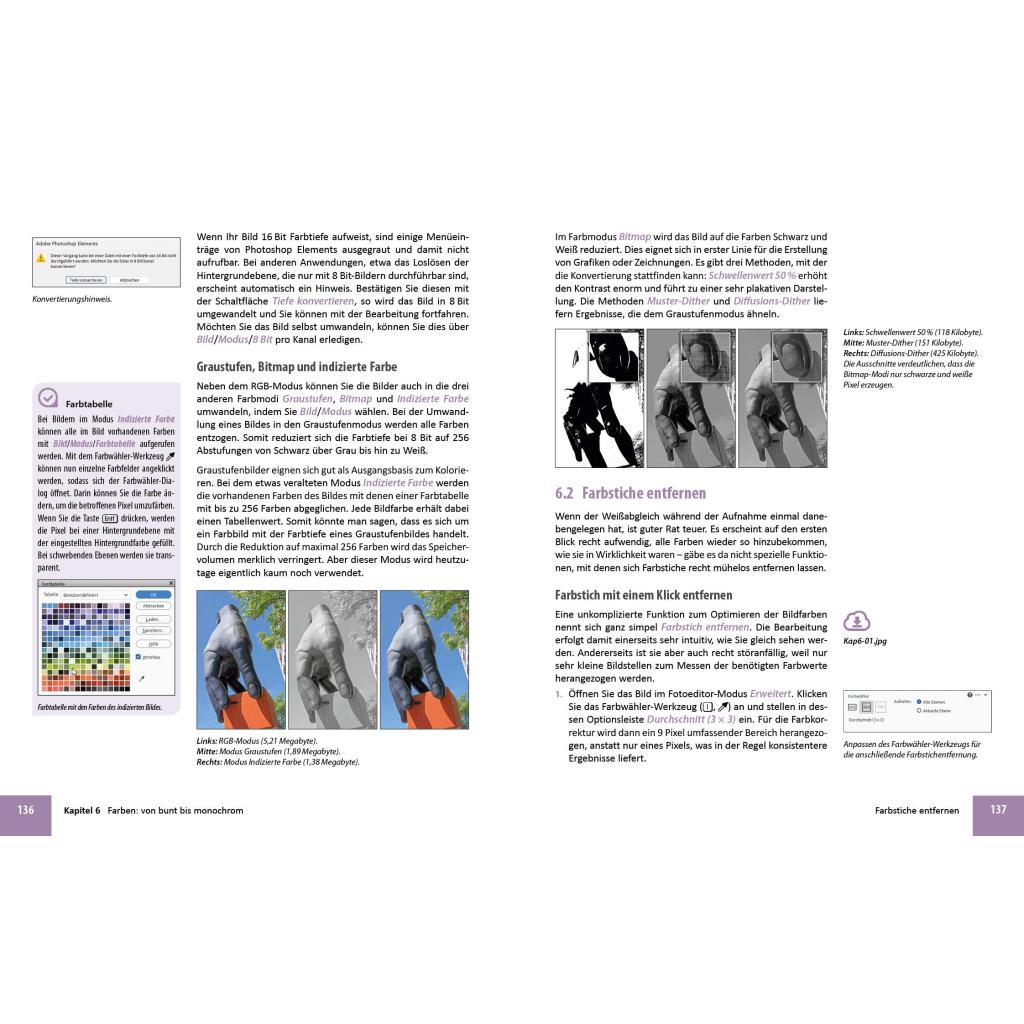 Die perfekte Bildbearbeitung Schritt für Schritt erklärt Kreative Foto-Reels, Composings, Alben, Collagen u. v. m. erstellen Mit kostenlosen Download-Beispielbildern, damit Sie sofort loslegen können Entdecken Sie die Welt der Bildbearbeitung mit Photoshop Elements 2024 völlig neu! Ob für Einsteiger oder erfahrene Anwender: Dieses Buch bietet Ihnen einen umfassenden Einblick in die umfangreichen Funktionen und Werkzeuge der Software. Von den Grundlagen bis hin zu fortgeschrittenen Techniken finden Sie hier alles, um Ihre kreativen Visionen lebendig werden zu lassen und Ihre Aufnahmen auf ein einzigartiges Niveau anzuheben. Optimieren Sie mithilfe des Organizers und des Fotoeditors Ihren Workflow. Tauchen Sie in die Kunst des Farbmanagements ein und entdecken Sie, wie Sie mit nur einem Klick beeindruckende Effekte erzielen, die Belichtung anpassen, automatische Korrekturen vornehmen und Bilder retuschieren. Anschauliche Anleitungen zeigen, wie Sie mit Masken und Ebenen arbeiten und Adobe Sensei, die KI der Software, gezielt einsetzen. Zudem lernen Sie, wie Sie Composings und Collagen erstellen und Ihre Ergebnisse eindrucksvoll präsentieren. Mit praktischen Tipps rund um Tastaturkürzel, Anordnung der Bedienfelder und vorgefertigte Aktionen wird die Bearbeitung Ihrer Fotos zum Kinderspiel. Viel Spaß beim Ausprobieren! . Aus dem Inhalt: Was ist neu in Photoshop Elements 2024? Bildlooks per Farbabstimmung angleichen Neue Kunstfilter in den Schnellkorrekturen Ein-Klick-Auswahl für Hintergrund & Himmel Assistent zum Hinzufügen von Text, Stilen und Verläufen Schnellaktionen für Ein-Klick-Korrekturen Integration von Adobe Stock für Gratisbilder Neue Social-Media-Formate für Bildzuschnitt Foto-Reel-Assistent für Text, Effekt & Grafiken Bewährte Tools Farbe, Helligkeit und Kontrast optimieren Korrekturen automatisch anwenden Objekte auswählen und freistellen Schnelle Filter zur Hautretusche Aufnahme- und Kamerafehler verbessern Panoramen zusammenstellen Mit Überlagerungen Tiefe ins Bild bringen Bewegliche Elemente ins Foto zaubern Mit Ebenen und Masken arbeiten Kolorierung von Schwarzweißfotos Montagen aus mehreren Aufnahmen Künstlerische Überlagerungseffekte Text fantasievoll gestalten Geniale Stile auf das Foto anwenden Personen auf Fotos automatisch finden Kreative Vorlagen für Fotos, Videos und Storys Bilder mit dem Organizer verwalten Fotos in Alben sammeln - Diashows erstellen So entstehen Grußkarten, Fotocollagen & Co