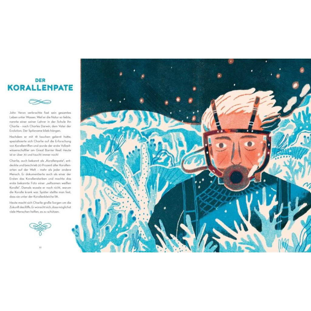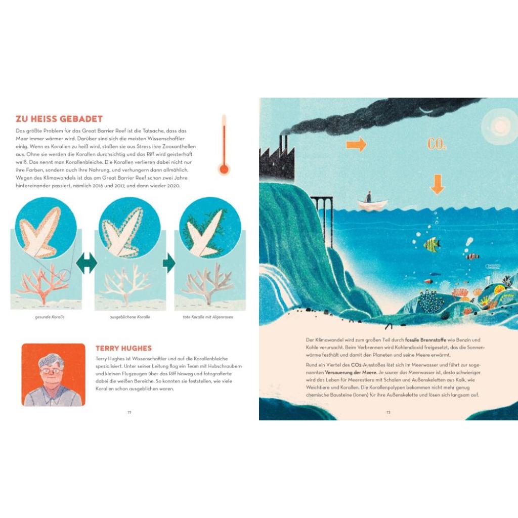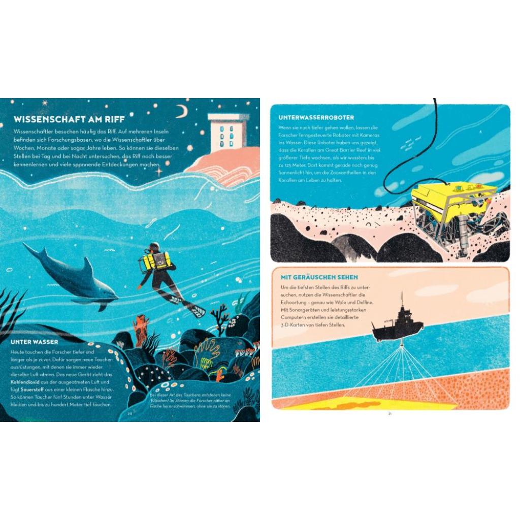 Das größte Korallenriff der Welt für Kinder erklärt Das Great Barrier Reef ist das größte Korallenriff der Welt. Es verläuft mehr als 2.300 Kilometer entlang der Küste Australiens und ist so groß wie 70 Millionen Fußballfelder. Dieses umfangreiche Sachbuch widmet sich ausführlich dem einzigartigen Naturwunder im Südpazifik. Wissenschaftlich fundiert erklärt es Kindern die Entstehung und Bedeutung des Korallenriffs, was Korallen eigentlich wirklich sind, welche großen, aber auch winzig kleinen Tiere es hier gibt und wie das Ökosystem Riff funktioniert. Außerdem erfahren wir in dem farbenfroh illustrierten Buch, wie die Menschen am Riff leben, wie es erforscht wird, welche Legenden sich um das Naturwunder ranken und was wir alle dazu beitragen können, dass die schillernde Unterwasserwelt des Great Barrier Reefs noch für unzählige weitere Generationen erhalten bleibt.