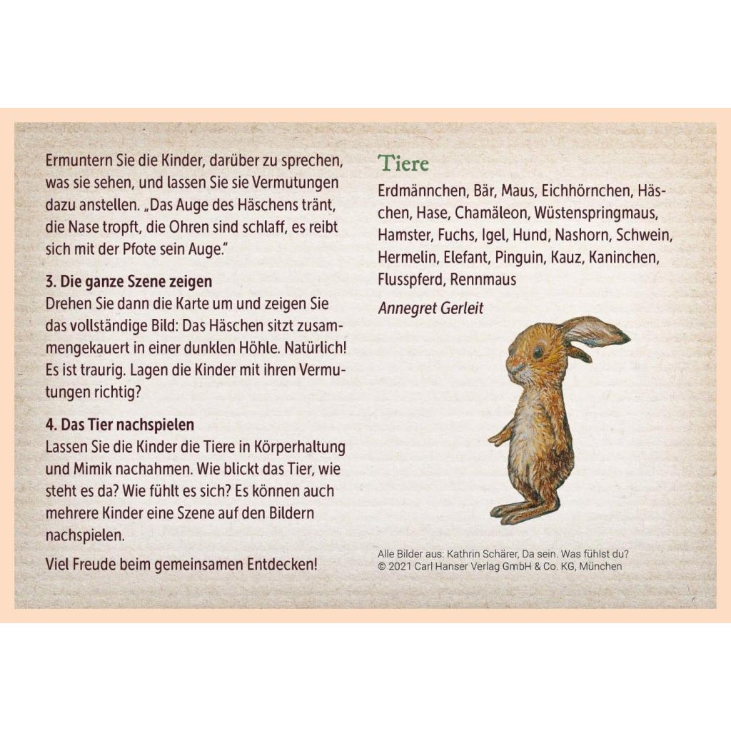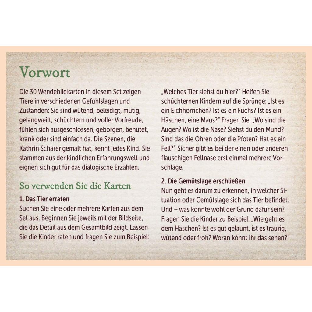 30 tierische Wendebildkarten zu Gefühlen und Empfindungen. Stimmungen benennen und den Umgang mit Emotionen in Alltagssituationen erlernen. Impulskarten ab 3 Jahre