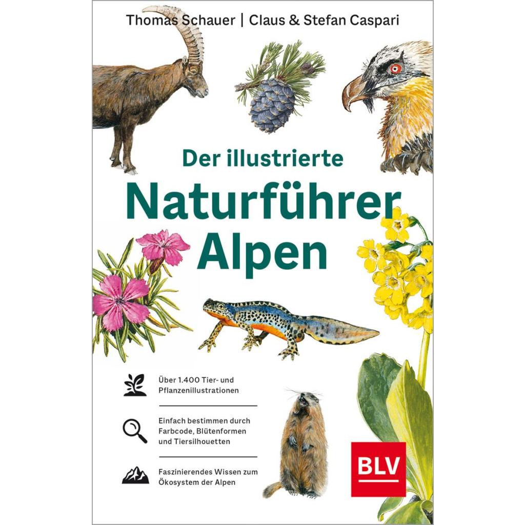 Faszination Lebensraum Alpen Über 1.200 Pflanzen- und rund 250 Tierarten und jede Menge Zusatzwissen rund um das außergewöhnliche Ökosystem Alpen. Entdecken Sie die vielfältige Flora und Fauna der Bergwelt Deutschlands, Südtirols, Österreichs und der Schweiz mit den zwei ausgewiesenen Experten auf dem Gebiet der Naturführer. Enzigartig detaillierte, per Hand angefertigte Illustrationen machen diesen Naturführer zu einem ganz besonderen Begleiter. Stefan Caspari und Thomas Schauer verbindet seit Jahrzehnten die Leidenschaft für die Pflanzen- und Tierwelt. Eine ganz besondere Beziehung haben die beiden Autoren zum Alpenraum. In ihrem neuesten Buch teilen Sie ihren einzigartigen Wissensschatz übersichtlich, leicht verständlich und definitiv rucksacktauglich. Das Bestimmsystem mittels Farbe, Blütenform oder Tiersilhouette ermöglicht es auch Laien, typische Arten der Alpen treffsicher und schnell zu erkennen. Die exakten und übersichtlichen Pflanzen- und Tierbeschreibungen zeigen Wissenswertes rund um Vorkommen, Lebensraum und Verbreitung auf einen Blick. Zusätzlich erwartet Sie faszinierendes und hoch aktuelles Wissen über das Ökosystem Alpen, seine verschiedenen Lebensbereiche, die Überlebensstrategien und Lebensweisen pflanzlicher und tierischer Bewohner, die Entwicklung und den Schutz der Natur der Berge: Lernen Sie, wie sich der Gletscherfloh im ewigen Eis vor Frost schützt und wie ihn der Klimawandel ins Schwitzen bringt, erleben Sie die Rückkehr der Gänsegeier oder erfahren Sie, warum alpines Steinbock-Kidnapping eine lange Tradition hat. Ein Muss für Berg- und Naturliebhaber, Familien, Wanderer und Bergsportler, das Lust macht, die Bergwelt mit geschärftem Blick neu zu entdecken.