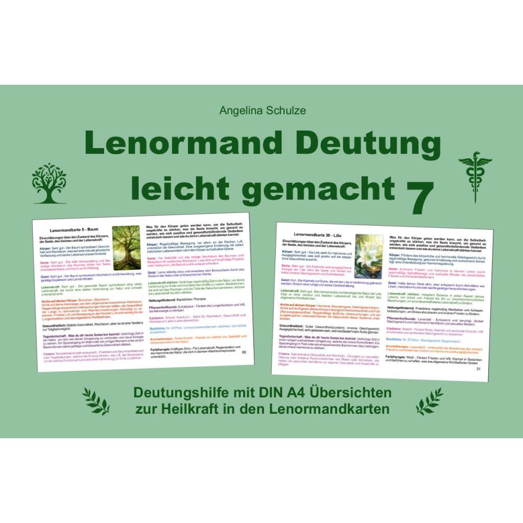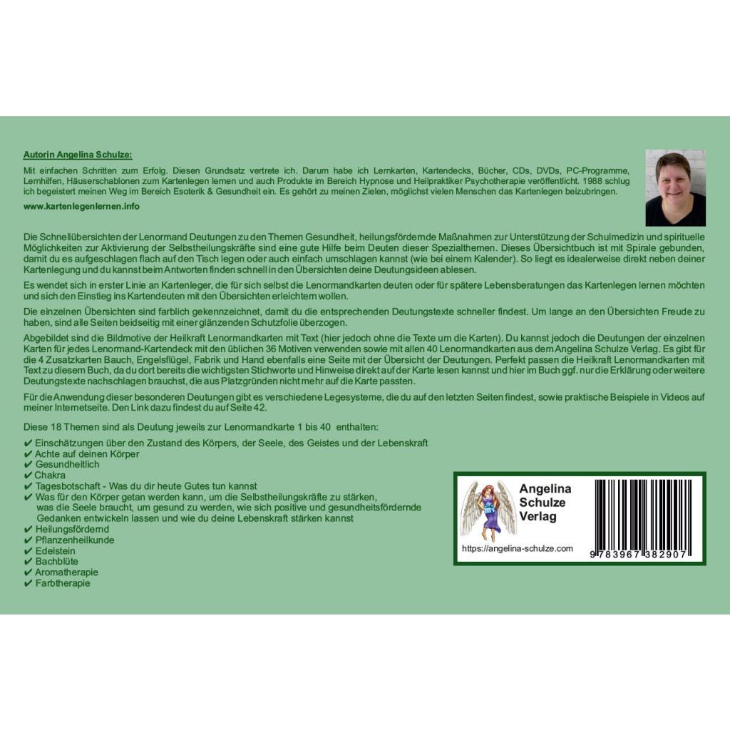 Lenormand Deutung leicht gemacht 7: Deutungshilfe mit DIN A4 Übersichten zur Heilkraft in den Lenormandkarten * Buch im Farbdruck und DIN A4 Format (21 cm x 29,7 cm). * Glänzende Laminierung (Schutzschicht) auf allen Seiten. * In Spirale gebunden, damit es flach auf dem Tisch liegen bleibt. Die Schnellübersichten der Lenormand Deutungen zu den Themen Gesundheit, heilungsfördernde Maßnahmen zur Unterstützung der Schulmedizin und spirituelle Möglichkeiten zur Aktivierung der Selbstheilungskräfte sind eine gute Hilfe beim Deuten dieser Spezialthemen. Dieses Übersichtbuch ist mit Spirale gebunden, damit du es aufgeschlagen flach auf den Tisch legen oder auch einfach umschlagen kannst (wie bei einem Kalender). So liegt es idealerweise direkt neben deiner Kartenlegung und du kannst beim Antworten finden schnell in den Übersichten deine Deutungsideen ablesen. Es wendet sich in erster Linie an Kartenleger, die für sich selbst die Lenormandkarten deuten oder für spätere Lebensberatungen das Kartenlegen lernen möchten und sich den Einstieg ins Kartendeuten mit den Übersichten erleichtern wollen. Die einzelnen Übersichten sind farblich gekennzeichnet, damit du die entsprechenden Deutungstexte schneller findest. Um lange an den Übersichten Freude zu haben, sind alle Seiten beidseitig mit einer glänzenden Schutzfolie überzogen. Abgebildet sind die Bildmotive der Heilkraft Lenormandkarten mit Text (hier jedoch ohne die Texte um die Karten). Du kannst jedoch die Deutungen der einzelnen Karten für jedes Lenormand-Kartendeck mit den üblichen 36 Motiven verwenden sowie mit allen 40 Lenormandkarten aus dem Angelina Schulze Verlag. Es gibt für die 4 Zusatzkarten Bauch, Engelsflügel, Fabrik und Hand ebenfalls eine Seite mit der Übersicht der Deutungen. Perfekt passen die Heilkraft Lenormandkarten mit Text zu diesem Buch, da du dort bereits die wichtigsten Stichworte und Hinweise direkt auf der Karte lesen kannst und hier im Buch ggf. nur die Erklärung oder weitere Deutungstexte nachschlagen brauchst, die aus Platzgründen nicht mehr auf die Karte passten. Für die Anwendung dieser besonderen Deutungen gibt es verschiedene Legesysteme, die du auf den letzten Seiten findest, sowie praktische Beispiele in Videos auf meiner Internetseite. Den Link dazu findest du auf Seite 42. Diese 18 Themen sind als Deutung jeweils zur Lenormandkarte 1 bis 40 enthalten: ¿ Einschätzungen über den Zustand des Körpers, der Seele, des Geistes und der Lebenskraft ¿ Achte auf deinen Körper ¿ Gesundheitlich ¿ Chakra ¿ Tagesbotschaft - Was du dir heute Gutes tun kannst ¿ Was für den Körper getan werden kann, um die Selbstheilungskräfte zu stärken, was die Seele braucht, um gesund zu werden, wie sich positive und gesundheitsfördernde Gedanken entwickeln lassen und wie du deine Lebenskraft stärken kannst ¿ Heilungsfördernd ¿ Pflanzenheilkunde ¿ Edelstein ¿ Bachblüte ¿ Aromatherapie ¿ Farbtherapie