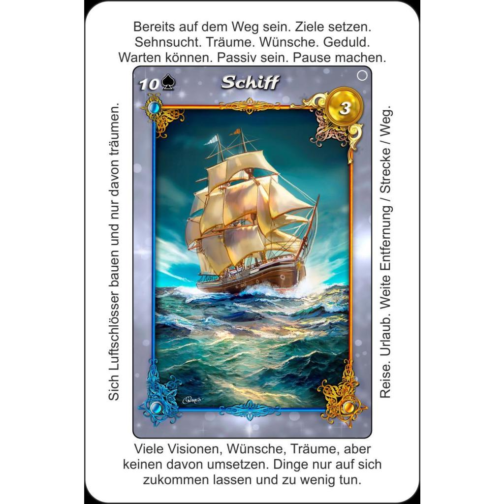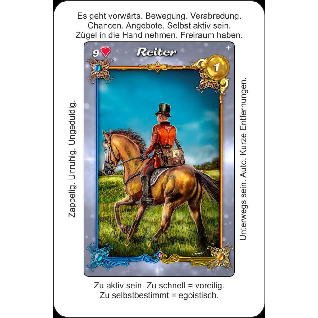 Lenormandkarten Licht und Schatten - Positive und negative Lenormand-Deutung auf jeder Karte Jetzt in der 3 aktualisierten Neuauflage mit ein paar Verbesserungen! Die 3 Auflage hat diese Eigenschaften: ¿ NEU: Gedruckt auf 400g festem Karton. ¿ Schutzschicht mit glänzendem UV- Lack. ¿ Ecken gerundet. ¿ Kartengröße 70 x 105 mm (etwas größer als Skatkarten). ¿ 36 Lenormandkarten + 4 Ergänzungskarten (Bauch, Engelsflügel, Fabrik und Hand). ¿ + 3 Tauschkarten (Fuchs, Dame und Herr noch mal mit der anderen Blickrichtung). Entscheide, ob die Person nach links oder rechts schauen soll und lege die andere Karte an die Seite. ¿ NEU: + 6 Karten mit Deutungshinweisen und Legesystemen. ¿ NEU: Oben rechts am grauen Kartenrand befindet sich eine Markierung mit Plus, Minus und einem Kreis als Symbole, so dass du bei der Lebensberatung schnell und einfach erkennen kannst, ob die Karte überwiegend positiv, negativ oder neutral zu deuten ist. Die Erklärung dazu findest du auf den zusätzlichen Beschreibungskarten. ¿ In einer türkis bedruckten Faltschachtel verpackt. MIT DEUTUNGSHILFE - Texte mit Deutung direkt auf der Karte, um leicht und schnell die Karten zu deuten und das Kartenlegen lernen. LENORMANDKARTEN - 36 übliche Karten im Licht und Schatten Design und mit 4 Ergänzungskarten für weitere Deutungsmöglichkeiten. POSITIVE und NEGATIVE DEUTUNGEN auf jeder Karte, um Themen wie Highlight, Ratschlag und Licht & Schatten leichter zu deuten. SKATKARTEN DEUTUNG möglich - Zahl oder As, D, K und B in der oberen Ecke mit bei, um auch diese Deutungen mit einbeziehen zu können. JETZT NEU mit 3 TAUSCHKARTEN (Dame, Herr und Fuchs jeweils nach links und rechts schauend). 36 Lenormandkarten + 4 Ergänzungsmotive und noch + 3 Karten zum Tauschen von Dame, Herr und Fuchs (der Fuchs läuft einmal nach links und einmal nach rechts, entscheide selbst welchen du davon im Deck nutzen möchtest). Die Dame und der Herr schauen auch einmal nach links und einmal nach rechts und die Haarfarbe ist unterschiedlich. Nimm die Karte, die dir besser gefällt. Folgende Infos = Deutungstexte befinden sich auf der Karte: Oben und rechts auf der Karte: Positive Deutung (Lichtseite der Karte) Unten und links auf der Karte: Negative Deutung (Schattenseite der Karte). Jede Karte hat auch oben links in der Ecke den Hinweis auf die Skatkarte, die dieser Karte zugeordnet ist. Jetzt neu: In der rechten oberen Ecke innerhalb des grauen Kartenrahmens befindet sich das neue Symbol mit einem Kreis, einem Minus- oder einem Pluszeichen. Es zeigt an, wie die Karte hauptsächlich zu interpretieren ist. Auf den Beschreibungskarten steht mehr dazu, damit du genau weißt, wann die Karte wie zu interpretieren ist.