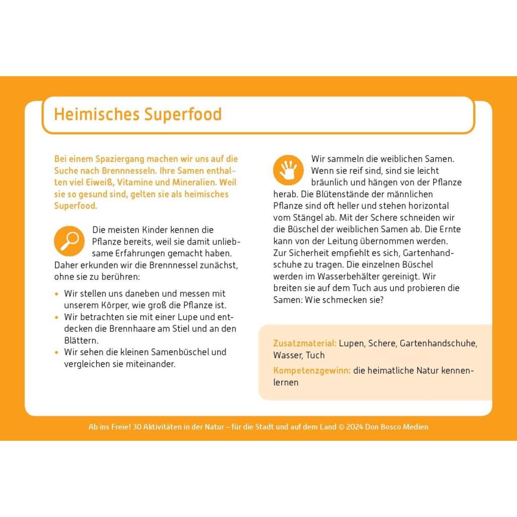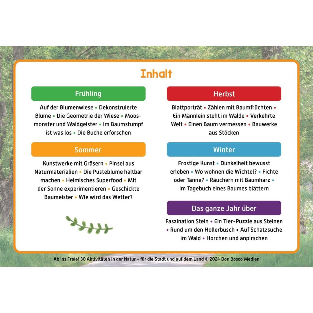 | Keyword: | aktivitäten mit kindern; bewegungsspiele; bildkarten; erlebnispädagogik spiele wald; experimente mit kindern; kräuterküche; natur entdecken mit kindern; natur erleben; naturbeobachtung; naturprojekte mit kindern; naturpädagogik; naturpädagogik spiele; spiele für draußen; tiere und pflanzen auf der wiese; umweltbewußtsein |