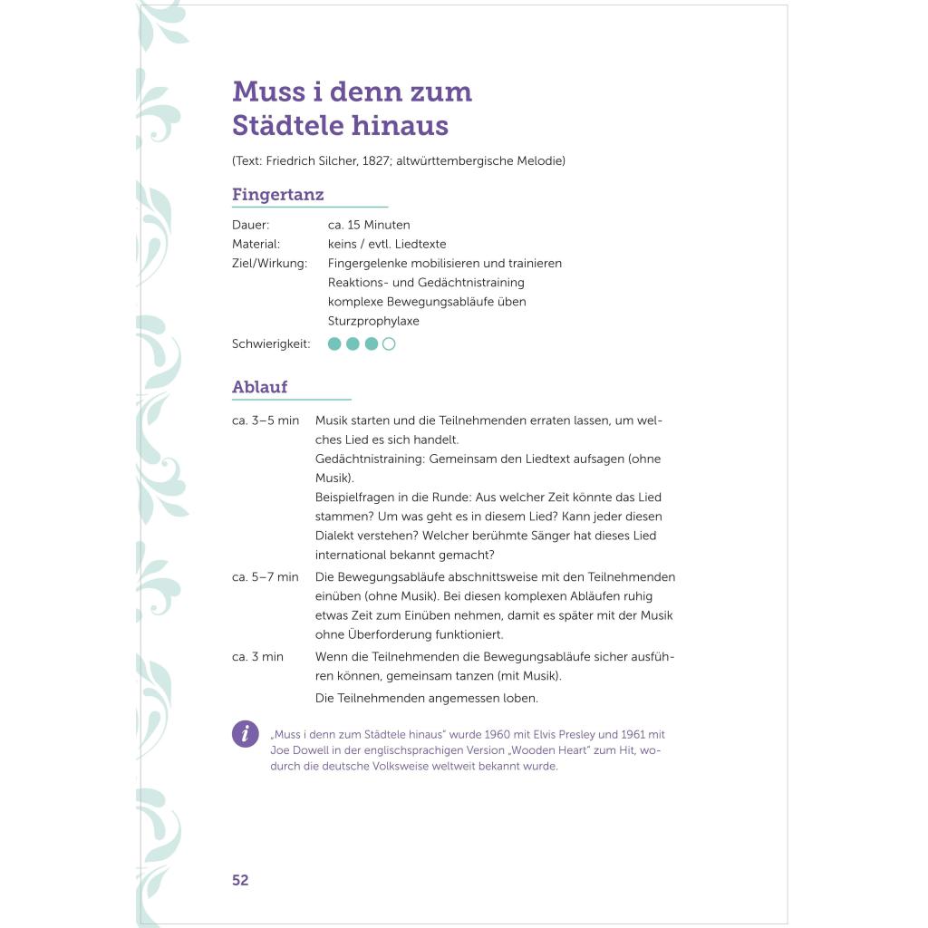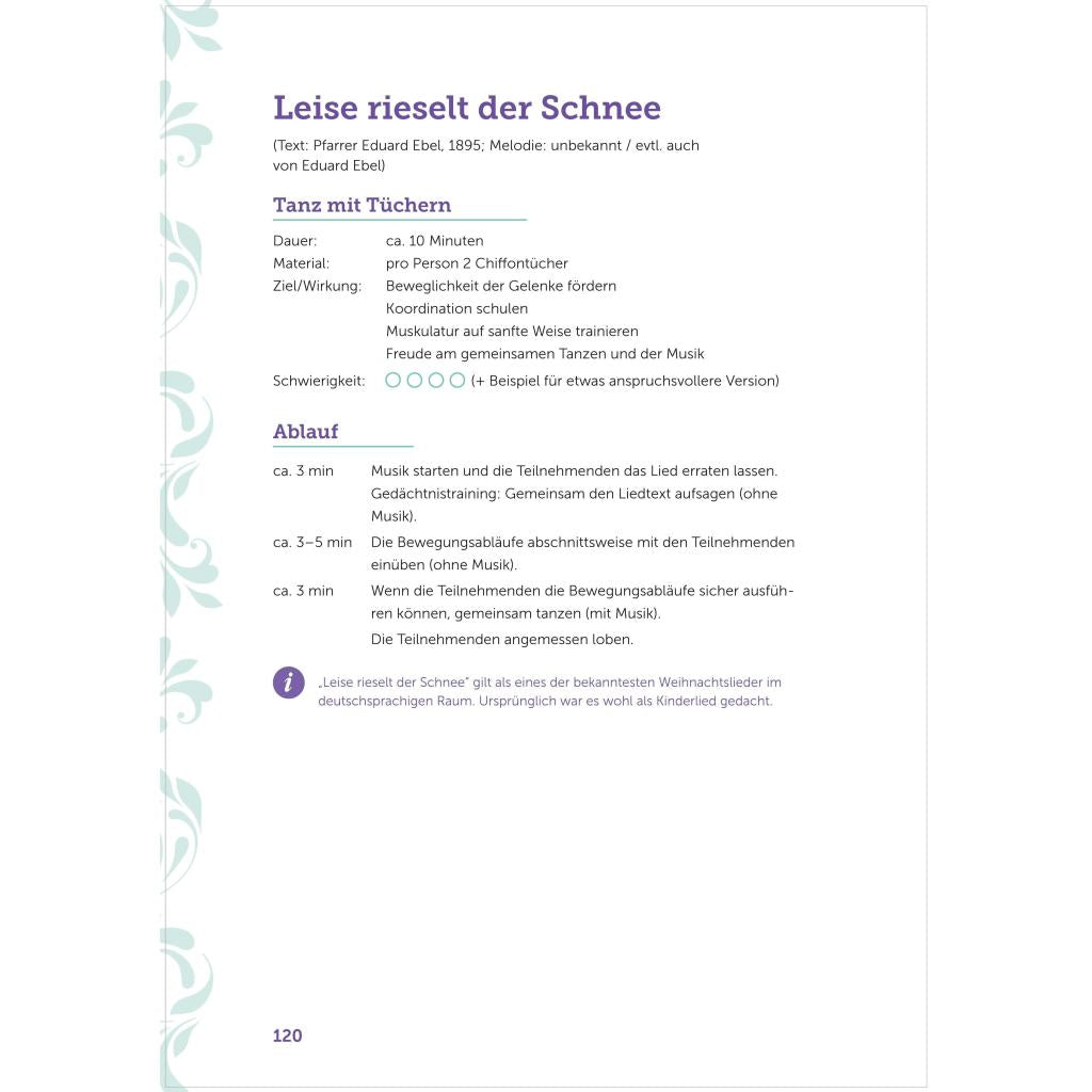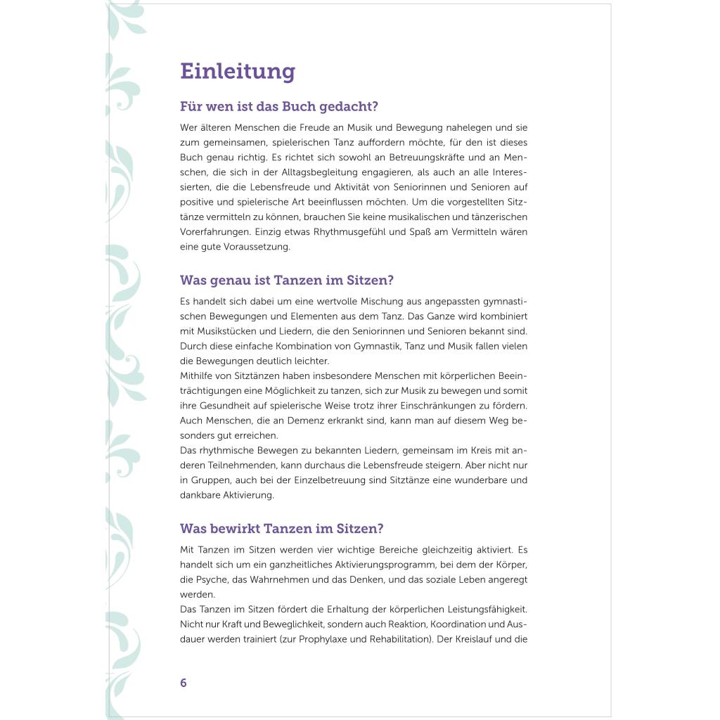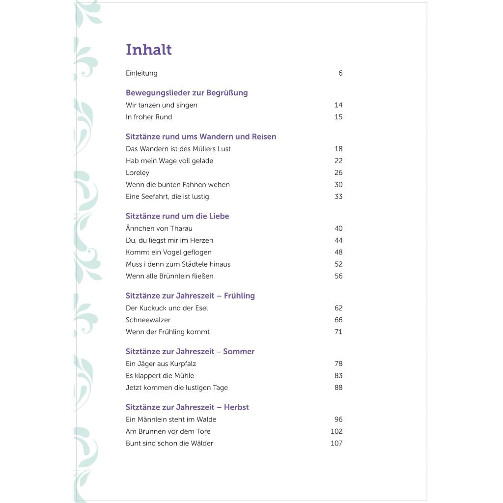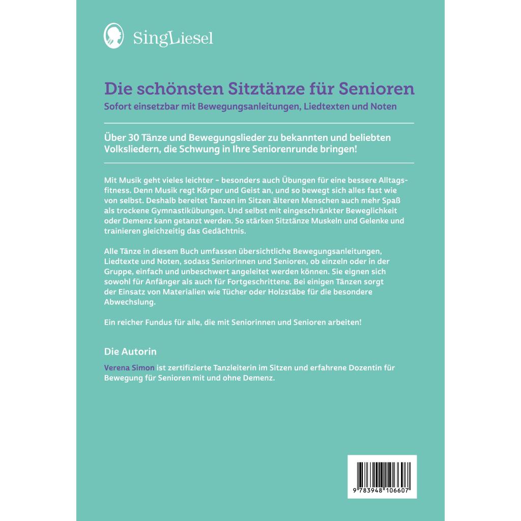 Die schönsten Sitztänze für Senioren Über 30 Tänze und Bewegungslieder zu bekannten und beliebten Volksliedern, die Schwung in Ihre Seniorenrunde bringen! Mit Musik geht vieles leichter - besonders auch Übungen für eine bessere Alltagsfitness. Denn Musik regt Körper und Geist an, und so bewegt sich alles fast wie von selbst. Deshalb bereitet Tanzen im Sitzen älteren Menschen auch mehr Spaß als trockene Gymnastikübungen. Und selbst mit eingeschränkter Beweglichkeit oder Demenz kann getanzt werden. So stärken Sitztänze Muskeln und Gelenke und trainieren gleichzeitig das Gedächtnis. Alle Tänze in diesem Buch umfassen übersichtliche Bewegungsanleitungen, Liedtexte und Noten, sodass Seniorinnen und Senioren, ob einzeln oder in der Gruppe, einfach und unbeschwert angeleitet werden können. Sie eignen sich sowohl für Anfänger als auch für Fortgeschrittene . Bei einigen Tänzen sorgt der Einsatz von Materialien wie Tücher oder Holzstäbe für die besondere Abwechslung. Ein reicher Fundus für alle, die mit Seniorinnen und Senioren arbeiten!