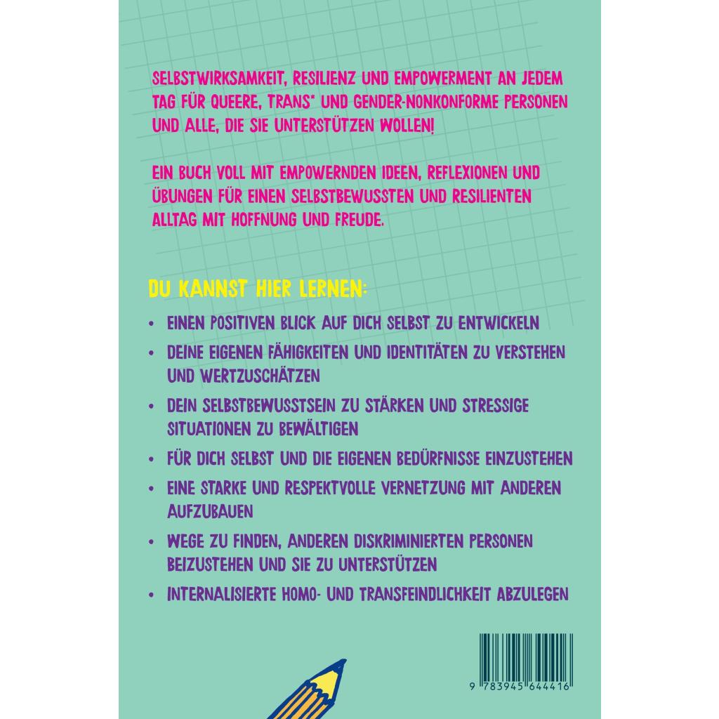 Wie können trans* und queere Menschen Selbstbewusstsein und Resilienz aufbauen in einer Welt, in der wir täglich mit Ignoranz, Ungleichheit und Diskriminierungen konfrontiert sind? Dieses Arbeitsbuch hilft dabei, internalisierte Homo- und Transfeindlichkeit abzulegen, stressige Situationen zu bewältigen und eine starke Community aufzubauen. Queere, trans* und gender-nonkonforme Personen sind mit vielen Schwierigkeiten konfrontiert: verinnerlichte Diskriminierungen, Ablehnung durch die Herkunftsfamilie, Benachteiligung im Gesundheitssystem, im Beruf und bei der Wohnungssuche, Bedrohungen und Angriffe in der Öffentlichkeit. All dies kann zu überwältigenden Ängsten und Gefühlen der Hoffnungslosigkeit und Ohnmacht führen. Mit zahlreichen Übungen und Anregungen macht dieses Übungsbuch Lust darauf, wichtige Aspekte von Resilienz zu lernen: Einen positiven Blick auf sich selbst und die eigenen Fähigkeiten und Identitäten zu kultivieren; das Selbstbewusstsein zu stärken; für sich selbst und die eigenen Bedürfnisse einzustehen; Hoffnung und Wachstum aus sich selbst zu schöpfen; und die Kraft zu finden, anderen diskriminierten Personen beizustehen und sie zu unterstützen.