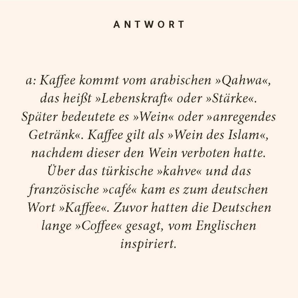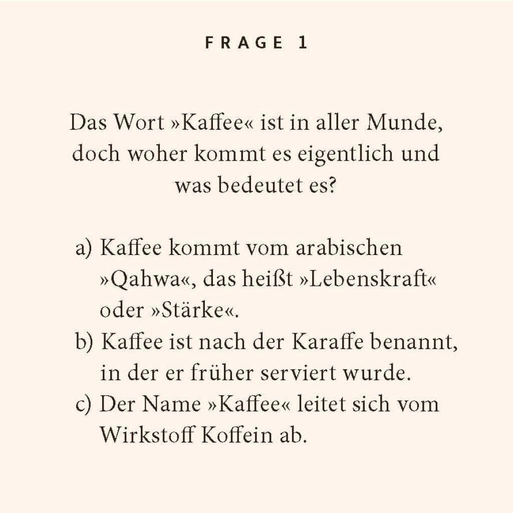 Kaffee duftet verführerisch, belebt die Sinne und bietet eine Vielzahl an Aromen. Wer hätte gedacht, dass das beliebte Heißgetränk, von dem täglich schätzungsweise 2,25 Milliarden Tassen weltweit getrunken werden, aus über 1000 verschiedenen Inhaltsstoffen besteht? Das Quiz begibt sich auf Entdeckungsreise durch die faszinierende Welt der Kaffeekultur und erkundet Sorten, Anbaugebiete, Ernte, Röstung und Zubereitungsarten. Ein perfektes Geschenk für Koffeinjunkies und Baristas! Stilvoll, elegant und immer eine gute Idee: Die Reihe "Quiz im Quadrat" präsentiert sich in modernem Design und sorgt für unterhaltsamen Rätselspaß - verpackt in einer edlen Geschenkbox. Perfekt als besondere 'Grußkarte' mit Mehrwert - zum Verschenken oder Selberfreuen!