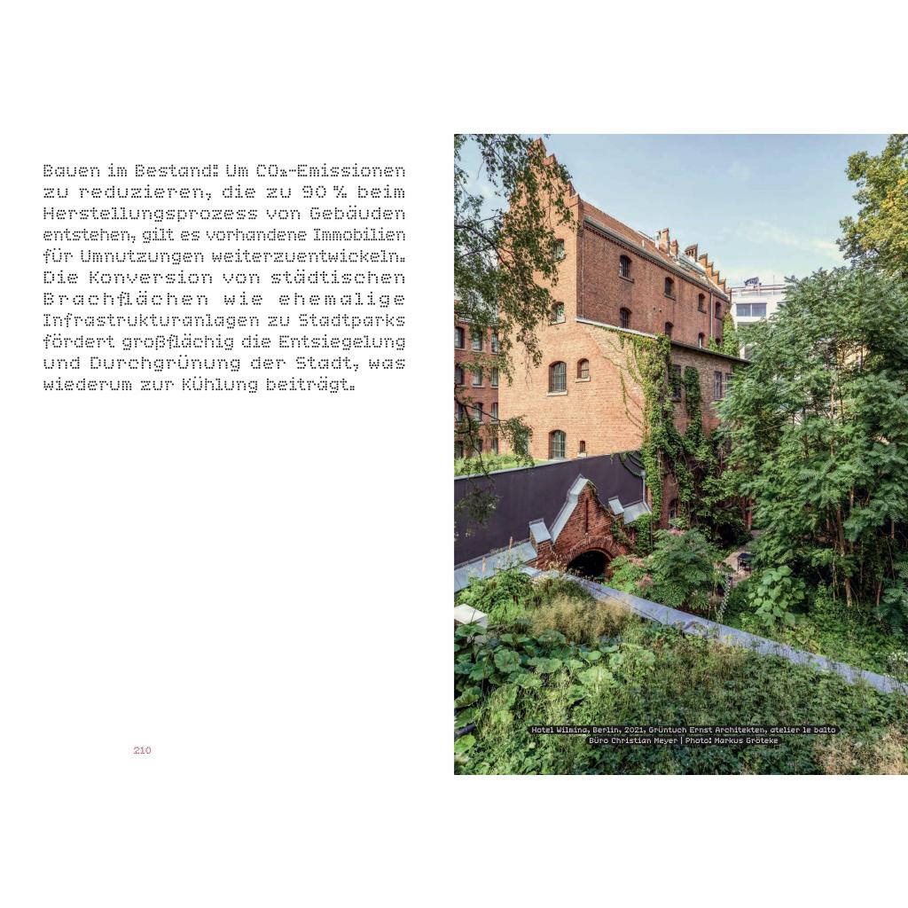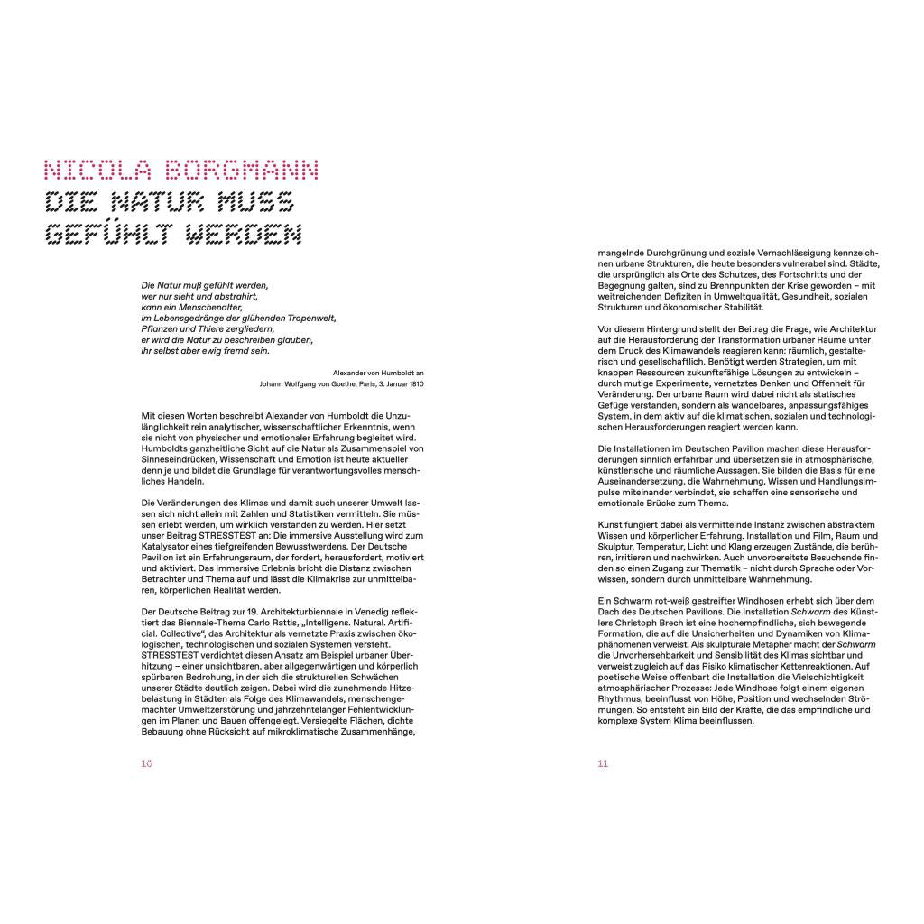Einen kühlen Kopf bewahren Die unaufhaltbare Realität des Klimawandels und die Unzulänglichkeit der bisher ergriffenen Maßnahmen werden uns täglich deutlich vor Augen geführt. Die U¿berhitzung urbaner Gebiete hat bereits heute lebensbedrohliche Auswirkungen und wird zukünftig Temperaturen erreichen, die weit über politisch abgesteckte Klimaziele hinausgehen. Wie werden Mensch und Tier, Pflanzen und Infrastrukturen diesen rapide voranschreitenden Entwicklungen standhalten? Ohne effektive Gegenmaßnahmen werden einige Städte auch in Europa in wenigen Jahrzehnten unbewohnbar sein. Trotz dieser offensichtlichen Bedrohung wird eine klimaangepasste Stadtplanung weiterhin nicht mit der gebotenen Priorität behandelt. Der deutsche Beitrag der diesjährigen Architekturbiennale von Venedig setzt die Besucher*innen der Realität des künftigen Stadtklimas physisch und psychisch aus: ein STRESSTEST, der die Notwendigkeit zu handeln, unmittelbar erfahrbar macht. Gleichzeitig werden Impulse und Lösungen für eine resiliente Planung geboten, die unsere Städte zukunftsfähig machen, um einen gesunden Lebensraum für alle lebenden Organismen zu schaffen. So ist der deutsche Beitrag ein dringender Appell zu handeln, um diesen STRESSTEST gemeinsam zu bewältigen. Der Katalog für den deutschen Pavillon enthält Essays von u. a. Luisa Amann, Maria Auböck, bauchplan ).(, Silvia C. Benedito, Carsten Dierkes, Almut Grüntuch-Ernst, Andreas Kipar, Klaus K. Loenhart, Bernhard Maaz, Andreas Matzarakis, Burkert Pieske und Boris Schröder-Esselbach. Keeping a Cool Head Climate change is an unstoppable reality and the measures that have been taken so far are clearly inadequate: that much is now brought home to us on a daily basis. The overheating of urban areas already has life-threatening consequences today and is set to reach temperatures far in excess of the climate goals defined by political decisionmakers. How will humans and animals, plants and infrastructures stand up to these rapidly progressing developments? Absent more effective countermeasures, some cities in Europe will be uninhabitable within a few decades. Despite this obvious threat, climate-adapted urban planning is still not being given the priority it deserves. The German contribution for the 19th Venice Architecture Biennale 2025 exposes visitors physically and psychologically to the reality of the future urban climate: a STRESSTEST that makes the need to act directly tangible. At the same time, the exhibition and catalogue offer impulses and solutions for resilient planning that make our cities fit for the future to create a healthy living space for all living organisms. The German contribution is therefore an urgent appeal to act in order to overcome this STRESSTEST together. The catalogue for the German Pavilion expands the exhibition with essays by Luisa Amann, Maria Auböck, bauchplan ).(, Silvia C. Benedito, Carsten Dierkes, Almut Grüntuch-Ernst, Andreas Kipar, Klaus K. Loenhart, Bernhard Maaz, Andreas Matzarakis, Burkert Pieske, and Boris Schröder-Esselbach.